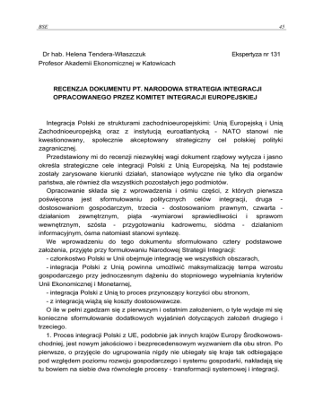 BSE 45 Dr hab. Helena Tendera-Właszczuk Ekspertyza nr 131 Profesor Akademii Ekonomicznej w Katowicach RECENZJA DOKUMENTU PT. NARODOWA STRATEGIA INTEGRACJI OPRACOWANEGO PRZEZ KOMITET INTEGRACJI EUROPEJSKIEJ Integracja Polski ze strukturami zachodnioeuropejskimi: Unią Europejską i Unią Zachodnioeuropejską oraz z instytucją euroatlantycką - NATO stanowi nie kwestionowany, społecznie akceptowany strategiczny cel polskiej polityki zagranicznej. Przedstawiony mi do recenzji niezwykłej wagi dokument rządowy wytycza i jasno określa strategiczne cele integracji Polski z Unią Europejską. Na tej podstawie zostały zarysowane kierunki działań, stanowiące wytyczne nie tylko dla organów państwa, ale również dla wszystkich pozostałych jego podmiotów. Opracowanie składa się z wprowadzenia i ośmiu części, z których pierwsza poświęcona jest sformułowaniu politycznych celów integracji, druga dostosowaniom gospodarczym, trzecia - dostosowaniom prawnym, czwarta działaniom zewnętrznym, piąta -wymiarowi sprawiedliwości i sprawom wewnętrznym, szósta - przygotowaniu kadrowemu, siódma - działaniom informacyjnym, ósma natomiast stanowi syntezę. We wprowadzeniu do tego dokumentu sformułowano cztery podstawowe założenia, przyjęte przy formułowaniu Narodowej Strategii Integracji: - członkostwo Polski w Unii obejmuje integrację we wszystkich obszarach, - integracja Polski z Unią powinna umożliwić maksymalizację tempa wzrostu gospodarczego przy jednoczesnym dążeniu do stopniowego wypełniania kryteriów Unii Ekonomicznej i Monetarnej, - integracja Polski z Unią to proces przynoszący korzyści obu stronom, - z integracją wiążą się koszty dostosowawcze. O ile w pełni zgadzam się z pierwszym i ostatnim założeniem, o tyle wydaje mi się konieczne sformułowanie dodatkowych wyjaśnień dotyczących założeń drugiego i trzeciego. 1. Proces integracji Polski z UE, podobnie jak innych krajów Europy Środkowowschodniej, jest nowym jakościowo i bezprecedensowym wyzwaniem dla obu stron. Po pierwsze, o przyjęcie do ugrupowania nigdy nie ubiegały się kraje tak odbiegające pod względem poziomu rozwoju gospodarczego i systemu gospodarki, nakładają się tu bowiem na siebie dwa równoległe procesy - transformacji systemowej i integracji. 46 BSE 2. Koszty są związane z oboma procesami, a odrębne ich oszacowanie nie jest możliwe (o czym jest mowa w dalszej części opracowania). Integracja nie jest sposobem dającym możliwość maksymalizowania tempa wzrostu gospodarczego. Prawdą jest, (o czym mowa w NSI), iż integracja umożliwia swobodny dostęp do czynników produkcji Unii Europejskiej i pozwala ominąć bariery rozwoju o charakterze naturalnym, jednak, jak dowiodły przykłady innych krajów o niskim poziomie rozwoju gospodarczego, konieczność otwarcia własnego rynku na produkty o znacznie wyższej konkurencyjności powoduje konieczność rezygnacji z produkcji mniej efektywnej. Ze względu na brak jednoznacznych ocen konkurencyjności polskiej gospodarki w poszczególnych dziedzinach, nie można formułować założenia drugiego w takiej formie. Mimo, iż przeprowadzono liczne badania naukowe na ten temat, autorzy formułują rozbieżne wnioski. Jest więc przedsięwzięciem priorytetowym powołanie grupy ekspertów, którzy ocenią stan polskiej gospodarki w zakresie jej konkurencyjności. Może się bowiem zdarzyć, iż integracja z UE spowoduje drastyczne obniżenie tempa wzrostu gospodarczego w pierwszym okresie, do momentu kiedy inwestycje zagraniczne nie zniwelują tego procesu. Zależy to jednak od tempa napływu kapitału zagranicznego, kierunków jego alokacji i konkurencyjności Polski jako rynku lokaty kapitału w stosunku do innych krajów Europy Środkowowschodniej. 3. Pozycja kraju nowowstępującego w ugrupowaniu integracyjnym zależy od kondycji gospodarczej danego kraju i dlatego najważniejsza jest szybka jej poprawa. Szybkie postępy w restrukturyzacji polskiej gospodarki są podstawowym warunkiem uzyskania korzystnych warunków akcesji podczas negocjacji. Decyzja o poszerzeniu Unii na wschód ma niewątpliwie charakter polityczny, jednak czynniki o charakterze ekonomicznym będą stanowiły podstawę do negocjacji. W Polsce najważniejszym celem strategicznym gospodarki jest zapewnienie trwałego przyspieszenia wzrostu. 4. Uważam, iż należy zachować najdalej idącą ostrożność przy podejmowaniu decyzji o włączeniu Polski do unii walutowej. Kryteria konwergencji sformułowane w Maastricht mogą stanowić wytyczną dla polityków gospodarczych, jednak fakt, iż system rynkowy w Polsce nie osiągnął na razie pełnej dojrzałości, skłania mnie do wniosku, iż nie należy zakładać pełnej ich realizacji w okresie najbliższych lat. Oczywiście hamowanie inflacji, czego konsekwencją jest obniżka długookresowych stóp procentowych, czy ograniczanie deficytu budżetowego i długu publicznego i muszą pozostać ważnym celem polityki gospodarczej, jednak dochodzenie do kryteriów konwergencji w celu włączenia Polski do unii walutowej, uważam na obecnym poziomie rozwoju systemowego i gospodarczego Polski za przedwczesne. Wielu światowej rangi ekonomistów ostrzega, iż udział w unii walutowej grozi kryzysem gospodarczym w Europie. 5. Prawdą jest, jak to zostało sformułowane w założeniu trzecim NSI, iż integracja może przynieść korzyści obu stronom, nawet w przypadku przewagi jednego z partnerów we wszystkich dziedzinach, pod tym jednak warunkiem, iż kraj ekonomicznie BSE 47 słabszy będzie się specjalizował w produkcji dóbr i usług, w wytwarzaniu których różnice w kosztach komparatywnych są najmniejsze. Dlatego też najważniejszym zadaniem jest określenie tych dziedzin gospodarki, w których Polska jest konkurencyjna, bądź potencjalnie konkurencyjna i zapewnienie im ochrony w możliwie długim okresie przejściowym, który będzie przedmiotem negocjacji. W NSI sformułowano koncepcję koor