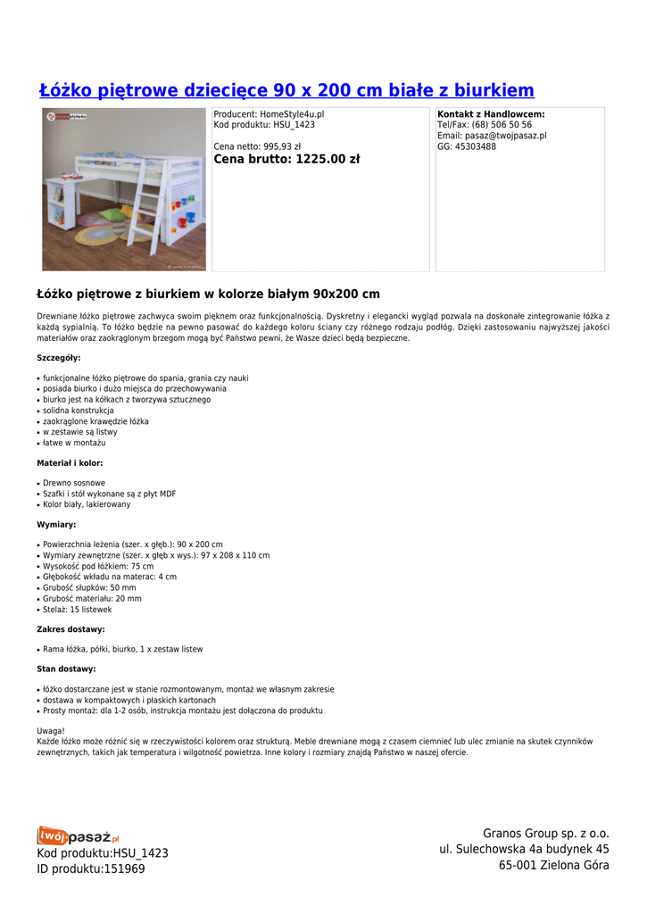 Łóżko piętrowe dziecięce 90 x 200 cm białe z biurkiem Producent: HomeStyle4u.pl Kod produktu: HSU_1423 Cena netto: 995,93 zł Kontakt z Handlowcem: Tel/Fax: (68) 506 50 56 Email: [email protected] GG: 45303488 Cena brutto: 1225.00 zł Łóżko piętrowe z biurkiem w kolorze białym 90x200 cm Drewniane łóżko piętrowe zachwyca swoim pięknem oraz funkcjonalnością. Dyskretny i elegancki wygląd pozwala na doskonałe zintegrowanie łóżka z każdą sypialnią. To łóżko będzie na pewno pasować do każdego koloru ściany czy różnego rodzaju podłóg. Dzięki zastosowaniu najwyższej jakości materiałów oraz zaokrąglonym brzegom mogą być Państwo pewni, że Wasze dzieci będą bezpieczne. Szczegóły: ● ● ● ● ● ● ● funkcjonalne łóżko piętrowe do spania, grania czy nauki posiada biurko i dużo miejsca do przechowywania biurko jest na kółkach z tworzywa sztucznego solidna konstrukcja zaokrąglone krawędzie łóżka w zestawie są listwy łatwe w montażu Materiał i kolor: ● ● ● Drewno sosnowe Szafki i stół wykonane są z płyt MDF Kolor biały, lakierowany Wymiary: ● ● ● ● ● ● ● Powierzchnia leżenia (szer. x głęb.): 90 x 200 cm Wymiary zewnętrzne (szer. x głęb x wys.): 97 x 208 x 110 cm Wysokość pod łóżkiem: 75 cm Głębokość wkładu na materac: 4 cm Grubość słupków: 50 mm Grubość materiału: 20 mm Stelaż: 15 listewek Zakres dostawy: ● Rama łóżka, półki, biurko, 1 x zestaw listew Stan dostawy: ● ● ● łóżko dostarczane jest w stanie rozmontowanym, montaż we własnym zakresie dostawa w kompaktowych i płaskich kartonach Prosty montaż: dla 1-2 osób, instrukcja montażu jest dołączona do produktu Uwaga! Każde łóżko może różnić się w rzeczywistości kolorem oraz strukturą. Meble drewniane mogą z czasem ciemnieć lub ulec zmianie na skutek czynników zewnętrznych, takich jak temperatura i wilgotność powietrza. Inne kolory i rozmiary znajdą Państwo w naszej ofercie. Kod produktu:HSU_1423 ID produktu:151969 Granos Group sp. z o.o. ul. Sulechowska 4a budynek 45 65-001 Zielona Góra