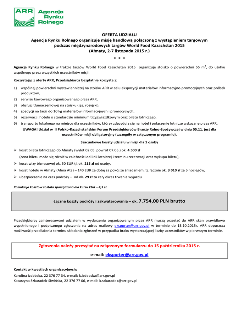 OFERTA UDZIAŁU Agencja Rynku Rolnego organizuje misję handlową połączoną z wystąpieniem targowym podczas międzynarodowych targów World Food Kazachstan 2015 (Ałmaty, 2-7 listopada 2015 r.) * * * 2 Agencja Rynku Rolnego w trakcie targów World Food Kazachstan 2015 organizuje stoisko o powierzchni 55 m , do użytku wspólnego przez wszystkich uczestników misji. Korzystając z oferty ARR, Przedsiębiorca bezpłatnie korzysta z: 1) wspólnej powierzchni wystawienniczej na stoisku ARR w celu ekspozycji materiałów informacyjno-promocyjnych oraz próbek produktów, 2) serwisu kawowego organizowanego przez ARR, 3) obsługi tłumaczeniowej na stoisku (jęz. rosyjski), 4) spedycji na targi do 10 kg materiałów informacyjnych i promocyjnych, 5) rezerwacji: hotelu o standardzie minimum trzygwiazdkowym oraz biletu lotniczego, 6) transportu lokalnego na miejscu dla uczestników, którzy zdecydują się na hotel i połączenie lotnicze wskazane przez ARR. UWAGA! Udział w II Polsko-Kazachstaoskim Forum Przedsiębiorców Branży Rolno-Spożywczej w dniu 05.11. jest dla uczestników misji obligatoryjny (szczegóły w załączonym programie). Szacunkowe koszty udziału w misji dla 1 osoby koszt biletu lotniczego do Ałmaty (wylot 02.05. powrót 07.05.) ok. 4.500 zł (cena biletu może się różnid w zależności od linii lotniczej i terminu rezerwacji oraz wykupu biletu), koszt wizy biznesowej ok. 50 EUR tj. ok. 215 zł od osoby, koszt hotelu w Ałmaty (Ałma Ata) – 140 EUR za dobę za pokój ze śniadaniem, tj. łącznie ok. 3 010 zł za 5 noclegów, ubezpieczenie na czas podróży – od ok. 29 zł za cały okres trwania wyjazdu Kalkulacja kosztów została sporządzona dla kursu EUR – 4,3 zł. Łączne koszty podróży i zakwaterowania – ok. 7.754,00 PLN brutto Przedsiębiorcy zainteresowani udziałem w wydarzeniu organizowanym przez ARR muszą przesład do ARR skan prawidłowo wypełnionego i podpisanego zgłoszenia na adres mailowy [email protected] w terminie do 15.10.2015r. ARR dopuszcza możliwośd przedłużenia terminu składania zgłoszeo w przypadku braku wystarczającej liczby uczestników w pierwszym terminie. Zgłoszenia należy przesyład na załączonym formularzu do 15 października 2015 r. e-mail: [email protected] Kontakt w kwestiach organizacyjnych: Karolina Izdebska, 22 376 77 34, e-mail: [email protected] Katarzyna Szkaradek-Siwioska, 22 376 77 06, e-mail: [email protected]