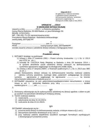 Załącznik Nr 2 do ogłoszenia o naborze wniosków o udzielenie dotacji celowej na dofinansowanie wymiany systemów ogrzewania węglowego na ekologiczne źródła ciepła w roku 2015 UMOWA Nr ……/2015 O UDZIELENIE DOTACJI CELOWEJ zawarta w dniu ………………………2015 r. w Radomiu pomiędzy: Gminą Miasta Radomia, 26-600 Radom, ul. Jana Kilińskiego 30, REGON : 670223451, NIP : 796-281-75-29, reprezentowaną przez: Prezydenta Miasta Radomia – Radosława Witkowskiego zwaną dalej „DOTUJĄCYM” a Panią/em/ ………………………… …………………………… zam. w ………………………… PESEL ……………………………………………….. , zwaną/zwanym dalej „DOTOWANYM” została zawarta umowa o udzielenie dotacji celowej o następującej treści: §1 Przedmiot umowy 1. DOTUJĄCY działając na podstawie: 1) ustawy z dnia 27 kwietnia 2001 r. Prawo ochrony środowiska ( j. t. Dz. U. 2013 poz.1232 ze zm. ), 2) uchwały Nr 720/2014 Rady Miejskiej w Radomiu z dnia 28 kwietnia 2014 r. w sprawie określenia zasad udzielania dotacji celowych na dofinansowanie systemów ogrzewania węglowego na ekologiczne źródła ciepła, 3) ustawy z dnia 27 sierpnia 2009 r. o finansach publicznych ( t. j. Dz. U. 2013 poz. 885 ze zm. ). udziela Dotowanemu dotacji celowej na dofinansowanie kosztów realizacji zadania z zakresu ochrony powietrza, zwanego dalej „zadaniem”, polegającego na zmianie systemu ogrzewania z węglowego na ogrzewanie ………………………… na terenie nieruchomości położonej w Radomiu przy ul. …………………………………………………. 2. DOTOWANY oświadcza, że jest właścicielem/współwłaścicielem nieruchomości, o której mowa w ust. 1, położonej Radomiu przy ulicy ………………………………………………., działka ewidencyjna nr ……………, ark. …………………... 3. §2 1. Dotowany zobowiązuje się do wykorzystania udzielonej mu dotacji zgodnie z celem na jaki ją uzyskał i na warunkach określonych niniejszą umową. 2. Termin realizacji zadania: 1) rozpoczęcie……………………………………… 2) zakończenie do dnia 31.10.2015r. 3) rozliczenie do dnia 15.11.2015r. §3 DOTOWANY zobowiązuje się do : 1) przeznaczenia dotacji na dofinansowanie zadania, o którym mowa w § 1 ust.1; 2) dotrzymania terminów określonych w § 2 ust. 2; 3) przy realizacji zadania dopełnienia wszelkich wymagań formalnych wynikających z obowiązujących przepisów prawa; 1 4) informowania DOTUJĄCEGO o wszelkich zmianach i okolicznościach mających wpływ na wykonanie przez Dotowanego zobowiązań wynikających z niniejszej umowy; 5) rozliczenia dotacji; 6) umieszczenia w miejscu wskazanym przez Dotującego tablicy zawierającej informację o następującej treści: „ Wymiana systemu ogrzewania węglowego na ekologiczne źródło ciepła” dofinansowane przez Wojewódzki Fundusz Ochrony Środowiska i Gospodarki Wodnej w Warszawie www.wfosigw.pl oraz Narodowy Fundusz Ochrony Środowiska i Gospodarki Wodnej w Warszawie www.nfosigw.gov.pl ”. §4 1. Dotowany upoważnia Dotującego do rozpowszechniania w dowolnej formie, w prasie, radiu, telewizji, Internecie oraz innych publikacjach adresu/siedziby Dotowanego, przedmiotu i celu, na który przyznano dotację oraz informacji o wysokości przyznanych środków. 2. Dopuszcza się przeniesienie na osobę trzecią praw i obowiązków wynikających z niniejszej umowy, za zgodą Dotującego, wyrażoną na piśmie pod rygorem nieważności. 3. Dotowany ponosi wyłączną odpowiedzialność wobec osób trzecich za szkody powstałe w związku z realizacją zadania. 4. W szczególnie uzasadnionych przypadkach dopuszcza się możliwość, za zgodą Dotującego, zmiany zakresu rzeczowego i warunków realizacji zadania pod warunkiem zachowania przez Dotowanego celu zadania zawartego we wniosku o udzielenie dotacji. W takim przypadku wysokość przyznanej kwoty dotacji, o której mowa w § 5 ust. 1, nie ulegnie zmianie. 5. Zmiana zakresu zadania, o której mowa w ust. 4, nie ma wpływu na ocenę wniosku określoną według kryteriów wyboru wniosków o udzielenie dotacji i dla swej ważności wymaga formy pisemnej w postaci aneksu. 1. 2. 3. 4. 5. 6. 7. 8. §5 Wysokość dotacji Dotujący zobowiązuje się do przekazania Dotowanemu na dofinansowanie realizacji zadania kwotę dotacji do wysokości …………………… zł (słownie: …………………… zł ). W przypadku poniesienia przez Dotowanego nakładów finansowych niższych niż kwota dotacji określona w ust. 1, wysokość dotacji wyniesie 80% poniesionych przez Dotowanego kosztów uwzględniających moc zamontowanego źródła ogrzewania i ilość zdemontowanych palenisk węglowych i udokumentowanych stosownymi fakturami lub rachunkami. Wypłata dotacji nastąpi po zrealizowaniu zadania przez Dotowanego w terminie 30 dni liczonych od dnia zaakceptowania przez Dotującego rozliczenia dotacji, o którym mowa w § 6 ust. 1 niniejszej umowy przelewem na konto Dotowanego: ……………………………………………………………………………………………………… Dotowany oświadcza, że jest posiadaczem wskazanego wyżej rachunku bankowego i zobowiązuje się do jego utrzymania nie krócej, niż do chwili dokonania ostatecznych rozliczeń z DOTUJĄCYM, wynikających z niniejszej umowy. Za dzień przekazania dotacji uważa się dzień obciążenia rachunku bankowego DOTUJĄCEGO. Osobami odpowiedzialnymi za nadzór i rozliczenie zadania są: ……………………………………………………………………………………………………… - pracownicy Wydziału Ochrony Środowiska i Rolnictwa Urzędu Miasta Radomia. DOTOWANY nie jest/jest* podatnikiem podatku VAT i z tytułu realizacji zadania nie będzie/ będzie* korzystać z prawa odliczenia podatku VAT. Dotujący jest podatnikiem podatku VAT. 2 §6 Rozliczenie dotacji 1. Po wykon