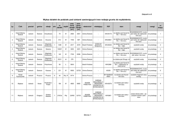 Załącznik nr.8 Wykaz działek do podziału pod ciekami zawierających inne rodzaje gruntu do wydzielenia. pow. pow. nr ewid. geod. użytki działki działki działki [m2] [m2] Lp. Ciek powiat gmina obręb ark. 1 Kanał Główny Świecki świecki Świecie Chrystkowo - 79 W 2900 2 Kanał Główny Świecki świecki Świecie Gruczno - 513 W 3 Kanał Główny Świecki świecki Świecie Głogówko Królewskie 1 1458 4 Kanał Główny Świecki świecki Świecie Świecie - 5 Kanał Główny Świecki świecki Świecie Głogówko Królewskie 6 Kanał Główny Świecki świecki Świecie Głogówko Królewskie 7 Kanał Główny Świecki świecki Świecie Przechowo 8 Kanał Główny Świecki świecki Świecie Kosowo 9 Kanał Pyszczyński świecki Pruszcz Pruszcz Nowe Pastwiska i Piaski Dragacz Wielkie Stwolno 10 11 Mątawa Mątawa świecki świecki władający KW 4651 Gmina Świecie - KW35170 ROZGRANICZYĆ, na dz. na działce jest Kanał Gł. jest rzeka ale większość do przetargu Św. i rów szcz. rów szcz. 1 1700 997 Gmina Świecie - KW29831 ROZGRANICZYĆ, na dz. na działce jest Kanał Gł. jest rzeka ale większość do przetargu Św. i rów szcz. rów szcz. 1 W 2017 2519 Skarb Państwa WZMiUW Bydgoszcz KW45030 na działce jest Kanał Gł. Św. i łąka wydzielić wodę do przetargu 2 1459/1 W 3202 3201 Gmina Świecie - - na działce jest Kanał Gł. Św. i łąka wydzielić wodę do przetargu 2 1 145 W 7700 6599 Gmina Świecie - - na działce jest Kanał Gł. ROZGRANICZYĆ, na dz. do przetargu Św. i rów szcz. jest rzeka i rów szcz. 3 1 333/1 dr 279 Gmina Świecie na działce jest Struga i dr wydzielić wodę do przetargu 4 50 Ł 5833 Skarb Państwa na działce jest Kanał Gł. Św. i odpływowy ze stacji pomp wydzielić wodę do przetargu 5 1 221 W 9000 ROZGRANICZYĆ, na dz. na działce jest Kanał Gł. jest rzeka ale większość do przetargu Św. i rów szcz. rów szcz. 6 6 44 Wp, R - 1 184 218/3a W Wp uwagi uwagi Gmina Świecie - 45029 9174 Gmina Pruszcz - BY1S/00029 459/4 na działce jest Kanał i rów szcz. 4800 8665 SKARB PAŃSTWA ZARZĄD MELIORACJI I URZADZEŃ WODNYCH W BYDGOSZCZY KW45576 na działce jest rzeka i rów szcz. wydzielić wodę do przetargu 8 32733 SKARB PAŃSTWA ZARZĄD MELIORACJI I URZADZEŃ WODNYCH W BYDGOSZCZY KW5667 na działce jest rzeka i rów szcz. prawa strona rzeki – po paręset metrów rzeki i rowu do przetargu 9 22458 32725 KW2588 stan nr mapy: właściciel Strona 1 wydzielić fragment rowu do przetargu szczeg. 7 na działce jest Struga i rów szcz. ok. 550 mb Strugi i 450 mb ROWU SZCZEGÓŁOWEGO do przetargu 10 Gmina Pruszcz BY1S/00030 731/5 na działce jest Struga i rów szcz. również rów szczegółowy, do przejęcia do przetargu 11 4674 Gmina Pruszcz BY1S/00030 694/3 na działce jest Struga i rów szcz. do przejęcia, wydzielić rów szczegółowy do przetargu 12 dr 1600 Gmina Bukowiec KW29060 na działce jest Struga i dr część działki droga gminna do przetargu 13 dr 430 Gmina Świecie BY1S/00029 na działce jest Struga i dr 831/6 gminna do wydzielenia do przetargu 14 2729 Gmina Świecie Świecie 13 Struga Graniczna świecki Pruszcz Łowin 6 18 Wp, W 3000 14 Struga Graniczna świecki Pruszcz Łowinek 5 35 Wp, W, R 15 Struga Graniczna świecki Bukowiec Tuszynki 1 124 16 Struga GrucznoLuszkówko świecki Świecie Gruczno 209/2 17 Struga GrucznoLuszkówko świecki Świecie Gruczno 209/11 R, Br, Lz 18 Struga GrucznoLuszkówko świecki Świecie Gruczno - 454 W 1010 2077 Gmina Świecie 19 Struga GrucznoLuszkówko świecki Pruszcz Parlin - 27 W 3800 2396 20 Struga GrucznoLuszkówko świecki Pruszcz Luszkówko - 97 W 5000 21 Struga GrucznoLuszkówko świecki Pruszcz Parlin - 22 W 22 Struga GrucznoLuszkówko świecki Pruszcz Wałdowo - 34 23 Struga Komórsk świecki Nowe Mały Komorsk - 24 Struga Kręgiel świecki 25 Struga Kręgiel świecki Świekatowo Jania Góra Pruszcz Serock ZARZĄD MELIORACJI I URZĄDZEŃ WODNYCH W BYDGOSZCZY 42056 świecki Wielki Konopat 12 Struga Dworzysko 1 211/2 W 2 094 9 604 SKARB PAŃSTWA KW29831 na działce jest Struga i rola do wydzielenia do przetargu 14 - KW29831 na działce jest Struga i rów szcz. wydzielić rów szczegółowy do przetargu 15 Gmina Pruszcz - KW31458 na działce jest Struga i rów szcz. wydzielić rów szczegółowy do przetargu 15 3723 Skarb Państwa WZMiUW Bydgoszcz KW46865 na działce jest Struga i rów szcz. wydzielić rów szczegółowy do przetargu 16 2400 3677 Gmina Pruszcz - KW31458 na działce jest Struga i rów szcz. wydzielić rów szczegółowy do przetargu 17 W 5200 4816 Skarb Państwa WZMiUW Bydgoszcz KW46872 na działce jest Struga i rów szcz. wydzielić rów szczegółowy do przetargu 18 705/2 W 3267 4193 GMINA NOWE - KW32314 na działce jest Struga i rów. szcz. wydzielić działkę na samą Strugę bez rowu do przetargu 19 - 80 W 800 1113 Skarb Państwa ZMiUW Bydgoszcz 46858 na działce jest Struga i rów szcz. na działce jest ok. 300 mb Strugi i ok. 100 mb ROWU SZCZEGÓŁOWEGO do przetargu 20 - 60 W 1500 1618 Skarb Państwa WZMiUW Bydgoszcz - na działce jest Struga i rów szcz. na działce jest ok. 400 mb Strugi i ok. 100 mb ROWU SZCZEGÓŁOWEGO do przetargu 20 Strona 2