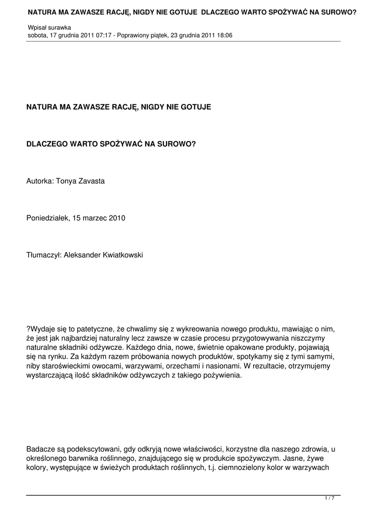 NATURA MA ZAWASZE RACJĘ, NIGDY NIE GOTUJE DLACZEGO WARTO SPOŻYWAĆ NA SUROWO? Wpisał surawka sobota, 17 grudnia 2011 07:17 - Poprawiony piątek, 23 grudnia 2011 18:06 NATURA MA ZAWASZE RACJĘ, NIGDY NIE GOTUJE DLACZEGO WARTO SPOŻYWAĆ NA SUROWO? Autorka: Tonya Zavasta Poniedziałek, 15 marzec 2010 Tłumaczył: Aleksander Kwiatkowski ?Wydaje się to patetyczne, że chwalimy się z wykreowania nowego produktu, mawiając o nim, że jest jak najbardziej naturalny lecz zawsze w czasie procesu przygotowywania niszczymy naturalne składniki odżywcze. Każdego dnia, nowe, świetnie opakowane produkty, pojawiają się na rynku. Za każdym razem próbowania nowych produktów, spotykamy się z tymi samymi, niby staroświeckimi owocami, warzywami, orzechami i nasionami. W rezultacie, otrzymujemy wystarczającą ilość składników odżywczych z takiego pożywienia. Badacze są podekscytowani, gdy odkryją nowe właściwości, korzystne dla naszego zdrowia, u określonego barwnika roślinnego, znajdującego się w produkcie spożywczym. Jasne, żywe kolory, występujące w świeżych produktach roślinnych, t.j. ciemnozielony kolor w warzywach 1/7 NATURA MA ZAWASZE RACJĘ, NIGDY NIE GOTUJE DLACZEGO WARTO SPOŻYWAĆ NA SUROWO? Wpisał surawka sobota, 17 grudnia 2011 07:17 - Poprawiony piątek, 23 grudnia 2011 18:06 liściowych, fiolety znajdujące się w jagodach, czerwienie znajdujące się w poziomkach, są oznakami, że ten produkt jest bogaty w przeciwutleniacze zwane też polifenolami. Im jaskrawszy jest kolor danego owocu lub warzywa, tym więcej zawiera składników odżywczych, składników które pomagają w zapobieganiu chorób zwyrodnieniowych. A teraz spójrzmy, co się stanie z poprzednią, oryginalną paletą tęczowych kolorów po ugotowaniu. Kolory blakną jak podstarzałe pranie. Czy to nie jest dla nas coś bardziej oczywistego: poprzez niszczenie naturalnych produktów, tracimy to coś niezbędnego dla naszego zdrowia i piękna. Mają miejsce niedobory składników odżywczych w diecie, ale nie pożywienia jako takiego. W tym kraju (USA), stajemy twarzą w twarz, z niespotykanym do tej pory, nałogiem łakomstwa. Ameryka jest okupowana przez syndrom jedzenia jak nigdzie indziej na świecie. Poprzez dodawanie zręcznych, kuszących reklam, nawołujących aby spróbować ?nowych produktów?, nasz organizm głoduje, podczas gdy my sami ciągle żujemy i przełykamy. Jak na ironię, różnorodność oraz pozwolenie sobie na zakupy artykułów spożywczych, prowadzą nas do obżarstwa a zarazem, i to w tym samym czasie, do niedokarmienia. Najlepszym sposobem aby stawić czoło tym wszystkim pokusom, jest rozwinięcie odpowiedniego nastawienia na termicznie zniszczone produkty w ogóle i zaadaptowanie witariańskiego stylu życia. // Mark Twain napisał: ?jadać jest rzeczą ludzką, trawić jest rzeczą boską?. Potrzebujemy enzymów do trawienia pożywienia. Nasz organizm również potrzebuje enzymów dla wielu innych zadań i reakcji biochemicznych jakie mają tam miejsce. Enzymy stanowią właśnie swoistą różnicę, różnicę pomiędzy życiem a śmiercią. Jedynie organizmy żywe mogą wytawarzać enzymy, ale ich możliwości do wytwarzania enzymów są ograniczone i skończone. 2/7 NATURA MA ZAWASZE RACJĘ, NIGDY NIE GOTUJE DLACZEGO WARTO SPOŻYWAĆ NA SUROWO? Wpisał surawka sobota, 17 grudnia 2011 07:17 - Poprawiony piątek, 23 grudnia 2011 18:06 Nasz organizm zawiera dwie grupy enzymów: enzymy metaboliczne, odpowiedzialne za wszelkie działania naszego organizmu, oraz enzymy trawienne, uczestniczące w procesie trawienia spożytego pożywienia. Jedynie surowe, ożywione pożywienie, postępuje zgodnie z naturalnym planem, wraz z zawartymi w nim enzymami, wspomagającymi trawienie. To właśnie enzymy są odpowiedzialne za efektywniejsze uwolnianie składników odżywczych, ze spożytego przez nas pożywienia Dr. Edward Howell napisał w swej znakomitej książce, zatytułowanej ?Enzyme Nutrition? (odżywianie enzymowe), że temperatura powyżej 48 o C (118 o F) zabija enzymy. Gdy pożywienie jest termicznie niszczone, nie nosi już w sobie enzymów, a nasz organizm jest zmuszony do nadmiernego używania własnych enzymów trawiennych. Jedynie organizmy żywe, zarówno człowiek, zwierzę lub roślina, zawierają enzymy. Nikt nie ma nic przeciwko temu, że umarły człowiek jest tym samym co żywy, tylko dlatego, że skład chemiczny ciała jest taki sam. Ponad to, nigdy nie myślimy dwa razy o stwierdzeniach, że termicznie zniszczone pożywienie jest tak samo dobre jak surowe lub nawet lepsze. Świat roślinny posiada swoistą integralność/spójność oraz ?czynnik życia?. Poprzez podejście enzymowe, zerwany owoc lub odcięta zielenina jest nadal żywa, nawet gdy zostały odcięte od odżywczego źródła. Nasiona i orzechy zaczną się rozwijać gdy dostaną się do gleby, owoce będą nadal dojrzewać, nawet po zerwaniu z drzewa (od tłumacza: to zależy w jakim wieku rozwojowym zostały zerwane] warzywa, dajmy na to marchew, cebulę lub ziemniak, po dostaniu się do gleby zaczną rosnąć, kiełkować. Enzymy są kombinacjami białek, witamin i minerałów, w ich w aktywnych formach molekularnych. Chemicy są w stanie z syntetyzować niektóre składniki odżywcze, ale nie są w stanie dać im ?tchnienia życia?. Ten ?ożywczy czynnik? nigdy nie był i najprawdopodobnie 3/7 NATURA MA ZAWASZE RACJĘ, NIGDY NIE GOTUJE DLACZEGO WARTO SPOŻYWAĆ NA SUROWO? Wpisał surawka sobota, 17 grudnia 2011 07:17 - Poprawiony piątek, 23 grudnia 2011 18:06 nigdy nie będzie odtworzony. Enzymy są szczególne. Nie mogą tolerować wysokiej temperatury, promieniowania mikrofalowego lub pasteryzacji. Termiczna obróbka kuchenna zawsze usuwa lub niszczy, to co najlepsze w pożywieniu. Termicznie zniszczone pożywienie ciągnie do grobu ponieważ jest już samo umarłe. Jedynie rodzaj ludzki stosuje wysoką temperaturę do tego co spożywa. Obecnie, ludzie stosują obróbkę termic