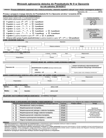 Wniosek zgłoszenia dziecka do Przedszkola Nr 8 w Opocznie na rok szkolny 2016/2017 UWAGA: Proszę dokładnie zapoznać się z treścią wniosku, staranie wypełnić rubryki oraz złożyć wymagane podpisy. Opoczno, dn. …….…………2016r. Proszę o przyjęcie mojego dziecka do Przedszkola Nr 8 w Opocznie od dnia 1 września 2016r. DEKLARUJĘ POBYT DZIECKA W PRZEDSZKOLU: Godziny bezpłatne w Przedszkolu Nr 8 w Opocznie: (wybrać opcję o wpisać znak „x” w odpowiednich kratkach, a także wpisać proponowane godziny pobytu dziecka) 11 godzin (tj. w godz. 600 – 1700) z 10 godzin (tj. w godz. 600 – 1600) z 9 godzin (tj. w godz. …00– …00) z 8 godzin (tj. w godz. …00– …00) z 00 00 7 godzin (tj. w godz. … – … ) 6 godzin (tj. w godz. …00 – …00) z z 3 posiłkami 00 3 posiłkami 3 posiłkami 3 posiłkami 3 posiłkami Godziny posiłków w Przedszkolu Nr 8 w Opocznie: 900– śniadanie; 1200- obiad 1430 podwieczorek 2 posiłkami z 2 posiłkami z 2 posiłkami 5 godzin (tj. godziny bezpłatne w godz. 8 – 1300) z 00 Dotyczy tylko grupy 5 godz popołudniowej (tj. godziny bezpłatne w godz. 1200 – 1700) z DANE OSOBOWE DZIECKA Imię 2 posiłkami Nazwisko Data urodzenia - 00 8 – 13 00 00 12 -17 3 posiłkami Miejsce urodzenia PESEL - dzień miesiąc rok ADRES ZAMELDOWANIA DZIECKA nr domu, nr lokalu Ulica Województwo Kod Miejscowość Powiat Gmina OŚWIADCZENIE WS. ADRESU ZAMELDOWANIA DZIECKA „Jestem świadoma/y odpowiedzialności Opoczno dn. …………………….. □ □ stały czasowy – od …………..……………..… do ………………..……..…….… ADRES ZAMIESZKANIA DZIECKA JEŚLI JEST INNY NIŻ ADRES ZAMELDOWANIA Ulica ………………………………………………… Czytelny podpis osoby składającej oświadczenie Kod Miejscowość Powiat DANE RODZICÓW/OPIEKUNÓW: Ojciec: Imię Nazwisko Imię nr lokalu nr domu, Województwo Matka: karnej za złożenie fałszywego oświadczenia” Zameldowanie na pobyt (zaznaczyć właściwe pole) adres e-mail Nazwisko TELEFONY NATYCHMIASTOWEGO KONTAKTU Gmina adres e-mail (nr telefonu i do kogo): OŚWIADCZENIE O SPEŁNIANIU KRYTERIÓW PODSTAWOWYCH – określających pierwszeństwo przy ubieganiu się o miejsca w Przedszkolu Nr 8 Niezaznaczenie kwadratu oznacza niespełnianie danego kryterium Wielodzietność rodziny kandydata, 1. 2. 3. 4. 5. 6. 7. UWAGA! Punktacja Podpis rodzica Uwagi 20 pkt. Niepełnosprawność kandydata, 20 pkt. Niepełnosprawność jednego z rodziców kandydata, 20 pkt. Niepełnosprawność obojga rodziców kandydata, 20 pkt. Niepełnosprawność rodzeństwa kandydata, 20 pkt. Samotne wychowywanie kandydata w rodzinie 20 pkt. Objęcie kandydata pieczą zastępczą 20 pkt. Spełnianie przynajmniej jednego z wymienionych kryteriów jest gwarancją przyjęcia dziecka do przedszkola w pierwszej kolejności − Spełnianie kryterium nr 1 dokumentuje się oświadczeniem o wielodzietności rodziny kandydata (minimum 3 dzieci w rodzinie). Wzór oświadczenia stanowi załącznik do regulaminu (do pobrania wraz z wnioskiem). − Spełnianie każdego z zaznaczonych kryteriów oznaczonych numerami 2–7 należy potwierdzić stosownymi dokumentami w formie oryginałów lub kopii poświadczonych za zgodność z oryginałem. Wzory oświadczeń i rodzaje dokumentów, a także sposób ich poświadczania określa ustawa o systemie oświaty oraz Regulamin rekrutacji opublikowany na terenie Przedszkola i na stronach BIP Urzędu Miejskiego oraz Przedszkola Nr 8 w Opocznie. − Niezłożenie wymaganych dokumentów skutkuje uznaniem danego kryterium za niespełniane. OŚWIADCZENIE O SPEŁNIANIU KRYTERIÓW DODATKOWYCH – zaznaczyć odpowiednie okienko po lewej stronie i złożyć podpis w odpowiedniej rubryce Punktacja określona w Regulaminie Niezaznaczenie kwadratu oznacza niespełnianie danego kryterium A. dziecko zgłoszone na pobyt w przedszkolu 10 godzinny 20 pkt. B. dziecko zgłoszone na pobyt w przedszkolu 9 godzinny 15 pkt. – dziecko zgłoszone na pobyt w przedszkolu 8 godzinny 10 pkt. – dziecko zgłoszone na pobyt w przedszkolu 7 godzinny 3 pkt. – dziecko zgłoszone na pobyt w przedszkolu 6 godzinny 2 pkt. – dziecko zgłoszone na pobyt w przedszkolu 5 godzinny 1 pkt. C. D. dziecko, którego rodzeństwo kontynuuje edukację w Przedszkolu Nr 8 imię i nazwisko, nazwa grupy ……………………………………………………………...………………….……………… dziecko, którego rodzeństwo jednocześnie ubiega się o przyjęcie do Przedszkola Nr 8 imiona i nazwiska rodzeństwa ……………………………………………………………………………………..………… Podpis rodzica potwierdzający kryterium PRZYZNANE PUNKTY (ustala Komisja) 4 pkt. 2 pkt. \INFORMACJA O UBIEGANIU SIĘ O MIEJSCE W INNYCH PRZEDSZKOLACH: Wpisać w kolejności preferowanych Przedszkoli 1) ………………………………………………………………………….… 2) ………………………………………………………………….………… 3) ……………………………………………………………………………. DODATKOWE INFORMACJE O DZIECKU I RODZINIE Dane dotyczące o stanu zdrowia, stosowanej diecie, rozwoju psychofizycznego dziecka wymagane do zapewnienia właściwej opieki, odżywiania, metod opiekuńczo-wychowawczych w Przedszkolu (np. alergie, ograniczenia, potrzeby specjalne itp.): ……………………………………………………………..………… ...........................................................................................................................................................................................................................…………………. ................... ........................................................................................................................................................................................