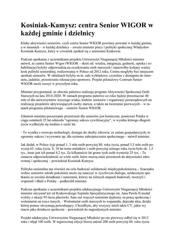 Kosiniak-Kamysz: centra Senior WIGOR w każdej gminie i dzielnicy Kluby aktywności seniorów, czyli centra Senior WIGOR powinny powstać w każdej gminie, a w miastach – w każdej dzielnicy – uważa minister pracy i polityki społecznej Władysław Kosiniak-Kamysz, który w czwartek spotkał się z seniorami Krakowie. Podczas spotkania z uczestnikami projektu Uniwersytet Niegasnącej Młodości minister mówił, że centra Senior Wigor (WIGOR – skrót od: wiedza, integracja, godność, opieka i rehabilitacja) byłyby odpowiedzią na oczekiwania osób starszych i stanowiłby kolejny ważny krok polityki senioralnej, realizowanej w Polsce od 2012 roku. Centra mogłyby być miejscem spotkań seniorów. W obiektach byłyby m.in. sale wykładowe, czytelnie z dostępem do internetu, jadalnie, przestrzenie rekreacyjno-sportowe. Projekt pilotażowy Centrum Senior WIGOR może ruszyć w przyszłym roku. Minister przypomniał, że obecnie państwo realizuje program Aktywności Społecznej Osób Starszych na lata 2014-2020. W ramach programu państwo co roku będzie przeznaczać 40 mln zł dla uniwersytetów trzeciego wieku, klubów seniorów i organizacji pozarządowych na realizację projektów aktywizujących osoby starsze, a także na tworzenie pierwszych – w ramach programu pilotażowego – centrów Senior WIGOR. Zdaniem ministra poszerzanie przestrzeni dla seniorów jest konieczne, ponieważ Polska w ciągu ostatnich 25 lat odniosła "ogromny sukces cywilizacyjny", w wyniku którego długość życia wydłużyła się średnio o sześć lat. - To wynika z rozwoju technologii, dostępu do służby zdrowia; ze zmian gospodarczych; to ogromny sukces i wyzwanie np. dla systemu zabezpieczenia społecznego – mówił minister. Jak dodał, w Polsce żyje ponad 1, 3 mln osób powyżej 80. roku życia, ponad 5,5 mln osób powyżej 65. roku życia. 8, 10 lat temu stulatków i osób powyżej setnego roku życia było ok. 1,5 tys., teraz jest ich ponad 4,2 tys. Za kilkanaście lat grono tych osób wyniesie 25 tys. - To oznacza odpowiedzialność za wiele osób, które muszą mieć przestrzeń do aktywności zdrowotnej i społecznej – powiedział Kosiniak-Kamysz. Polityka senioralna ma również na celu budować solidarność międzypokoleniową. - Szacunku wobec seniorów młode pokolenie może się nauczyć w życzliwym dialogu, serdecznym spotkaniu ze swoimi dziadkami i seniorami, którzy na różnych etapach budowali, tworzyli i wspierali i dbali o Polskę – podkreślił minister. Podczas spotkania z uczestnikami projektu edukacyjnego Uniwersytet Niegasnącej Młodości minister otrzymał też od Krakowskiego Szpitala Specjalistycznego im. Jana Pawła II medal wybity z okazji 95-lecia placówki. Sam zaś wręczył seniorom dyplomy za pracę społeczną i wolontariat na rzecz innych. - Wolontariat osób starszych to wspaniała, dojrzała idea, dzięki której pomoc otrzymują potrzebujący. Chciałbym, aby wszyscy mieli takie CV, jakie wy macie jako działacze społeczni – powiedział do nagrodzonych minister. Projekt edukacyjny Uniwersytetu Niegasnącej Młodości po raz pierwszy odbył się w 2013 roku i objął 100 osób. W tegorocznej edycji bierze udział 200 osób powyżej 60. roku życia. W ramach projektu seniorzy uczestniczą w spotkaniach – m.in. z lekarzami i wykładowcami krakowskich uczelni – podczas których poszerzają swoją wiedzę na tematy związane przede wszystkim ze zdrowiem, ale i z przyrodą, techniką, prawem. Uczestnicy mają też zapewniony bezpłatny wstęp na wydarzenia kulturalne. - To rewelacyjny program zwłaszcza dla osób, które były zaangażowane zawodowo i którym praca dawała satysfakcję. Dla takich ludzi, którzy wciąż czują się pełni energii i chcą służyć innym, przejście na emeryturę wydaje się jakimś dramatycznym kresem. Jednak emerytura i ustąpienie miejsca młodym to nieuchronna kolej rzeczy – powiedziała jedna z uczestniczek programu Magdalena Boguszewicz. Projekt Uniwersytet Niegasnącej Młodości realizuje Krakowskie Stowarzyszenie Zdrowe Serce i Płuca PULMO-COR, które działa przy Krakowskim Szpitalu Specjalistycznym im. Jana Pawła II – wiodącym partnerem projektu. - To chyba jedyny tego rodzaju projekt edukacyjny w Polsce, realizowany w oparciu o tak mocne zaangażowanie szpitala publicznego – powiedziała koordynatorka projektu Małgorzata Rygiel. Ministerstwo Pracy i Polityki Społecznej współfinansuje projekt w wysokości ponad 64 tys. zł. w ramach programu Aktywności Społecznej Osób Starszych na lata 2014-2020. (BS)