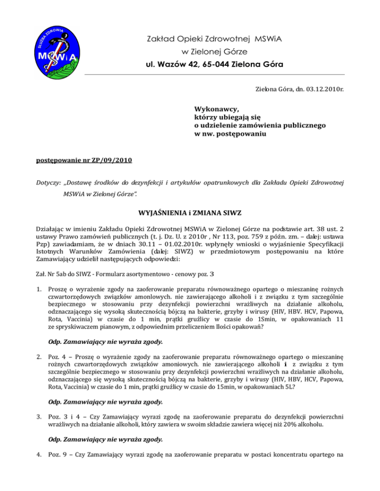Zakład Opieki Zdrowotnej MSWiA w Zielonej Górze ul. Wazów 42, 65-044 Zielona Góra Zielona Góra, dn. 03.12.2010r. Wykonawcy, którzy ubiegają się o udzielenie zamówienia publicznego w nw. postępowaniu postępowanie nr ZP/09/2010 Dotyczy: „Dostawę środków do dezynfekcji i artykułów opatrunkowych dla Zakładu Opieki Zdrowotnej MSWiA w Zielonej Górze”. WYJAŚNIENIA i ZMIANA SIWZ Działając w imieniu Zakładu Opieki Zdrowotnej MSWiA w Zielonej Górze na podstawie art. 38 ust. 2 ustawy Prawo zamówień publicznych (t. j. Dz. U. z 2010r , Nr 113, poz. 759 z późn. zm. – dalej: ustawa Pzp) zawiadamiam, że w dniach 30.11 – 01.02.2010r. wpłynęły wnioski o wyjaśnienie Specyfikacji Istotnych Warunków Zamówienia (dalej: SIWZ) w przedmiotowym postępowaniu na które Zamawiający udzielił następujących odpowiedzi: Zał. Nr 5ab do SIWZ - Formularz asortymentowo - cenowy poz. 3 1. Proszę o wyrażenie zgody na zaoferowanie preparatu równoważnego opartego o mieszaninę rożnych czwartorzędowych związków amonlowych. nie zawierającego alkoholi i z związku z tym szczególnie bezpiecznego w stosowaniu przy dezynfekcji powierzchni wrażliwych na działanie alkoholu, odznaczającego się wysoką skutecznością bójczą na bakterie, grzyby i wirusy (HIV, HBV. HCV, Papowa, Rota, Vaccinia) w czasie do 1 min, prątki gruźlicy w czasie do 1Smin, w opakowaniach 11 ze spryskiwaczem pianowym, z odpowiednim przeliczeniem Ilości opakowań? Odp. Zamawiający nie wyraża zgody. 2. Poz. 4 – Proszę o wyrażenie zgody na zaoferowanie preparatu równoważnego opartego o mieszaninę rożnych czwartorzędowych związków amoniowych. nie zawierającego alkoholi i z związku z tym szczególnie bezpiecznego w stosowaniu przy dezynfekcji powierzchni wrażliwych na działanie alkoholu, odznaczającego się wysoką skutecznością bójczą na bakterie, grzyby i wirusy (HIV, HBV, HCV, Papowa, Rota, Vaccinia) w czasie do 1 min, prątki gruźlicy w czasie do 15min, w opakowaniach 5L? Odp. Zamawiający nie wyraża zgody. 3. Poz. 3 i 4 – Czy Zamawiający wyrazi zgodę na zaoferowanie preparatu do dezynfekcji powierzchni wrażliwych na działanie alkoholi, który zawiera w swoim składzie zawiera więcej niż 20% alkoholu. Odp. Zamawiający nie wyraża zgody. 4. Poz. 9 – Czy Zamawiający wyrazi zgodę na zaoferowanie preparatu w postaci koncentratu opartego na bazie aldehydu glutarowego, przeznaczonego do dezynfekcji narzędzi i endoskopów giętkich, spektrum: B, F, Tbc, HIV, HBV, HCV, Polyoma SV40, Polio. Vaccinia, Adeno, Spory. o skuteczności mikrobiologicznej roztworu roboczego do 10 dni (również w warunkach obciążenia surowicą) w opakowaniach 5L, z odpowiednim przeliczeniem ilości opakowań? Odp. Zamawiający nie wyraża zgody. 5. Poz. 10 – Czy Zamawiający wyrazi zgodę na zaoferowanie preparatu równoważnego Kodan Tinktur Forte Bezbarwny, w opakowaniach O,25ml z atomizerem, z odpowiednim przeliczeniem Ilości opakowań? Preparat, który chcielibyśmy zaoferować na status produktu leczniczego, jest przeznaczony do odkażania i odtłuszczania skóry przed zabiegami operacyjnymi, cewnikowaniem żył, pobieraniem krwi oraz płynów ustrojowych, zastrzykami, punkcjami, biopsjami, opatrywaniem ran, zdejmowaniem szwów, autosterylny, posiada szeroką skuteczność mikrobiologiczną potwierdzoną badaniami: B (łącznie z MRSA i Tbc). F, V (HIV, HBV, HCV, HSV, Vaccinla, Adeno, Rota, Papowa SV 40). Odp. Zamawiający nie wyraża zgody. 6. Poz. 11 – Czy Zamawiający wyrazi zgodę na zaoferowanie preparatu równoważnego Kodan Tinktur Forte Bezbarwny, w opakowaniach 1L? Preparat, który chcielibyśmy zaoferować na status produktu leczniczego, jest przeznaczony do odkażania i odtłuszczania skóry przed zabiegami operacyjnymi, cewnikowaniem żył, pobieraniem krwi oraz płynów ustrojowych, zastrzykami, punkcjami, biopsjami, opatrywaniem ran, zdejmowaniem szwów, autosteryleny, posiada szeroką skuteczność mikrobiologiczną potwierdzoną badaniami: B (łącznie z MRSA i Tbc), F, V (HIV, HBV, HCV, HSV, Vaccinia, Adeno, Rota, Papowa SV 40). Odp. Zamawiający nie wyraża zgody. 7. Poz. 12 – Czy Zamawiający wyrazi zgodę na zaoferowanie preparatu r6wnowatnego Kodan Tinktur Forte Bezbarwny, w opakowaniach 1 L, z odpowiednim przeliczeniem ilości opakowań? Preparat, który chcielibyśmy zaoferować na status produktu leczniczego, jest przeznaczony do odkażania i odtłuszczania skóry przed zabiegami operacyjnymi, cewnikowaniem żył, pobieraniem krwi oraz płynów ustrojowych, zastrzykami, punkcjami, biopsjami, opatrywaniem ran, zdejmowaniem szwów, autosteryleny, posiada szeroką skuteczność mikrobiologiczną potwierdzoną badaniami: B (łącznie z MRSA i Tbc), F, V (HIV, HBV, HCV, HSV, Vaccinia, Adeno, Rota, PapOwa SV 40). Odp. Zamawiający nie wyraża zgody. 8. Poz. 13 – Czy Zamawiający wyrazi zgodę na zaoferowanie preparatu równoważnego opartego na bazie czwartorzędowych związkach amoniowych i pochodnych alkoholowych bez zawartości aldehydów o spektrum działania B, F, V (HIV, HBV, HCV, Papowa SV 40, HSV) w czasie do 15 min., w opakowaniach 5L? Odp. Zamawiający nie wyraża zgody. 9. Poz. 2, 3, 4, 9, 10, 11, 12, 13 – W razie wyrażenia zgody na zaoferowanie w/w preparatów równoważnych, czy Zamawiający wyrazi zgodę na wydzielenie tych pozycji do oddzielnego pakietu, co pozwoli na złożenie korzystnych ofert przez bezpośrednich przedstawicieli producentów, I w konsekwencji obniży wartość zamówienia? Odp. Zamawiający nie wyraża zgody. 10. Pytanie ogólne – W razie wyrażenia zgody na inne wielkości opakowań prosimy o określenie ilości opakowań, które należy wycenić. Czy wycenić ułamkową ilość opakowań, czy zaokrąglać w górę, bądź zgodnie z zasadami matematyki (do 0,5 w dół, a powyżej 0,5 w górę)? Odp. W przypadku zmiany wielkości opakowań zastosowanie ma punkt 2.1.6. SIWZ. 11. Czy Zamawiający wyrazi zgodę na wprowadzenie