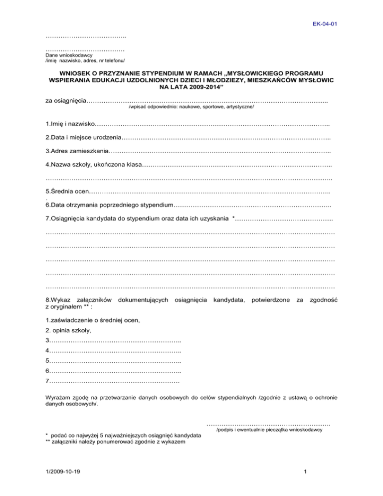 EK-04-01 ……………………………….. ………………………………. Dane wnioskodawcy /imię nazwisko, adres, nr telefonu/ WNIOSEK O PRZYZNANIE STYPENDIUM W RAMACH „MYSŁOWICKIEGO PROGRAMU WSPIERANIA EDUKACJI UZDOLNIONYCH DZIECI I MŁODZIEZY, MIESZKAŃCÓW MYSŁOWIC NA LATA 2009-2014” za osiągnięcia………………………………………………………………………………………………….. /wpisać odpowiednio: naukowe, sportowe, artystyczne/ 1.Imię i nazwisko……………………………………………………………………………………………….. 2.Data i miejsce urodzenia…………………………………………………………………………………….. 3.Adres zamieszkania………………………………………………………………………………………….. 4.Nazwa szkoły, ukończona klasa…………………………………………………………………………….. …………………………………………………………………………………………………………………….. 5.Średnia ocen………………………………………………………………………………………………….. . 6.Data otrzymania poprzedniego stypendium……………………………………………………………….. 7.Osiągnięcia kandydata do stypendium oraz data ich uzyskania *………………………………………. ……………………………………………………………………………………………………………………… ……………………………………………………………………………………………………………………… ……………………………………………………………………………………………………………………… ……………………………………………………………………………………………………………………… ……………………………………………………………………………………………………………………… 8.Wykaz załączników z oryginałem ** : dokumentujących osiągnięcia kandydata, potwierdzone za zgodność 1.zaświadczenie o średniej ocen, 2. opinia szkoły, 3…………………………………………………….. 4…………………………………………………….. 5…………………………………………………….. 6…………………………………………………….. 7……………………………………………………. WyraŜam zgodę na przetwarzanie danych osobowych do celów stypendialnych /zgodnie z ustawą o ochronie danych osobowych/. …………………………………………………. /podpis i ewentualnie pieczątka wnioskodawcy * podać co najwyŜej 5 najwaŜniejszych osiągnięć kandydata ** załączniki naleŜy ponumerować zgodnie z wykazem 1/2009-10-19 1