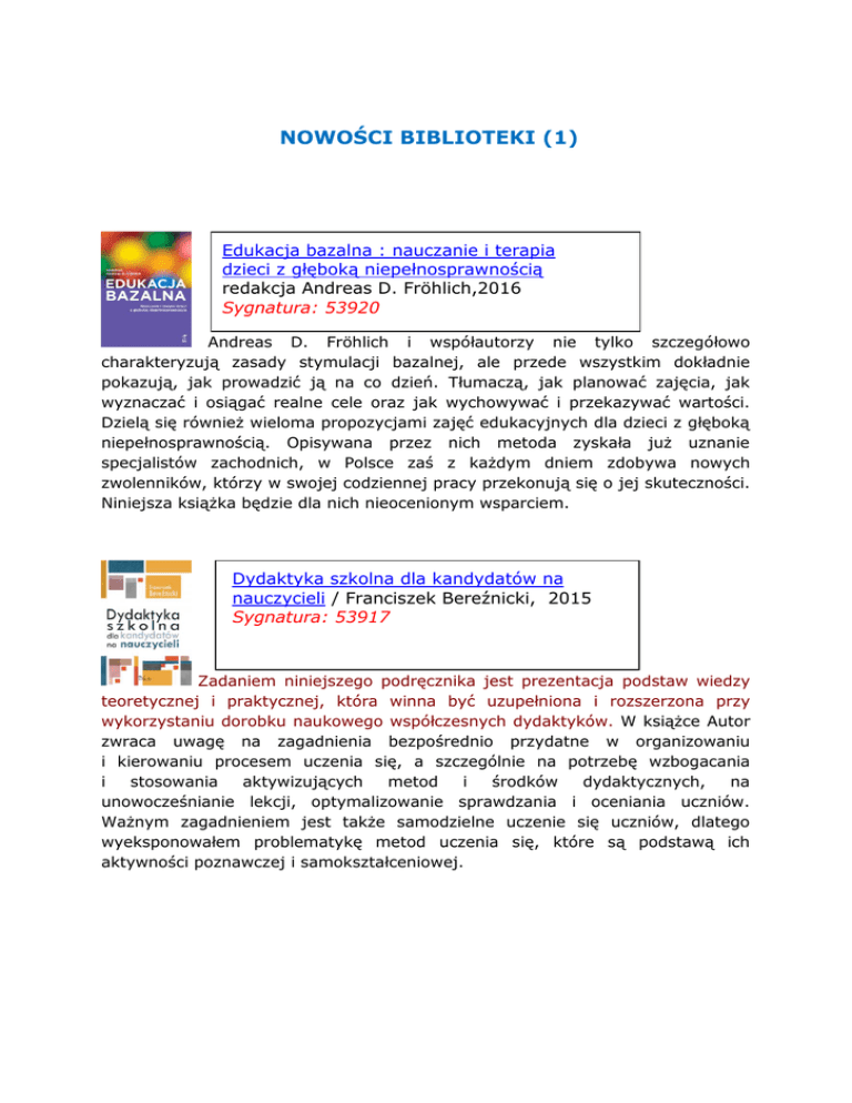 NOWOŚCI BIBLIOTEKI (1) Edukacja bazalna : nauczanie i terapia dzieci z głęboką niepełnosprawnością redakcja Andreas D. Fröhlich,2016 Sygnatura: 53920 Andreas D. Fröhlich i współautorzy nie tylko szczegółowo charakteryzują zasady stymulacji bazalnej, ale przede wszystkim dokładnie pokazują, jak prowadzić ją na co dzień. Tłumaczą, jak planować zajęcia, jak wyznaczać i osiągać realne cele oraz jak wychowywać i przekazywać wartości. Dzielą się również wieloma propozycjami zajęć edukacyjnych dla dzieci z głęboką niepełnosprawnością. Opisywana przez nich metoda zyskała już uznanie specjalistów zachodnich, w Polsce zaś z każdym dniem zdobywa nowych zwolenników, którzy w swojej codziennej pracy przekonują się o jej skuteczności. Niniejsza książka będzie dla nich nieocenionym wsparciem. Dydaktyka szkolna dla kandydatów na nauczycieli / Franciszek Bereźnicki, 2015 Sygnatura: 53917 Zadaniem niniejszego podręcznika jest prezentacja podstaw wiedzy teoretycznej i praktycznej, która winna być uzupełniona i rozszerzona przy wykorzystaniu dorobku naukowego współczesnych dydaktyków. W książce Autor zwraca uwagę na zagadnienia bezpośrednio przydatne w organizowaniu i kierowaniu procesem uczenia się, a szczególnie na potrzebę wzbogacania i stosowania aktywizujących metod i środków dydaktycznych, na unowocześnianie lekcji, optymalizowanie sprawdzania i oceniania uczniów. Ważnym zagadnieniem jest także samodzielne uczenie się uczniów, dlatego wyeksponowałem problematykę metod uczenia się, które są podstawą ich aktywności poznawczej i samokształceniowej. Uczeń (nie) biega i (nie) krzyczy : rytuały oporu jako przejaw autoekspresji młodzieży / Anna Babicka-Wirkus, 2015 Sygnatura: 53792, 53793, 53794 Książka Uczeń (nie) biega i (nie) krzyczy. Rytuały oporu jako przejaw autoekspresji młodzieży jest solidnym, erudycyjnym, akademickim oraz bardzo dobrze ugruntowanym teoretycznie i empirycznie studium na temat bierności i aktywności, zniewolenia i wolności ucznia. Odsłania szkolne mechanizmy braku czy ograniczania praw uczniów do autoekspresji. Pokazuje uczniowskie rytuały oporu, a także powoli rodzące się w codzienności szkolnej obywatelstwo, podmiotowość i odpowiedzialność młodych ludzi za zmiany dokonujące się w szkole oraz za własne wizje rozwoju i miejsca w społeczeństwie. Jest to publikacja wybiegająca w przyszłość. Ujawnia z jednej strony podstawowe słabości polskiej szkoły, a z drugiej – daje nadzieję i wskazówki na zmianę. Z recenzji dr hab. Barbary Smolińskiej-Theiss, prof. APS Wolne dzieci : jak zabawa sprawia, że dzieci są szczęśliwsze, bardziej pewne siebie i lepiej się uczą? / Peter Gray ; przełożyła z języka angielskiego Grażyna Chamielec, 2015 Sygnatura:53959 Zabawa odgrywa także wielką rolę w przyswajaniu wiedzy. Niestety, większość szkół tego nie docenia i nie wykorzystuje. Dzieci spędzają czas w ławkach, przygotowując się lub rozwiązując testy i bezwolnie wykonując polecenia nauczycieli. Pozostałą część dnia kradną im zajęcia dodatkowe i praca domowa. W życiu współczesnych dzieci jest coraz mniej wolności i coraz mniej zabawy. W efekcie mamy wiele przemęczonych, bezwolnych i często samotnych dzieci, które zupełnie straciły zapał do nauki. W przyszłości będzie im trudno uwierzyć we własną sprawczość, rozwinąć odpowiedzialność i samodzielność. Peter Gray (ur. 1946) amerykański psycholog badający procesy uczenia się u dzieci twierdzi, że dzieci przychodzą na świat z pierwotnym instynktem uczenia się i zabawy. Wystarczy stworzyć im odpowiednie warunki, a będą z pasją poszukiwały wiedzy i rozwijały nowe umiejętności. Same zbudują podwaliny pod własną odpowiedzialność i samodzielność i nauczą się kontrolować swoje życie. 12 zasad skutecznej edukacji czyli Jak uczyć, żeby nauczyć / Przemysław Bąbel, Marzena Wiśniak, 2015 Sygnatura:53424, 53425 Poradnik 12 zasad skutecznej edukacji został napisany z myślą o wszystkich nauczycielach i edukatorach, którzy chcą uczyć w taki sposób, aby ich uczniowie rzeczywiście się nauczyli. Opierając się na swojej wiedzy i na doświadczeniu zdobytym podczas prowadzenia licznych warsztatów i szkoleń, autorzy sformułowali dwanaście uniwersalnych zasad skutecznej edukacji, wspólnych dla wszystkich typów, szczebli i form kształcenia. Książka to praktyczny przewodnik pełen przykładów, wskazówek i technik do zastosowania w codziennej pracy w szkołach i innych placówkach edukacyjnych. Autorzy w zrozumiały sposób wyjaśniają znaczenie powiązań teorii z praktyką oraz omawiają między innymi takie zagadnienia, jak: grupowanie materiału, procesy koncentracji, wykorzystanie emocji w nauce, potrzeba przerw czy sposoby motywowania uczniów. Arteterapie dla dzieci i młodzieży : muzykoterapia, choreoterapia, terapia sztuką / Thomas Stegemann, Marion Hitzeler, Monica Blotevogel , 2015 Sygnatura:53907 W niniejszej publikacji kompleksowo wyjaśniono specyfikę rozmaitych metod arteterapeutycznych (muzykoterapia, terapia tańcem, terapia przez sztuki plastyczne), zamieszczono przegląd ogólnych oraz bardziej szczegółowych zaleceń terapeutycznych, a także przedstawiono terapie przez twórczość na tle najnowszych osiągnięć nauki z zakresu historii ewolucji i neurobiologii. Cennym elementem książki jest wnikliwe omówienie poszczególnych kierunków arteterapeutycznych oraz opartych na nich działań praktycznych. Budząca się szkoła / Margret Rasfeld, Stephan Breidenbach ; przełożyła Emilia Skowrońska, 2015 Sygnatura:53912 Dlaczego dzieci po przekroczeniu szkolnego progu z czasem tracą ochotę do nauki i przestają zauważać ogromne bogactwo otaczającego je świata? Dlaczego rozpoczęcie edukacji dla wielu z nich oznacza utratę spontaniczności i otwartości na współpracę? Co dzieje się z ich naturalną ciekawością 