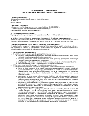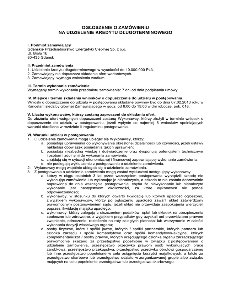 OGŁOSZENIE O ZAMÓWIENIU NA UDZIELENIE KREDYTU DŁUGOTERMINOWEGO I. Podmiot zamawiający Gdańskie Przedsiębiorstwo Energetyki Cieplnej Sp. z o.o. Ul. Biała 1b 80-435 Gdańsk II. Przedmiot zamówienia 1. Udzielenie kredytu długoterminowego w wysokości do 40.000.000 PLN. 2. Zamawiający nie dopuszcza składania ofert wariantowych. 3. Zamawiający wymaga wniesienia wadium. III. Termin wykonania zamówienia Wymagany termin wykonania przedmiotu zamówienia: 7 dni od dnia podpisania umowy. IV. Miejsce i termin składania wniosków o dopuszczenie do udziału w postępowaniu. Wnioski o dopuszczenie do udziału w postępowaniu składane powinny być do dnia 07.02.2013 roku w Kancelarii siedziby głównej Zamawiającego w godz. od 8:00 do 15:00 w dni robocze, pok. 018. V. Liczba wykonawców, którzy zostaną zaproszeni do składania ofert. Do złożenia ofert wstępnych dopuszczeni zostaną Wykonawcy, którzy złożyli w terminie wniosek o dopuszczenie do udziału w postępowaniu, jeżeli wpłynie co najmniej 5 wniosków spełniających warunki określone w rozdziale II regulaminu postępowania. VI. Warunki udziału w postępowaniu 1. O udzielenie zamówienia mogą ubiegać się Wykonawcy, którzy: a. posiadają uprawnienia do wykonywania określonej działalności lub czynności, jeżeli ustawy nakładają obowiązek posiadania takich uprawnień; b. posiadają niezbędną wiedzę i doświadczenie oraz dysponują potencjałem technicznym i osobami zdolnymi do wykonania zamówienia; c. znajdują się w sytuacji ekonomicznej i finansowej zapewniającej wykonanie zamówienia; d. nie podlegają wykluczeniu z postępowania o udzielenie zamówienia. 2. Wykonawcy mogą wspólnie ubiegać się o udzielenie zamówienia. 3. Z postępowania o udzielenie zamówienia mogą zostać wykluczeni następujący wykonawcy: a. którzy w ciągu ostatnich 3 lat przed wszczęciem postępowania wyrządzili szkodę nie wykonując zamówienia lub wykonując je nienależycie, a szkoda ta nie została dobrowolnie naprawiona do dnia wszczęcia postępowania, chyba że niewykonanie lub nienależyte wykonanie jest następstwem okoliczności, za które wykonawca nie ponosi odpowiedzialności; b. wykonawcy, w stosunku do których otwarto likwidację lub których upadłość ogłoszono, z wyjątkiem wykonawców, którzy po ogłoszeniu upadłości zawarli układ zatwierdzony prawomocnym postanowieniem sądu, jeżeli układ nie przewiduje zaspokojenia wierzycieli poprzez likwidację majątku upadłego; c. wykonawcy, którzy zalegają z uiszczeniem podatków, opłat lub składek na ubezpieczenia społeczne lub zdrowotne, z wyjątkiem przypadków gdy uzyskali oni przewidziane prawem zwolnienie, odroczenie, rozłożenie na raty zaległych płatności lub wstrzymanie w całości wykonania decyzji właściwego organu; d. osoby fizyczne, które / spółki jawne, których / spółki partnerskie, których partnera lub członka zarządu / spółki komandytowe oraz spółki komandytowo-akcyjne, których komplementariusza / osoby prawne, których urzędującego członka organu zarządzającego prawomocnie skazano za przestępstwo popełnione w związku z postępowaniem o udzielenie zamówienia, przestępstwo przeciwko prawom osób wykonujących pracę zarobkową, przestępstwo przekupstwa, przestępstwo przeciwko obrotowi gospodarczemu lub inne przestępstwo popełnione w celu osiągnięcia korzyści majątkowych, a także za przestępstwo skarbowe lub przestępstwo udziału w zorganizowanej grupie albo związku mających na celu popełnienie przestępstwa lub przestępstwa skarbowego; e. podmioty zbiorowe, wobec których sąd orzekł zakaz ubiegania się o zamówienia, na podstawie przepisów o odpowiedzialności podmiotów zbiorowych za czyny zabronione pod groźbą kary; f. wykonawców, którzy nie spełniają warunków udziału w postępowaniu, o których mowa w ust. 1 pkt a-c. 4. Z postępowania o udzielenie zamówienia mogą zostać wykluczeni również wykonawcy, którzy: a. wykonywali bezpośrednio czynności związane z przygotowaniem prowadzonego postępowania lub posługiwali się w celu sporządzenia oferty osobami uczestniczącymi w dokonywaniu tych czynności, chyba że udział tych wykonawców w postępowaniu nie utrudni uczciwej konkurencji; b. złożyli nieprawdziwe informacje mające wpływ na wynik prowadzonego postępowania; c. nie złożyli oświadczenia o spełnianiu warunków udziału w postępowaniu lub dokumentów potwierdzających spełnianie tych warunków lub złożone dokumenty zawierają błędy; d. nie wnieśli wadium, jeśli było wymagane, w tym również na przedłużony okres związania ofertą, lub nie zgodzili się na przedłużenie okresu związania ofertą. VII. Dokumenty niezbędne w celu potwierdzenia spełnienia warunków udziału w postępowaniu. Dokumenty niezbędne do dopuszczenia do udziału w postępowaniu: - zezwolenie na utworzenie banku i wykonywania czynności bankowych lub porównywalny dokument w wypadku banków z siedzibą poza terenem kraju, - aktualny odpis z właściwego rejestru albo aktualnego zaświadczenia o wpisie do ewidencji działalności gospodarczej, jeżeli odrębne przepisy wymagają wpisu do rejestru lub zgłoszenia do ewidencji działalności gospodarczej, wystawionego nie wcześniej niż 6 miesięcy przed terminem składania wniosków. - oświadczenie o spełnieniu warunków udziału w postępowaniu i niepodleganiu wykluczeniu na podstawie Regulaminu. - jeżeli wykonawcy wspólnie ubiegają się o udzielenie zamówienia, umowę regulującą współpracę wykonawców, VIII. Regulamin postępowania przy udzielaniu zamówień na kredyt długoterminowy. Regulamin postępowania przy udzielaniu zamówień na kredyt długoterminowy stanowi załącznik do niniejszego ogłoszenia.