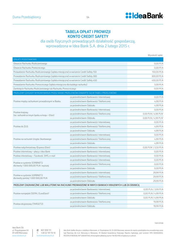 TABELA OPŁAT I PROWIZJI KONTO CREDIT SAFETY