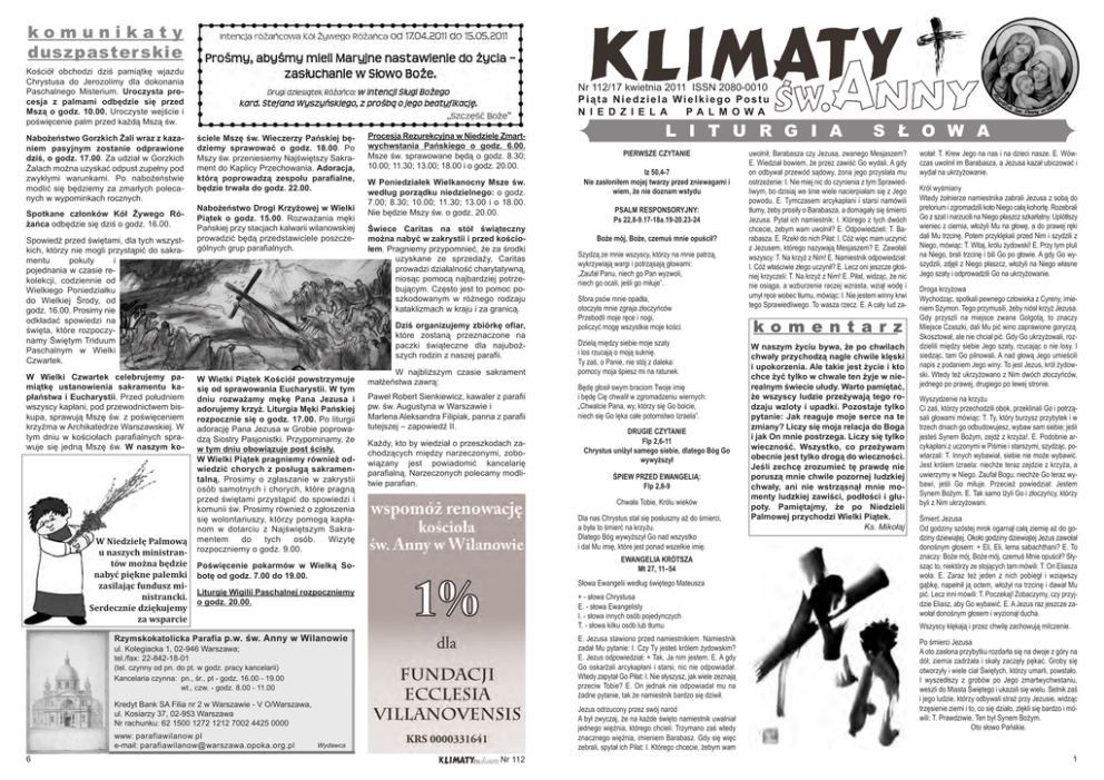 komunikaty duszpaster skie Kościół obchodzi dziś pamiątkę wjazdu Chrystusa do Jerozolimy dla dokonania Paschalnego Misterium. Uroczysta procesja z palmami odbędzie się przed Mszą o godz. 10.00. Uroczyste wejście i poświęcenie palm przed każdą Mszą św. Nabożeństwo Gorzkich Żali wraz z kazaniem pasyjnym zostanie odprawione dziś, o godz. 17.00. Za udział w Gorzkich Żalach można uzyskać odpust zupełny pod zwykłymi warunkami. Po nabożeństwie modlić się będziemy za zmarłych polecanych w wypominkach rocznych. Spotkane członków Kół Żywego Różańca odbędzie się dziś o godz. 16.00. Spowiedź przed świętami, dla tych wszystkich, którzy nie mogli przystąpić do sakramentu pokuty i pojednania w czasie rekolekcji, codziennie od Wielkiego Poniedziałku do Wielkiej Środy, od godz. 16.00. Prosimy nie odkładać spowiedzi na święta, które rozpoczynamy Świętym Triduum Paschalnym w Wielki Czwartek. W Wielki Czwartek celebrujemy pamiątkę ustanowienia sakramentu kapłaństwa i Eucharystii. Przed południem wszyscy kapłani, pod przewodnictwem biskupa, sprawują Mszę św. z poświęceniem krzyżma w Archikatedrze Warszawskiej. W tym dniu w kościołach parafialnych sprawuje się jedną Mszę św. W naszym ko- W Niedzielę Palmową u naszych ministrantów można będzie nabyć piękne palemki zasilając fundusz ministrancki. Serdecznie dziękujemy za wsparcie Nr 112/17 kwietnia 2011 ISSN 2080-0010 Piąta Niedziela Wielkiego Postu N I E D Z I E L A PA L M O WA ściele Mszę św. Wieczerzy Pańskiej będziemy sprawować o godz. 18.00. Po Mszy św. przeniesiemy Najświętszy Sakrament do Kaplicy Przechowania. Adoracja, którą poprowadzą zespołu parafialne, będzie trwała do godz. 22.00. Nabożeństwo Drogi Krzyżowej w Wielki Piątek o godz. 15.00. Rozważania męki Pańskiej przy stacjach kalwarii wilanowskiej prowadzić będą przedstawiciele poszczególnych grup parafialnych. Procesja Rezurekcyjna w Niedzielę Zmartwychwstania Pańskiego o godz. 6.00. Msze św. sprawowane będą o godz. 8.30; 10.00; 11.30; 13.00; 18.00 i o godz. 20.00. W Poniedziałek Wielkanocny Msze św. według porządku niedzielnego: o godz. 7.00; 8.30; 10.00; 11.30; 13.00 i o 18.00. Nie będzie Mszy św. o godz. 20.00. Świece Caritas na stół świąteczny można nabyć w zakrystii i przed kościołem. Pragniemy przypomnieć, że za środki uzyskane ze sprzedaży, Caritas prowadzi działalność charytatywną, niosąc pomocą najbardziej potrzebującym. Często jest to pomoc poszkodowanym w różnego rodzaju kataklizmach w kraju i za granicą. Dziś organizujemy zbiórkę ofiar, które zostaną przeznaczone na paczki świąteczne dla najuboższych rodzin z naszej parafii. W Wielki Piątek Kościół powstrzymuje się od sprawowania Eucharystii. W tym dniu rozważamy mękę Pana Jezusa i adorujemy krzyż. Liturgia Męki Pańskiej rozpocznie się o godz. 17.00. Po liturgii adorację Pana Jezusa w Grobie poprowadzą Siostry Pasjonistki. Przypominamy, że w tym dniu obowiązuje post ścisły. W Wielki Piątek pragniemy również odwiedzić chorych z posługą sakramentalną. Prosimy o zgłaszanie w zakrystii osób samotnych i chorych, które pragną przed świętami przystąpić do spowiedzi i komunii św. Prosimy również o zgłoszenia się wolontariuszy, którzy pomogą kapłanom w dotarciu z Najświętszym Sakramentem do tych osób. Wizytę rozpoczniemy o godz. 9.00. W najbliższym czasie sakrament małżeństwa zawrą: Paweł Robert Sienkiewicz, kawaler z parafii pw. św. Augustyna w Warszawie i Marlena Aleksandra Filipiak, panna z parafii tutejszej – zapowiedź II. Każdy, kto by wiedział o przeszkodach zachodzących między narzeczonymi, zobowiązany jest powiadomić kancelarię parafialną. Narzeczonych polecamy modlitwie parafian. Iz 50,4-7 Nie zasłoniłem mojej twarzy przed zniewagami i wiem, że nie doznam wstydu PSALM RESPONSORYJNY: Ps 22,8-9.17-18a.19-20.23-24 Boże mój, Boże, czemuś mnie opuścił? Szydzą ze mnie wszyscy, którzy na mnie patrzą, wykrzywiają wargi i potrząsają głowami: „Zaufał Panu, niech go Pan wyzwoli, niech go ocali, jeśli go miłuje”. Sfora psów mnie opadła, otoczyła mnie zgraja złoczyńców Przebodli moje ręce i nogi, policzyć mogę wszystkie moje kości. Dzielą między siebie moje szaty i los rzucają o moją suknię. Ty zaś, o Panie, nie stój z daleka: pomocy moja śpiesz mi na ratunek. Będę głosił swym braciom Twoje imię i będę Cię chwalił w zgromadzeniu wiernych: „Chwalcie Pana, wy, którzy się Go boicie, niech się Go lęka całe potomstwo Izraela”. DRUGIE CZYTANIE Flp 2,6-11 Chrystus uniżył samego siebie, dlatego Bóg Go wywyższył ŚPIEW PRZED EWANGELIĄ: Flp 2,8-9 Dla nas Chrystus stał się posłuszny aż do śmierci, a była to śmierć na krzyżu. Dlatego Bóg wywyższył Go nad wszystko i dal Mu imię, które jest ponad wszelkie imię. EWANGELIA KRÓTSZA Mt 27, 11–54 Słowa Ewangelii według świętego Mateusza Liturgię Wigilii Paschalnej rozpoczniemy o godz. 20.00. + - słowa Chrystusa E. - słowa Ewangelisty I. - słowa innych osób pojedynczych T. - słowa kilku osób lub tłumu Rzymskokatolicka Parafia p.w. św. Anny w Wilanowie E. Jezusa stawiono przed namiestnikiem. Namiestnik zadał Mu pytanie: I. Czy Ty jesteś królem żydowskim? E. Jezus odpowiedział: + Tak, Ja nim jestem. E. A gdy Go oskarżali arcykapłani i starsi, nic nie odpowiadał. Wtedy zapytał Go Piłat: I. Nie słyszysz, jak wiele zeznają przeciw Tobie? E. On jednak nie odpowiadał mu na żadne pytanie, tak że namiestnik bardzo się dziwił. ul. Kolegiacka 1, 02-946 Warszawa; tel./fax: 22-842-18-01 (tel. czynny od pn. do pt. w godz. pracy kancelarii) Kancelaria czynna: pn., śr., pt - godz. 16.00 - 19.00 wt., czw. - godz. 8.00 - 11.00 Kredyt Bank SA Filia nr 2 w Warszawie - V O/Warszawa, ul. Kosiarzy 37, 02-953 Warszawa Nr rachunku: 62 1500 1272 1212 7002 4425 0000 6 PIERWSZE CZYTANIE Chwała Tobie, Królu wieków Po