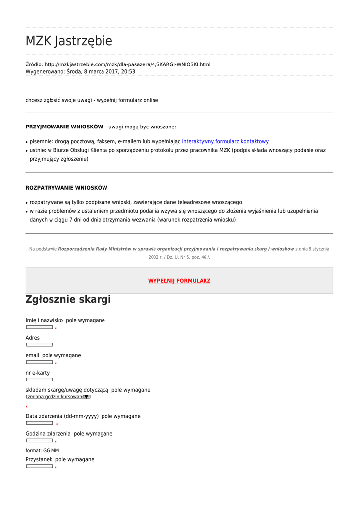 MZK Jastrzębie Źródło: http://mzkjastrzebie.com/mzk/dla-pasazera/4,SKARGI-WNIOSKI.html Wygenerowano: Środa, 8 marca 2017, 20:53 chcesz zgłosić swoje uwagi - wypełnij formularz online PRZYJMOWANIE WNIOSKÓW - uwagi mogą byc wnoszone: ● pisemnie: drogą pocztową, faksem, e-mailem lub wypełniając interaktywny formularz kontaktowy ● ustnie: w Biurze Obsługi Klienta po sporządzeniu protokołu przez pracownika MZK (podpis składa wnoszący podanie oraz przyjmujący zgłoszenie) ROZPATRYWANIE WNIOSKÓW ● rozpatrywane są tylko podpisane wnioski, zawierające dane teleadresowe wnoszącego ● w razie problemów z ustaleniem przedmiotu podania wzywa się wnoszącego do złożenia wyjaśnienia lub uzupełnienia danych w ciągu 7 dni od dnia otrzymania wezwania (warunek rozpatrzenia wniosku) Na podstawie Rozporządzenia Rady Ministrów w sprawie organizacji przyjmowania i rozpatrywania skarg / wniosków z dnia 8 stycznia 2002 r. / Dz. U. Nr 5, poz. 46 /. WYPEŁNIJ FORMULARZ Zgłosznie skargi Imię i nazwisko pole wymagane * Adres email pole wymagane * nr e-karty składam skargę/uwagę dotyczącą pole wymagane zmiana godzin kursowania▼ * Data zdarzenia (dd-mm-yyyy) pole wymagane * Godzina zdarzenia pole wymagane * format: GG:MM Przystanek pole wymagane * Nr linii pole wymagane * Nr pojazdu Kierunek Krótki opis ZDARZENIA pole wymagane * Zabezpieczenie formularza pole wymagane * Wyślij Drukuj Generuj PDF Ocena: 3.8/5 (14) Powiadom znajomego Liczba wejść: 51453 reklamacja, formularz, rozłożenie na raty, zażalenie, wniosek, skarga Wstecz
