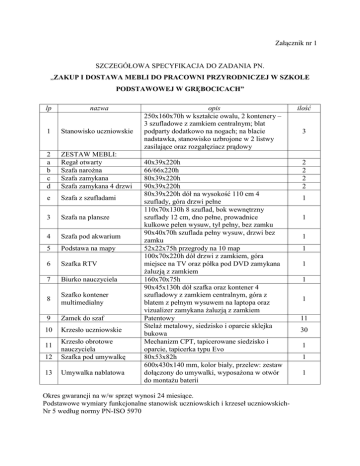 Załącznik nr 1 SZCZEGÓŁOWA SPECYFIKACJA DO ZADANIA PN. „ZAKUP I DOSTAWA MEBLI DO PRACOWNI PRZYRODNICZEJ W SZKOLE PODSTAWOWEJ W GRĘBOCICACH” lp nazwa 1 Stanowisko uczniowskie 2 a b c d ZESTAW MEBLI: Regał otwarty Szafa naroŜna Szafa zamykana Szafa zamykana 4 drzwi e Szafa z szufladami 3 Szafa na plansze 4 Szafa pod akwarium 5 Podstawa na mapy 6 Szafka RTV 7 Biurko nauczyciela 8 Szafko kontener multimedialny 9 Zamek do szaf 10 Krzesło uczniowskie 12 Krzesło obrotowe nauczyciela Szafka pod umywalkę 13 Umywalka nablatowa 11 opis 250x160x70h w kształcie owalu, 2 kontenery – 3 szufladowe z zamkiem centralnym; blat podparty dodatkowo na nogach; na blacie nadstawka, stanowisko uzbrojone w 2 listwy zasilające oraz rozgałęziacz prądowy ilość 40x39x220h 66/66x220h 80x39x220h 90x39x220h 80x39x220h dół na wysokość 110 cm 4 szuflady, góra drzwi pełne 110x70x130h 8 szuflad, bok wewnętrzny szuflady 12 cm, dno pełne, prowadnice kulkowe pełen wysuw, tył pełny, bez zamku 90x40x70h szuflada pełny wysuw, drzwi bez zamku 52x22x75h przegrody na 10 map 100x70x220h dół drzwi z zamkiem, góra miejsce na TV oraz półka pod DVD zamykana Ŝaluzją z zamkiem 160x70x75h 90x45x130h dół szafka oraz kontener 4 szufladowy z zamkiem centralnym, góra z blatem z pełnym wysuwem na laptopa oraz vizualizer zamykana Ŝaluzją z zamkiem Patentowy StelaŜ metalowy, siedzisko i oparcie sklejka bukowa Mechanizm CPT, tapicerowane siedzisko i oparcie, tapicerka typu Evo 80x53x82h 600x430x140 mm, kolor biały, przelew: zestaw dołączony do umywalki, wyposaŜona w otwór do montaŜu baterii 2 2 2 2 Okres gwarancji na w/w sprzęt wynosi 24 miesiące. Podstawowe wymiary funkcjonalne stanowisk uczniowskich i krzeseł uczniowskichNr 5 według normy PN-ISO 5970 3 1 1 1 1 1 1 1 11 30 1 1 1 1. Stanowisko uczniowskie (wyspa) – blat w kształcie owalu o wymiarach 250x160 cm wykonanych z wysokiej klasy płyty melaminowanej grubości 25 mm oklejonych obrzeŜem PCV grubości 2 mm, blat podparty na dwóch kontenerach, wykonanych z wysokiej klasy płyty melaminowanej grubości 18 mm oklejonym obrzeŜem PCV o grubości 2 mm, kontener posiada 3 szuflady (dwie o standardowej głębokości oraz jedną o głębokości powiększonej, kontener wyposaŜony w uchwyty aluminiowe w kolorze metalik o rozstawie 9 cm oraz zamek centralny, wymiary kontenera 43 cm szerokości, 60 cm głębokości oraz 65,5 cm wysokości, wykonany na cokole wysokości 8 cm, boczne części blaty podparty na nogach metalowych w kolorze metalik wysokości 65,5 cm, średnicy 50 mm. Na blacie stanowiska znajduje się nadstawka pod monitor umoŜliwiająca jednocześnie schowanie klawiatury komputera, nadstawka wyposaŜona jest w dwie listwy zasilające minimum 4 gniazdowe, listwy podłączone do rozgałęźnika sieciowego z bolcem uziemiającym wchodzącym w skład uzbrojenia stanowiska. 2. Regał otwarty o wymiarach szerokość 40 cm, głębokość 39, wysokość 220 cm, wykonany z wysokiej klasy płyty melaminowanej grubości 18 mm oraz 25 mm, wieniec górny wykonany z płyty grubości 25 mm oklejony PCV grubości 2 mm, boki, wieniec dolny, półki wykonane z płyty grubości 18 mm oklejone PCV grubości 2 mm, regulacja półek w 3 wysokościach, wysokiej klasy zawiasy puszkowe charakteryzujące się duŜą wytrzymałością, uchwyty aluminiowe w kolorze metalik o rozstawie 9 cm, szafa wyposaŜona w zamek patentowy z kompletem dwóch kluczy. 3. Szafa naroŜna o wymiarach szerokość ścian tylnych 66 cm, szerokość ścian bocznych 39 cm, wysokość 220 cm, wykonany z wysokiej klasy płyty melaminowanej grubości 18 mm oraz 25 mm, wieniec górny wykonany z płyty grubości 25 mm oklejony PCV grubości 2 mm, boki, wieniec dolny, półki wykonane z płyty grubości 18 mm oklejone PCV grubości 2 mm, regulacja półek w 3 wysokościach, wysokiej klasy zawiasy puszkowe charakteryzujące się duŜą wytrzymałością, uchwyty aluminiowe w kolorze metalik o rozstawie 9 cm, szafa wyposaŜona w zamek patentowy z kompletem dwóch kluczy. 4. Szafa 2 drzwiowa o wymiarach szerokość 80 cm, głębokość 39 cm, wysokość 220h, wykonany z wysokiej klasy płyty melaminowanej grubości 18 mm oraz 25 mm, wieniec górny wykonany z płyty grubości 25 mm oklejony PCV grubości 2 mm, boki, wieniec dolny, półki wykonane z płyty grubości 18 mm oklejone PCV grubości 2 mm, regulacja półek w 3 wysokościach, wysokiej klasy zawiasy puszkowe charakteryzujące się duŜą wytrzymałością, uchwyty aluminiowe w kolorze metalik o rozstawie 9 cm, szafa wyposaŜona w zamek patentowy z kompletem dwóch kluczy. 5. Szafa 4 drzwiowa o wymiarach szerokość 90 cm, głębokość 39 cm, wysokość 220h, wykonany z wysokiej klasy płyty melaminowanej grubości 18 mm oraz 25 mm, wieniec górny wykonany z płyty grubości 25 mm oklejony PCV grubości 2 mm, boki, wieniec dolny, półki wykonane z płyty grubości 18 mm oklejone PCV grubości 2 mm, regulacja półek w 3 wysokościach, wysokiej klasy zawiasy puszkowe charakteryzujące się duŜą wytrzymałością, uchwyty aluminiowe w kolorze metalik o rozstawie 9 cm, szafa wyposaŜona w zamek patentowy z kompletem dwóch kluczy. 6. Szafa z szufladami o wymiarach o wymiarach szerokość 80 cm, głębokość 39 cm, wysokość 220h, wykonany z wysokiej klasy płyty melaminowanej grubości 18 mm oraz 25 mm, wieniec górny wykonany z płyty grubości 25 mm oklejony PCV grubości 2 mm, boki, wieniec dolny, półki wykonane z płyty grubości 18 mm oklejone PCV grubości 2 mm, regulacja półek w 3 wysokościach, wysokiej klasy zawiasy puszkowe charakteryzujące się duŜą wytrzymałością, uchwyty aluminiowe w kolorze metalik o rozstawie 9 cm, szafa wyposaŜona w zamek patentowy z kompletem dwóch kluczy. Część dolna szafy składa się z 4 szuflad ma wysokiej jakości metalowych prowadnicach kulkowych z pełnym wysuwem. 7. Szafa na plansze o wymiarach szerokość 110 cm, głębokość 70 cm, wysokość 130 cm. wykonana z wyso