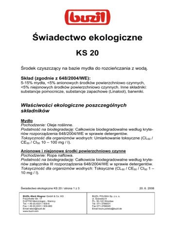 Świadectwo ekologiczne KS 20 Środek czyszczący na bazie mydła do rozcieńczania z wodą. Skład (zgodnie z 648/2004/WE): 5-15% mydła, <5% anionowych środków powierzchniowo czynnych, <5% niejonowych środków powierzchniowo czynnych. Inne składniki: substancje pomocnicze, substancje zapachowe (Linalool), barwniki. Właściwości ekologiczne poszczególnych składników Mydło Pochodzenie: Oleje roślinne. Podatność na biodegradację: Całkowicie biodegradowalne według kryteriów rozporządzenia 648/2004/WE w sprawie detergentów. Toksyczność dla organizmów wodnych: Umiarkowanie toksyczne (CL50 / CE50 / CI50 10 – 100 mg / l). Anionowe i niejonowe środki powierzchniowo czynne Pochodzenie: Ropa naftowa. Podatność na biodegradację: Całkowicie biodegradowalne według kryteriów załącznika III rozporządzenia 648/2004/WE w sprawie detergentów. Toksyczność dla organizmów wodnych: Toksyczne (CL50 / CE50 / CI50 1 – 10 mg / l). Świadectwo ekologiczne KS 20 / strona 1 z 3 BUZIL-Werk Wagner GmbH & Co. KG Fraunhofer Str. 17 D-87700 Memmingen - Niemcy Tel. + 49 (0) 8331 / 930-6 Fax + 49 (0) 8331 / 930-880 Email [email protected] www.buzil.com 20. 6. 2008 BUZIL POLSKA Sp. z o. o. ul. Szewska 8 PL- 50-122 Wrocław Tel. 071-3766031 Fax 071-3766045 Email [email protected] Substancje pomocnicze Pochodzenie: Ropa naftowa. Podatność na biodegradację: Łatwo biodegradowalny według kryteriów testów szeregu OECD 301. Niewielka część nie jest biodegradowalne, ulega jednak częściowemu rozkładowi abiotycznemu (np. przez promieniowanie słońca). Toksyczność dla organizmów wodnych: Umiarkowanie toksyczny (CL50 / CE50 / CI50 około 100 mg / l). Substancje zapachowe Perfumy są mieszaninami różnych naturalnych i syntetycznych substancji zapachowych. Niektóre z nich są tylko wolno biodegradowalne lub/i toksyczne dla organizmów wodnych. Można jednak wnioskować z zachowania się podobnych substancji w naturze, że wszystkie komponenty ulegają wcześniej czy później rozkładowi biologicznemu i nie stwarzają długotrwałego zagrożenia dla środowiska. Barwniki Barwniki używane w środkach czyszczących w bardzo niskich stężeniach (niewiele ppm) z reguły mają pochodzenie syntetyczne (ropa naftowa), nie są łatwo biodegradowalne a jednocześnie praktycznie nietoksyczne dla organizmów wodnych. Świadectwo ekologiczne KS 20 / strona 2 z 3 BUZIL-Werk Wagner GmbH & Co. KG Fraunhofer Str. 17 D-87700 Memmingen - Niemcy Tel. + 49 (0) 8331 / 930-6 Fax + 49 (0) 8331 / 930-880 Email [email protected] www.buzil.com 20. 6. 2008 BUZIL POLSKA Sp. z o. o. ul. Szewska 8 PL- 50-122 Wrocław Tel. 071-3766031 Fax 071-3766045 Email [email protected] Zachowanie się produktu w oczyszczalniach ścieków oraz w środowisku Niekorzystne wpływy na środowisko mogą wynikać z toksyczności zawartych w produkcie środków powierzchniowo czynnych dla organizmów wodnych. Ulegają one wraz z innymi organicznymi komponentami prawie całkowitej biodegradacji już podczas zwyczajowego zatrzymania się ścieków w oczyszczalniach. Pozostałości dostające się potem do naturalnych wód od razu ulegają dalszej biodegradacji i znikają po krótkim czasie ze środowiska. Trudno biodegradowalne substancje pomocnicze, które występują w produkcie w bardzo małych stężeniach (zakres ppm) wytrącają się podczas obróbki ścieków i dostają do szlamu, nie powodując tym samym obciążenia naturalnych wód. Świadectwo ekologiczne KS 20 / strona 3 z 3 BUZIL-Werk Wagner GmbH & Co. KG Fraunhofer Str. 17 D-87700 Memmingen - Niemcy Tel. + 49 (0) 8331 / 930-6 Fax + 49 (0) 8331 / 930-880 Email [email protected] www.buzil.com 20. 6. 2008 BUZIL POLSKA Sp. z o. o. ul. Szewska 8 PL- 50-122 Wrocław Tel. 071-3766031 Fax 071-3766045 Email [email protected]