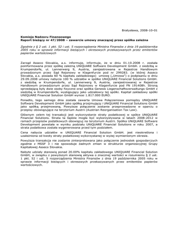 Bratysława, 2008-10-01 Komisja Nadzoru Finansowego Raport bieŜący nr 47/2008 – zawarcie umowy znaczącej przez spółka zaleŜna Zgodnie z § 2 ust. 1 pkt. 52 i ust. 5 rozporządzenia Ministra Finansów z dnia 19 października 2005 roku w sprawie informacji bieŜących i okresowych przekazywanych przez emitentów papierów wartościowych Zarząd Asseco Slovakia, a.s. informuje, informuje, Ŝe w dniu 01.10.2008 r. została poinformowana przez spółkę zaleŜną UNiQUARE Software Development GmbH. z siedzibą w Krumpendorfe, ul. Lannerwerg 9, Austria, zarejestrowana w Rejestrze Handlowym prowadzonym przez Sąd Rejonowy w Klagenfurcie pod nr 299283. (w której Asseco Slovakia, a.s. posiada 60 % kapitału zakładowego) umowę („Umowa”) o podpisaniu w dniu 29.09.2008 umowy nabycia 100 % udziałów w spółke UNiQUARE Financial Solutions GmbH. z siedzibą w Krumpendorfe, ul. Lannerwerg 9, Austria, zarejestrowanej w Rejestrze Handlowym prowadzonym przez Sąd Rejonowy w Klagenfurcie pod FN 191408h. Stroną sprzedającą były dwie osoby fizyczne oraz spółka Genesis Liegenschaftsverwaltungs GmbH z siedzibą w Krumpendorfe, występujący jako udziałowcy tej spółki. Kapitał zakładowy spółki UNIQUARE Financial Solution GmbH wynosi 1.817.000 EURO. Ponadto, tego samego dnia została zawarta Umowa Połączeniowa pomiędzy UNiQUARE Software Development GmbH jako spółką przejmującą i UNiQUARE Financial Solutions GmbH jako spółką przejmowaną. PowyŜsze połączenie zostanie przeprowadzone w oparciu o przepisy obowiązujące na terytorium Austrii (Austrian Reorganisation Tax Law). Głównym celem tej transakcji jest wykorzystanie straty podatkowej w spółce UNiQUARE Financial Solutions. Strata ta będzie mogła być wykorzystywana w latach 2008-2012 w ramach przepisów podatkowych obowiązuj na terytorium Austrii. Spółka UNiQUARE Software Development powstała w wyniku podziału UNiQUARE Financial Solutions w roku 2007, a strata podatkowa została wygenerowana przed tym podziałem. Cena nabycia udziałów w UNIQUARE Financial Solution GmbH. jest nieokreślona i uzaleŜniona od kwoty straty podatkowej wykorzystanej w wyŜej wymienionym okresie. PowyŜsza transakcja nie zostanie zinterpretowana jako połączenie jednostek gospodarczych zgodnie z MSSF 3 i nie spowoduje Ŝadnych zmian w strukturze organizacyjnej Grupy Kapitałowej Asseco Slovakia. Nabyte udziały stanowią ponad 20.00% kapitału zakładowego UNIQUARE Financial Solution GmbH, w związku z powyŜszym stanowią aktywa o znacznej wartości w rozumieniu § 2 ust. 1 pkt. 52 i ust. 5 rozporządzenia Ministra Finansów z dnia 19 października 2005 roku w sprawie informacji bieŜących i okresowych przekazywanych przez emitentów papierów wartościowych.