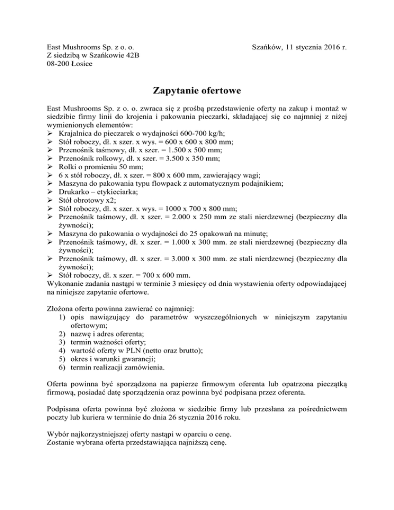 East Mushrooms Sp. z o. o. Z siedzibą w Szańkowie 42B 08-200 Łosice Szańków, 11 stycznia 2016 r. Zapytanie ofertowe East Mushrooms Sp. z o. o. zwraca się z prośbą przedstawienie oferty na zakup i montaż w siedzibie firmy linii do krojenia i pakowania pieczarki, składającej się co najmniej z niżej wymienionych elementów: Krajalnica do pieczarek o wydajności 600-700 kg/h; Stół roboczy, dł. x szer. x wys. = 600 x 600 x 800 mm; Przenośnik taśmowy, dł. x szer. = 1.500 x 500 mm; Przenośnik rolkowy, dł. x szer. = 3.500 x 350 mm; Rolki o promieniu 50 mm; 6 x stół roboczy, dł. x szer. = 800 x 600 mm, zawierający wagi; Maszyna do pakowania typu flowpack z automatycznym podajnikiem; Drukarko – etykieciarka; Stół obrotowy x2; Stół roboczy, dł. x szer. x wys. = 1000 x 700 x 800 mm; Przenośnik taśmowy, dł. x szer. = 2.000 x 250 mm ze stali nierdzewnej (bezpieczny dla żywności); Maszyna do pakowania o wydajności do 25 opakowań na minutę; Przenośnik taśmowy, dł. x szer. = 1.000 x 300 mm. ze stali nierdzewnej (bezpieczny dla żywności); Przenośnik taśmowy, dł. x szer. = 3.000 x 300 mm. ze stali nierdzewnej (bezpieczny dla żywności); Stół roboczy, dł. x szer. = 700 x 600 mm. Wykonanie zadania nastąpi w terminie 3 miesięcy od dnia wystawienia oferty odpowiadającej na niniejsze zapytanie ofertowe. Złożona oferta powinna zawierać co najmniej: 1) opis nawiązujący do parametrów wyszczególnionych w niniejszym zapytaniu ofertowym; 2) nazwę i adres oferenta; 3) termin ważności oferty; 4) wartość oferty w PLN (netto oraz brutto); 5) okres i warunki gwarancji; 6) termin realizacji zamówienia. Oferta powinna być sporządzona na papierze firmowym oferenta lub opatrzona pieczątką firmową, posiadać datę sporządzenia oraz powinna być podpisana przez oferenta. Podpisana oferta powinna być złożona w siedzibie firmy lub przesłana za pośrednictwem poczty lub kuriera w terminie do dnia 26 stycznia 2016 roku. Wybór najkorzystniejszej oferty nastąpi w oparciu o cenę. Zostanie wybrana oferta przedstawiająca najniższą cenę. Warunkiem udziału w postępowaniu ofertowym jest prowadzenie działalności pozwalającej na realizację zadania, którego dotyczy zapytanie ofertowe oraz brak powiązań, w tym powiązań osobowych lub kapitałowych, z East Mushrooms Sp. z o. o. Przez powiązania kapitałowe lub osobowe rozumie się wzajemne powiązania między beneficjentem lub osobami upoważnionymi do zaciągania zobowiązań w imieniu beneficjenta lub osobami wykonującymi w imieniu beneficjenta czynności związane z przygotowaniem i przeprowadzeniem procedury wyboru wykonawcy a wykonawcą, polegające w szczególności na: 1) uczestniczeniu w spółce jako wspólnik spółki cywilnej lub spółki osobowej; 2) posiadaniu co najmniej 10 % udziałów lub akcji; 3) pełnieniu funkcji członka organu nadzorczego lub zarządzającego, prokurenta, pełnomocnika; 4) pozostawaniu w związku małżeńskim, w stosunku pokrewieństwa lub powinowactwa w linii prostej; 5) pozostawaniu z wykonawcą w takim stosunku prawnym lub faktycznym, że może to budzić uzasadnione wątpliwości co do bezstronności tych osób. ……………………………..