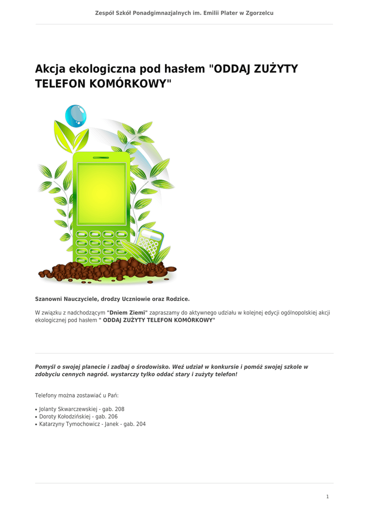 Zespół Szkół Ponadgimnazjalnych im. Emilii Plater w Zgorzelcu Akcja ekologiczna pod hasłem "ODDAJ ZUŻYTY TELEFON KOMÓRKOWY" Szanowni Nauczyciele, drodzy Uczniowie oraz Rodzice. W związku z nadchodzącym "Dniem Ziemi" zapraszamy do aktywnego udziału w kolejnej edycji ogólnopolskiej akcji ekologicznej pod hasłem " ODDAJ ZUŻYTY TELEFON KOMÓRKOWY" Pomyśl o swojej planecie i zadbaj o środowisko. Weź udział w konkursie i pomóż swojej szkole w zdobyciu cennych nagród. wystarczy tylko oddać stary i zużyty telefon! Telefony można zostawiać u Pań: ● ● ● Jolanty Skwarczewskiej - gab. 208 Doroty Kołodzińskiej - gab. 206 Katarzyny Tymochowicz - Janek - gab. 204 1