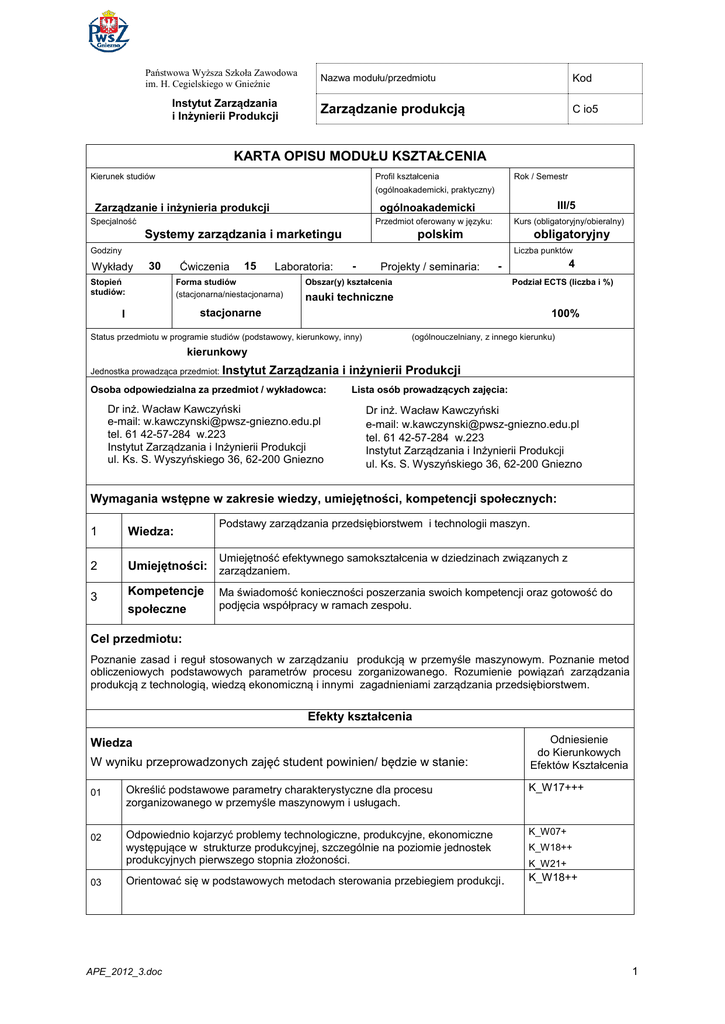 Państwowa Wyższa Szkoła Zawodowa im. H. Cegielskiego w Gnieźnie Instytut Zarządzania i Inżynierii Produkcji Nazwa modułu/przedmiotu Kod Zarządzanie produkcją C io5 KARTA OPISU MODUŁU KSZTAŁCENIA Kierunek studiów Profil kształcenia Rok / Semestr (ogólnoakademicki, praktyczny) Zarządzanie i inżynieria produkcji III/5 ogólnoakademicki Specjalność Przedmiot oferowany w języku: Systemy zarządzania i marketingu Kurs (obligatoryjny/obieralny) polskim obligatoryjny Liczba punktów Godziny Wykłady : 30 Stopień studiów: Ćwiczenia 15 Laboratoria: : Forma studiów (stacjonarna/niestacjonarna) - Projekty / seminaria: 4 - Obszar(y) kształcenia Podział ECTS (liczba i %) nauki techniczne stacjonarne I 100% Status przedmiotu w programie studiów (podstawowy, kierunkowy, inny) Liczba punktów (ogólnouczelniany, z innego kierunku) kierunkowy Jednostka prowadząca przedmiot: Instytut Zarządzania i inżynierii Produkcji xx Osoba odpowiedzialna za przedmiot / wykładowca: Dr inż. Wacław Kawczyński e-mail: [email protected] tel. 61 42-57-284 w.223 Instytut Zarządzania i Inżynierii Produkcji ul. Ks. S. Wyszyńskiego 36, 62-200 Gniezno Lista osób prowadzących zajęcia: xxx Dr inż. Wacław Kawczyński e-mail: [email protected] tel. 61 42-57-284 w.223 Instytut Zarządzania i Inżynierii Produkcji ul. Ks. S. Wyszyńskiego 36, 62-200 Gniezno Wymagania wstępne w zakresie wiedzy, umiejętności, kompetencji społecznych: Podstawy zarządzania przedsiębiorstwem i technologii maszyn. 1 Wiedza: 2 Umiejętności: zarządzaniem. 3 Kompetencje społeczne Umiejętność efektywnego samokształcenia w dziedzinach związanych z Ma świadomość konieczności poszerzania swoich kompetencji oraz gotowość do podjęcia współpracy w ramach zespołu. Cel przedmiotu: Poznanie zasad i reguł stosowanych w zarządzaniu produkcją w przemyśle maszynowym. Poznanie metod obliczeniowych podstawowych parametrów procesu zorganizowanego. Rozumienie powiązań zarządzania produkcją z technologią, wiedzą ekonomiczną i innymi zagadnieniami zarządzania przedsiębiorstwem. Efekty kształcenia Wiedza W wyniku przeprowadzonych zajęć student powinien/ będzie w stanie: 01 02 03 Odniesienie do Kierunkowych Efektów Kształcenia Określić podstawowe parametry charakterystyczne dla procesu zorganizowanego w przemyśle maszynowym i usługach. K_W17+++ Odpowiednio kojarzyć problemy technologiczne, produkcyjne, ekonomiczne występujące w strukturze produkcyjnej, szczególnie na poziomie jednostek produkcyjnych pierwszego stopnia złożoności. K_W07+ Orientować się w podstawowych metodach sterowania przebiegiem produkcji . K_W18++ APE_2012_3.doc K_W18++ K_W21+ 1 Państwowa Wyższa Szkoła Zawodowa im. H. Cegielskiego w Gnieźnie Instytut Zarządzania i Inżynierii Produkcji 04 Nazwa modułu/przedmiotu Kod Zarządzanie produkcją C io5 Rozumieć powiązania pomiędzy zarządzaniem produkcją a zarządzaniem przedsiębiorstwem małym, średnim i dużym. Umiejętności. W wyniku przeprowadzonych zajęć student będzie potrafił: K_W24+ K_W22+ Odniesienie do Kierunkowych Efektów Kształcenia 01 Sformułować plany produkcji taktyczne, operacyjne, harmonogramy produkcji oraz sposoby ewidencji i kontroli spływu produkcji wykonanej. K_U12+++ 02 Przeprowadzić analizę zdolności produkcyjnych, zinterpretować wyniki, zaproponować działania zmierzające do poprawy stopnia wykorzystania zasobów. K_U16+++ 03 Określać terminy uruchomienia i dostaw kolejnych partii wyrobów według postępowania zbieżnego z metodą MRP. K_U12++ 04 Stosować zasady oszczędnego wytwarzania zgodnie ze współczesnym zarządzaniem przedsiębiorstwem. K_U18++ Kompetencje społeczne. W wyniku przeprowadzonych zajęć student zdobędzie następujące kompetencje: 01 Rozumie techniczne, ekonomiczne i społeczne relacje zachodzące w procesach produkcyjnych. K_K04+++ 02 Potrafi myśleć i działać w sposób przedsiębiorczy. K-K06+++ 03 Ma świadomość pracy w zespole dla realizacji planów produkcji i usług. K_K07+++ Sposoby sprawdzenia efektów kształcenia APE_2012_3.doc 2 Państwowa Wyższa Szkoła Zawodowa im. H. Cegielskiego w Gnieźnie Instytut Zarządzania i Inżynierii Produkcji Nazwa modułu/przedmiotu Kod Zarządzanie produkcją C io5 Wykład  pisemny test pytań otwartych – sprawdzenie wiedzy (5 do 6 pytań),  ocenianie ciągłe na każdych zajęciach (nagradzanie przez uznanie, dowartościowanie). Ćwiczenia:  sprawdzian i premiowanie przyrostu wiedzy niezbędnej do realizacji postawionych problemów w zakresie zarządzania produkcją podstawową,  ocenianie wyrywkowe, na każdych zajęciach - premiowanie ( także oceną) lub karanie ( także negatywną oceną) przyrostu umiejętności posługiwania się poznanymi zasadami i metodami,  ocena poprawności wykonania zadań w ramach pracy własnej. Uzyskiwanie dodatkowych premii za aktywność podczas zajęć, a szczególnie za:  proponowanie omówienia dodatkowych aspektów zagadnienia,  efektywność, samodzielność zastosowania zdobytej wiedzy podczas rozwiązywania zadanego problemu,  uwagi związane z udoskonaleniem materiałów dydaktycznych,  staranność estetyczną opracowywanych zadań – w ramach nauki własnej,  wskazywanie trudności percepcyjnych studentów umożliwiające bieżące doskonalenie procesu dydaktycznego. Treści programowe Opis treści kształcenia: Reguły zarządzania 5P. Struktura procesu produkcyjnego w przedsiębiorstwie przemysłowym. Cechy zorganizowanych procesów produkcyjnych. Parametryczny opis procesu produkcyjnego. Czynniki i metody określające ilości wyrobów do wyprodukowania (programy, asortyment, serie, partie). Struktura tj, tpz. Cykl operacji technologicznej, cykle wyrobów prostych, cykle wyrobów złożonych. Skracanie cykli produkcyjnych. Fundusze czasu pracy stanowisk roboczych. Rytm i tempo produkcji, zapasy robót w toku, zapasy międzykomórkowe, pozytywna i negatywna strona zapasów, just on time. Struk
