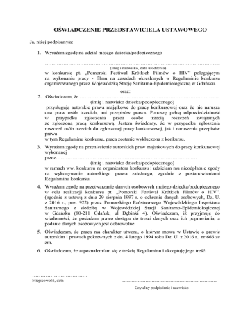 OŚWIADCZENIE PRZEDSTAWICIELA USTAWOWEGO Ja, niżej podpisany/a: 1. Wyrażam zgodę na udział mojego dziecka/podopiecznego …………………………………………………………………………………………... (imię i nazwisko, data urodzenia) w konkursie pt. „Pomorski Festiwal Krótkich Filmów o HIV” polegającym na wykonaniu pracy - filmu na zasadach określonych w Regulaminie konkursu organizowanego przez Wojewódzką Stację Sanitarno-Epidemiologiczną w Gdańsku. oraz: 2. Oświadczam, że ……………………………………………………………………....... (imię i nazwisko dziecka/podopiecznego) przysługują autorskie prawa majątkowe do pracy konkursowej oraz że nie narusza ona praw osób trzecich, ani przepisów prawa. Ponoszę pełną odpowiedzialność w przypadku zgłoszenia przez osobę trzecią roszczeń związanych ze zgłoszoną pracą konkursową. Jestem świadomy, że w przypadku zgłoszenia roszczeń osób trzecich do zgłoszonej pracy konkursowej, jak i naruszenia przepisów prawa w tym Regulaminu konkursu, praca zostanie wykluczona z konkursu. 3. Wyrażam zgodę na przeniesienie autorskich praw majątkowych do pracy konkursowej wykonanej przez…………………………………………..………………………….…. (imię i nazwisko dziecka/podopiecznego) w ramach ww. konkursu na organizatora konkursu i udzielam mu nieodpłatnie zgody na wykonywanie autorskiego prawa zależnego, zgodnie z postanowieniami Regulaminu konkursu. 4. Wyrażam zgodę na przetwarzanie danych osobowych mojego dziecka/podopiecznego w celu realizacji konkursu pt. „Pomorski Festiwal Krótkich Filmów o HIV”. (zgodnie z ustawą z dnia 29 sierpnia 1997 r. o ochronie danych osobowych, Dz. U. z 2016 r., poz. 922) przez Pomorskiego Państwowego Wojewódzkiego Inspektora Sanitarnego z siedzibą w Wojewódzkiej Stacji Sanitarno-Epidemiologicznej w Gdańsku (80-211 Gdańsk, ul Dębinki 4). Oświadczam, iż przyjmuję do wiadomości, że posiadam prawo dostępu do treści danych oraz ich poprawiania, a podanie danych osobowych jest dobrowolne. 5. Oświadczam, że praca ma charakter utworu, o którym mowa w Ustawie o prawie autorskim i prawach pokrewnych z dn. 4 lutego 1994 roku Dz. U. z 2016 r., nr 666 ze zm. 6. Oświadczam, że zapoznałem/am się z treścią Regulaminu i akceptuję jego treść. …………………………… Miejscowość, data ............................................................................ Czytelny podpis imię i nazwisko rodzica/prawnego opiekuna OŚWIADCZENIE PEŁNOLETNIEGO UCZESTNIKA KONKURSU 1. Upoważniam Szkołę …………………………………………………………………………………………... (nazwa szkoły) do przekazania Organizatorowi pracy w konkursie pt. „Pomorski Festiwal Krótkich Filmów o HIV” polegającym na wykonaniu filmu na zasadach określonych w Regulaminie konkursu. 2. Oświadczam, że przysługują mi autorskie prawa majątkowe do pracy konkursowej oraz że nie narusza ona praw osób trzecich, ani przepisów prawa. Ponoszę pełną odpowiedzialność w przypadku zgłoszenia przez osobę trzecią roszczeń związanych ze zgłoszoną pracą konkursową. Jestem świadomy, że w przypadku zgłoszenia roszczeń osób trzecich do zgłoszonej pracy konkursowej, jak i naruszenia przepisów prawa w tym Regulaminu konkursu, praca zostanie wykluczona z konkursu. 3. Wyrażam zgodę na przetwarzanie moich danych osobowych w celu realizacji konkursu pt. „Pomorski Festiwal Krótkich Filmów o HIV” polegającym na wykonaniu filmu (zgodnie z ustawą z dnia 29 sierpnia 1997 r. o ochronie danych osobowych, Dz. U. z 2016 r., poz. 922) przez Pomorskiego Państwowego Wojewódzkiego Inspektora Sanitarnego z siedzibą w Wojewódzkiej Stacji SanitarnoEpidemiologicznej w Gdańsku (80-211 Gdańsk, ul. Dębinki 4). Oświadczam, iż przyjmuję do wiadomości, że posiadam prawo dostępu do treści danych oraz ich poprawiania, a podanie danych osobowych jest dobrowolne. 4. Wyrażam zgodę na przeniesienie autorskich praw majątkowych do pracy konkursowej wykonanej przeze mnie w ramach ww. konkursu na organizatora konkursu i udzielam mu nieodpłatnie zgody na wykonywanie autorskiego prawa zależnego, zgodnie z postanowieniami regulaminu konkursu. 5. Oświadczam, że praca ma charakter utworu, o którym mowa w Ustawie o prawie autorskim i prawach pokrewnych z dn. 4 lutego 1994 roku Dz. U. z 2016 r., nr 666 ze zm. 6. Oświadczam, że zapoznałem/am się z treścią Regulaminu i akceptuję jego treść. …………………………… Miejscowość ,data . ………………………............................................................................................................. Czytelny podpis imię i nazwisko, klasa, data urodzenia