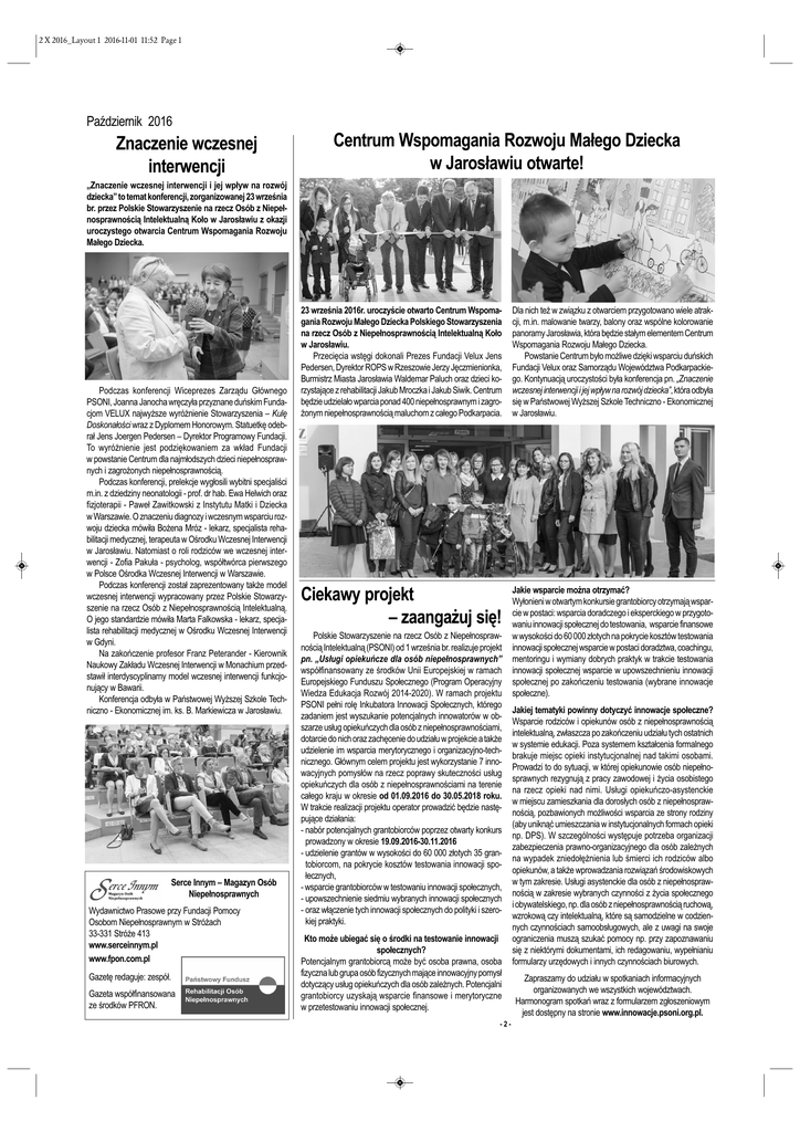 2 X 2016_Layout 1 2016-11-01 11:52 Page 1 Październik 2016 Znaczenie wczesnej interwencji „Znaczenie wczesnej interwencji i jej wpływ na rozwój dziecka” to temat konferencji, zorganizowanej 23 września br. przez Polskie Stowarzyszenie na rzecz Osób z Niepełnosprawnością Intelektualną Koło w Jarosławiu z okazji uroczystego otwarcia Centrum Wspomagania Rozwoju Małego Dziecka. Podczas konferencji Wiceprezes Zarządu Głównego PSONI, Joanna Janocha wręczyła przyznane duńskim Fundacjom VELUX najwyższe wyróżnienie Stowarzyszenia – Kulę Doskonałości wraz z Dyplomem Honorowym. Statuetkę odebrał Jens Joergen Pedersen – Dyrektor Programowy Fundacji. To wyróżnienie jest podziękowaniem za wkład Fundacji w powstanie Centrum dla najmłodszych dzieci niepełnosprawnych i zagrożonych niepełnosprawnością. Podczas konferencji, prelekcje wygłosili wybitni specjaliści m.in. z dziedziny neonatologii - prof. dr hab. Ewa Helwich oraz fizjoterapii - Paweł Zawitkowski z Instytutu Matki i Dziecka w Warszawie. O znaczeniu diagnozy i wczesnym wsparciu rozwoju dziecka mówiła Bożena Mróz - lekarz, specjalista rehabilitacji medycznej, terapeuta w Ośrodku Wczesnej Interwencji w Jarosławiu. Natomiast o roli rodziców we wczesnej interwencji - Zofia Pakuła - psycholog, współtwórca pierwszego w Polsce Ośrodka Wczesnej Interwencji w Warszawie. Podczas konferencji został zaprezentowany także model wczesnej interwencji wypracowany przez Polskie Stowarzyszenie na rzecz Osób z Niepełnosprawnością Intelektualną. O jego standardzie mówiła Marta Falkowska - lekarz, specjalista rehabilitacji medycznej w Ośrodku Wczesnej Interwencji w Gdyni. Na zakończenie profesor Franz Peterander - Kierownik Naukowy Zakładu Wczesnej Interwencji w Monachium przedstawił interdyscyplinarny model wczesnej interwencji funkcjonujący w Bawarii. Konferencja odbyła w Państwowej Wyższej Szkole Techniczno - Ekonomicznej im. ks. B. Markiewicza w Jarosławiu. Serce Innym – Magazyn Osób Niepełnosprawnych Wydawnictwo Prasowe przy Fundacji Pomocy Osobom Niepełnosprawnym w Stróżach 33-331 Stróże 413 www.serceinnym.pl www.fpon.com.pl Gazetę redaguje: zespół. Gazeta współfinansowana ze środków PFRON. Centrum Wspomagania Rozwoju Małego Dziecka w Jarosławiu otwarte! 23 września 2016r. uroczyście otwarto Centrum Wspomagania Rozwoju Małego Dziecka Polskiego Stowarzyszenia na rzecz Osób z Niepełnosprawnością Intelektualną Koło w Jarosławiu. Przecięcia wstęgi dokonali Prezes Fundacji Velux Jens Pedersen, Dyrektor ROPS w Rzeszowie Jerzy Jęczmienionka, Burmistrz Miasta Jarosławia Waldemar Paluch oraz dzieci korzystające z rehabilitacji Jakub Mroczka i Jakub Siwik. Centrum będzie udzielało wparcia ponad 400 niepełnosprawnym i zagrożonym niepełnosprawnością maluchom z całego Podkarpacia. Ciekawy projekt – zaangażuj się! Polskie Stowarzyszenie na rzecz Osób z Niepełnosprawnością Intelektualną (PSONI) od 1 września br. realizuje projekt pn. „Usługi opiekuńcze dla osób niepełnosprawnych” współfinansowany ze środków Unii Europejskiej w ramach Europejskiego Funduszu Społecznego (Program Operacyjny Wiedza Edukacja Rozwój 2014-2020). W ramach projektu PSONI pełni rolę Inkubatora Innowacji Społecznych, którego zadaniem jest wyszukanie potencjalnych innowatorów w obszarze usług opiekuńczych dla osób z niepełnosprawnościami, dotarcie do nich oraz zachęcenie do udziału w projekcie a także udzielenie im wsparcia merytorycznego i organizacyjno-technicznego. Głównym celem projektu jest wykorzystanie 7 innowacyjnych pomysłów na rzecz poprawy skuteczności usług opiekuńczych dla osób z niepełnosprawnościami na terenie całego kraju w okresie od 01.09.2016 do 30.05.2018 roku. W trakcie realizacji projektu operator prowadzić będzie następujące działania: - nabór potencjalnych grantobiorców poprzez otwarty konkurs prowadzony w okresie 19.09.2016-30.11.2016 - udzielenie grantów w wysokości do 60 000 złotych 35 grantobiorcom, na pokrycie kosztów testowania innowacji społecznych, - wsparcie grantobiorców w testowaniu innowacji społecznych, - upowszechnienie siedmiu wybranych innowacji społecznych - oraz włączenie tych innowacji społecznych do polityki i szerokiej praktyki. Kto może ubiegać się o środki na testowanie innowacji społecznych? Potencjalnym grantobiorcą może być osoba prawna, osoba fizyczna lub grupa osób fizycznych mające innowacyjny pomysł dotyczący usług opiekuńczych dla osób zależnych. Potencjalni grantobiorcy uzyskają wsparcie finansowe i merytoryczne w przetestowaniu innowacji społecznej. -2- Dla nich też w związku z otwarciem przygotowano wiele atrakcji, m.in. malowanie twarzy, balony oraz wspólne kolorowanie panoramy Jarosławia, która będzie stałym elementem Centrum Wspomagania Rozwoju Małego Dziecka. Powstanie Centrum było możliwe dzięki wsparciu duńskich Fundacji Velux oraz Samorządu Województwa Podkarpackiego. Kontynuacją uroczystości była konferencja pn. „Znaczenie wczesnej interwencji i jej wpływ na rozwój dziecka”, która odbyła się w Państwowej Wyższej Szkole Techniczno - Ekonomicznej w Jarosławiu. Jakie wsparcie można otrzymać? Wyłonieni w otwartym konkursie grantobiorcy otrzymają wsparcie w postaci: wsparcia doradczego i eksperckiego w przygotowaniu innowacji społecznej do testowania, wsparcie finansowe w wysokości do 60 000 złotych na pokrycie kosztów testowania innowacji społecznej wsparcie w postaci doradztwa, coachingu, mentoringu i wymiany dobrych praktyk w trakcie testowania innowacji społecznej wsparcie w upowszechnieniu innowacji społecznej po zakończeniu testowania (wybrane innowacje społeczne). Jakiej tematyki powinny dotyczyć innowacje społeczne? Wsparcie rodziców i opiekunów osób z niepełnosprawnością intelektualną, zwłaszcza po zakończeniu udziału tych ostatnich w systemie edukacji. Poza systemem kształcenia form