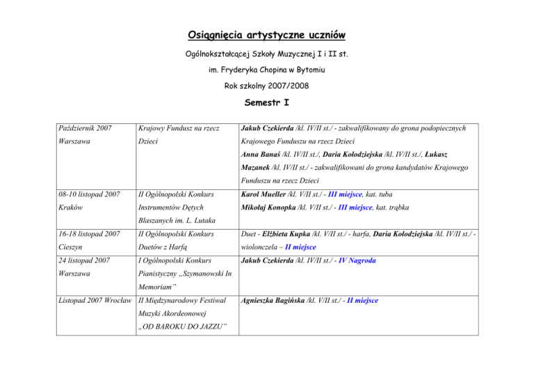 Osiągnięcia artystyczne uczniów Ogólnokształcącej Szkoły Muzycznej I i II st. im. Fryderyka Chopina w Bytomiu Rok szkolny 2007/2008 Semestr I Październik 2007 Krajowy Fundusz na rzecz Jakub Czekierda /kl. IV/II st./ - zakwalifikowany do grona podopiecznych Warszawa Dzieci Krajowego Funduszu na rzecz Dzieci Anna Banaś /kl. IV/II st./, Daria Kołodziejska /kl. IV/II st./, Łukasz Mazanek /kl. IV/II st./ - zakwalifikowani do grona kandydatów Krajowego Funduszu na rzecz Dzieci 08-10 listopad 2007 II Ogólnopolski Konkurs Karol Mueller /kl. V/II st./ - III miejsce, kat. tuba Kraków Instrumentów Dętych Mikołaj Konopka /kl. V/II st./ - III miejsce, kat. trąbka Blaszanych im. L. Lutaka 16-18 listopad 2007 II Ogólnopolski Konkurs Duet - ElŜbieta Kupka /kl. V/II st./ - harfa, Daria Kołodziejska /kl. IV/II st./ - Cieszyn Duetów z Harfą wiolonczela – II miejsce 24 listopad 2007 I Ogólnopolski Konkurs Jakub Czekierda /kl. IV/II st./ - IV Nagroda Warszawa Pianistyczny „Szymanowski In Memoriam” Listopad 2007 Wrocław II Międzynarodowy Festiwal Muzyki Akordeonowej „OD BAROKU DO JAZZU” Agnieszka Bagińska /kl. V/II st./ - II miejsce 28 – 30 listopad 2007 I Ogólnopolski Konkurs Monika Szmidt /kl. VI/II st./ - III miejsce Wrocław Instrumentów Dętych dla Paulina Wojciechowska /kl. III/II st./ - wyróŜnienie uczniów Szkół Muzycznych II st. 30 listopad – 01 IX Warszawskie Warsztaty grudzień 2007 Gitarowe Jakub Moroziński /kl. III/I st./ - wyróŜnienie Warszawa 30 listopad – 02 XXXIII Ogólnopolski Konkurs grudzień 2007 Bachowski im. Stanisława Zielona Góra Hajzera 03 grudzień 2007 Szkolny Konkurs SolfeŜowy Bytom Laura Bukowska /II/II st./ - wyróŜnienie Anita Ćwiklińska /kl. VI/II st./ - I miejsce Sonia Walaszczyk /kl. VI/II st./ - II miejsce Mateusz Sołtysik /kl. V/II st./ - III miejsce Mieczysław Unger /kl. VI/II st./ - wyróŜnienie Daria Kołodziejska /kl. IV/II st./ - wyróŜnienie 05 – 08 grudzień 2007 XVI Międzynarodowy Festiwal Katarzyna Lisowska /kl. VI/II st./ - wyróŜnienie Przemyśl Muzyki Akordeonowej 06 grudzień 2007 I Mikołajkowy Konkurs Jakub Moroziński /kl. III/I st./ - I nagroda Rybnik Gitarowy dla Dzieci Piotr Bodnar /kl. II/I st./ - III nagroda DŹWIĘK I OBRAZ 07 grudzień 2007 MłodzieŜowa Nagroda WENA Bytom Anna Banaś /kl. IV/II st./ - otrzymała MłodzieŜową Nagrodę w dziedzinie kultury WENA w kategorii muzyka 12 grudzień 2007 Krajowy Fundusz na rzecz Jakub Czekierda /kl. IV/II st./ został zakwalifikowany na Warsztaty Warszawa Dzieci Muzyczne w Zakopanem