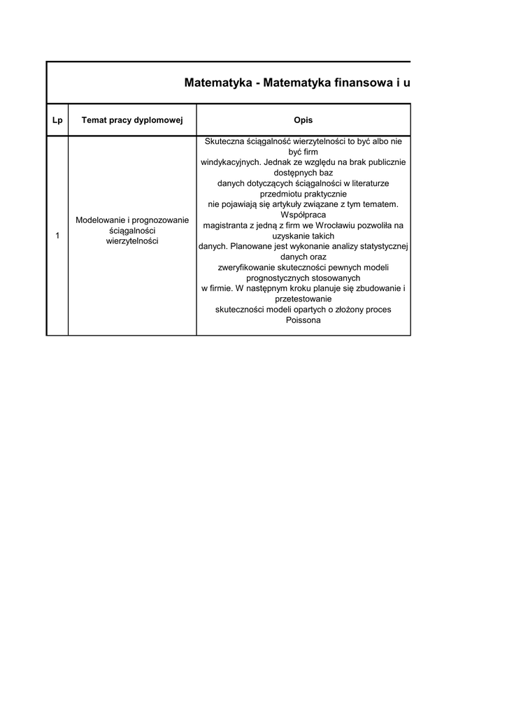 Matematyka - Matematyka finansowa i ubezpieczeniowa Lp 1 Temat pracy dyplomowej Opis Modelowanie i prognozowanie ściągalności wierzytelności Skuteczna ściągalność wierzytelności to być albo nie być firm windykacyjnych. Jednak ze względu na brak publicznie dostępnych baz danych dotyczących ściągalności w literaturze przedmiotu praktycznie nie pojawiają się artykuły związane z tym tematem. Współpraca magistranta z jedną z firm we Wrocławiu pozwoliła na uzyskanie takich danych. Planowane jest wykonanie analizy statystycznej danych oraz zweryfikowanie skuteczności pewnych modeli prognostycznych stosowanych w firmie. W następnym kroku planuje się zbudowanie i przetestowanie skuteczności modeli opartych o złożony proces Poissona sowa i ubezpieczeniowa - II stopień - mgr Opiekun Temat jest proponowany dla studenta (imię i nazwisko): Opinia Komisji TAK / NIE Prof. Rafał Weron Olejnik Michał TAK