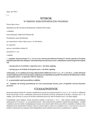 Sygn. akt VIII C (...) WYROK W IMIENIU RZECZYPOSPOLITEJ POLSKIEJ Dnia 9 lipca 2014 r. Sąd Rejonowy dla Wrocławia-Śródmieścia, Wydział VIII Cywilny w składzie: Przewodniczący: SSR Paweł Wiśniewski Protokolant: Anna Hrydziuszko po rozpoznaniu w dniu 9 lipca 2014 r. we Wrocławiu na rozprawie sprawy z powództwa Gminy W. przeciwko P. L. (1) o zapłatę I. zasądza od pozwanego P. L. (1) na rzecz strony powodowej Gminy W. kwotę 359,82 zł (trzysta pięćdziesiąt dziewięć złotych i osiemdziesiąt dwa grosze) wraz z odsetkami ustawowymi liczonymi od: • kwoty 306,72 zł od dnia 1 stycznia 2011 r. do dnia zapłaty, • kwoty 53,10 zł od dnia 8 sierpnia 2012 r. do dnia zapłaty, wskazując, że za zapłatę pozwany odpowiada solidarnie wraz z J. L., P. L. (2) i B. L., wobec których został wydany prawomocny nakaz zapłaty przez Sąd Rejonowy dla Wrocławia-Śródmieścia w dniu 14 sierpnia 2012 r. w sprawie VIII Nc 1690/12; II. w pozostałej części powództwo oddala; III. zasądza od strony powodowej na rzecz pozwanego kwotę 3.617 zł tytułem zwrotu kosztów procesu. UZASADNIENIE Strona powodowa Gmina W. wniosła o zasądzenie na swoją rzecz od pozwanych P. L. (1), J. L., P. L. (2) i B. L. solidarnie kwoty 69.567,83 zł wraz z odsetkami ustawowymi liczonymi od kwoty 48.362,68 zł od dnia 1 stycznia 2011 r. do zapłaty, oraz od kwoty 21.205,15 zł od dnia wniesienia pozwu (tj. dnia 8 sierpnia 2012 r.) do dnia zapłaty. Uzasadniając swoje żądanie, strona powodowa podała, że pozwani J. i B. L. - jako najemcy lokalu mieszkalnego położonego we W. przy ul. (...)), a pozostali pozwani – jako osoby dorosłe wspólnie z najemcami mieszkające – zalegali z zapłatą na jej rzecz (jako wynajmującego) czynszu oraz innych opłat. Strona powodowa wyjaśniła, że żądana suma obejmuje kwotę 48.362,68 zł tytułem czynszu i innych opłat za okres do 31 grudnia 2010 r. oraz kwotę 21.205,15 zł tytułem wyliczonych na wskazany dzień skapitalizowanych odsetek ustawowych za opóźnienie w zapłacie. Referendarz sądowy w Sądzie Rejonowym dla Wrocławia-Śródmieścia w dniu 14 sierpnia 2012 r. wydał nakaz zapłaty w postępowaniu upominawczym, uwzględniając powództwo w całości. Pozwany P. L. (1) złożył sprzeciw od powyższego nakazu zapłaty, zaskarżając go w całości i wnosząc o oddalenie powództwa. Podniósł zarzut przedawnienia roszczeń za okres do 8 sierpnia 2009 r., a także wyjaśnił, ze od października 2009 r. nie mieszkał w spornym lokalu. Poza tym podniósł, że strona powodowa nie udowodniła wysokości dochodzonych roszczeń. Prawomocnym postanowieniem z dnia 28 października 2013 r. sprzeciwy pozostałych pozwanych zostały odrzucone. Sąd ustalił następujący stan faktyczny: W dniu 1 kwietnia 1995 r. strona powodowa Gmina W., jako wynajmująca, zawarła z pozwanymi J. L. i B. L., jako najemcami, umowę najmu lokalu mieszkalnego położonego we W. przy ul. (...), na czas nieokreślony. Wysokość czynszu ustalono na 44,67 zł, a wysokość innych opłat na 108,69 zł. Najemcy byli zobowiązani do zapłaty wymiotnych należności z góry do 10. dnia każdego miesiąca. (dowód: kopia umowa najmu, której zgodność z oryginałem była bezsporna, 13-16.) Pozwany P. L. (1) mieszkał wspólnie z najemcami w opisanym powyżej lokalu do września 2009 r. W październiku 2009 r. wyprowadził się bowiem do swojej partnerki życiowej. (dowód: zeznania świadków I. Ł., K. Z. oraz J. S., k. 209-210) Sąd zważył, co następuje: Powództwo zasługiwało na uwzględnienie jedynie w niewielkiej części. Nie budziło wątpliwości, że pozwany, jako osoba pełnoletnia stale zamieszkująca w spornym lokalu mieszkalnym wraz z najemcami odpowiadał solidarnie za zapłatę czynszu i innych należnych opłat (art. 6881 § 1 k.c.) za okres stałego zamieszkiwania (art. 6881 § 2 k.c.). Uzasadniony okazał się przede wszystkim podniesiony przez niego zarzut przedawnienia części roszczeń. Zgodnie z art. 659 § 1 k.c., przez umowę najmu wynajmujący zobowiązuje się oddać najemcy rzecz do używania przez czas oznaczony lub nie oznaczony, a najemca zobowiązuje się płacić wynajmującemu umówiony czynsz. W myśl zaś art. 669 § 1 i 2 k.c., najemca obowiązany jest uiszczać czynsz w terminie umówionym, a jeżeli termin płatności czynszu nie jest w umowie określony, czynsz powinien być płacony z góry, a mianowicie: gdy najem ma trwać nie dłużej niż miesiąc - za cały czas najmu, a gdy najem ma trwać dłużej niż miesiąc albo gdy umowa była zawarta na czas nie oznaczony - miesięcznie, do dziesiątego dnia miesiąca. Z powołanego wyżej przepisu art. 669 k.c. wynika, że czynsz najmu może być ukształtowany jako świadczenie jednorazowe albo periodyczne, przy czym decydujące znaczenie ma w tym zakresie treść zawartej umowy. Nie ma przy tym żadnych podstaw, aby inaczej oceniać świadczenie obejmujące inne (niezależne od właściciela) opłaty. Wbrew sugestiom strony powodowej, obciążające najemcę opłaty związane z dostarczanymi do lokalu mediami (wodą, energią elektryczną) czy opłaty za wywóz nieczystości nie mają charakteru zaliczek. Zmiana ich wysokości nie jest bowiem uzależniona jedynie od wartości opłat żądanych przez przedsiębiorcę dostarczającego określone media do nieruchomości, wywozi nieczystości czy też świadczy inne usługi. Każdorazowa zmiana wysokości innych opłat obciążających najemcę wymaga bowiem, tak jak zmiana wysokości czynszu, wypowiedzenia dotychczasowej wysokości z zachowaniem terminów wypowiedzenia (art. 8a ust. 1 u.o.p.l.), dokonanego - pod rygorem nieważności - na piśmie (art. 8a ust. 3 u.o.p.l.). Skoro zaś strony umowy najmu ustaliły, że zarówno czynsz, jak i opłaty niezależne od właściciela, mają być uiszczane miesięcznie z góry, to wszystkie opisane świadczenia były świadczeniami okresowymi. Ponieważ - zgodnie z art. 118 k.c. - termin przedawn
