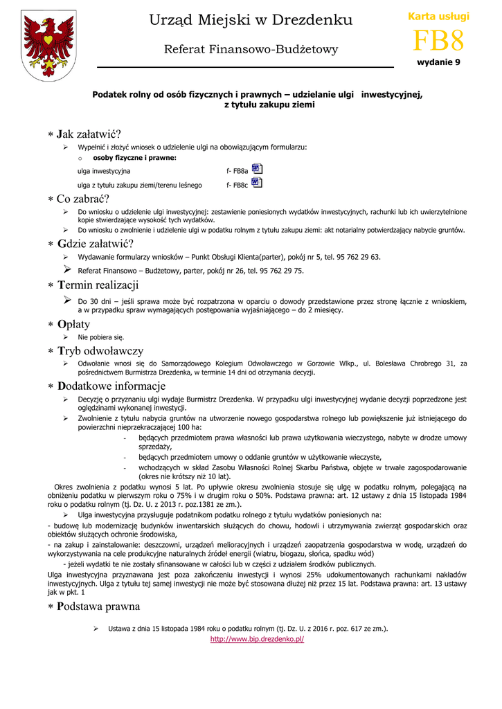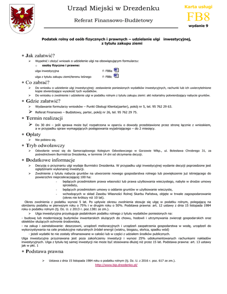 Urząd Miejski w Drezdenku Referat Finansowo-Budżetowy Karta usługi FB8 wydanie 9 Podatek rolny od osób fizycznych i prawnych – udzielanie ulgi inwestycyjnej, z tytułu zakupu ziemi Jak załatwić? Wypełnić i złożyć wniosek o udzielenie ulgi na obowiązującym formularzu: o osoby fizyczne i prawne: ulga inwestycyjna f- FB8a ulga z tytułu zakupu ziemi/terenu leśnego f- FB8c Co zabrać? Do wniosku o udzielenie ulgi inwestycyjnej: zestawienie poniesionych wydatków inwestycyjnych, rachunki lub ich uwierzytelnione kopie stwierdzające wysokość tych wydatków. Do wniosku o zwolnienie i udzielenie ulgi w podatku rolnym z tytułu zakupu ziemi: akt notarialny potwierdzający nabycie gruntów. Gdzie załatwić? Wydawanie formularzy wniosków – Punkt Obsługi Klienta(parter), pokój nr 5, tel. 95 762 29 63. Referat Finansowo – Budżetowy, parter, pokój nr 26, tel. 95 762 29 75. Termin realizacji Do 30 dni – jeśli sprawa może być rozpatrzona w oparciu o dowody przedstawione przez stronę łącznie z wnioskiem, a w przypadku spraw wymagających postępowania wyjaśniającego – do 2 miesięcy. Opłaty Nie pobiera się. Tryb odwoławczy Odwołanie wnosi się do Samorządowego Kolegium Odwoławczego w Gorzowie Wlkp., ul. Bolesława Chrobrego 31, za pośrednictwem Burmistrza Drezdenka, w terminie 14 dni od otrzymania decyzji. Dodatkowe informacje Decyzję o przyznaniu ulgi wydaje Burmistrz Drezdenka. W przypadku ulgi inwestycyjnej wydanie decyzji poprzedzone jest oględzinami wykonanej inwestycji. Zwolnienie z tytułu nabycia gruntów na utworzenie nowego gospodarstwa rolnego lub powiększenie już istniejącego do powierzchni nieprzekraczającej 100 ha: będących przedmiotem prawa własności lub prawa użytkowania wieczystego, nabyte w drodze umowy sprzedaży, będących przedmiotem umowy o oddanie gruntów w użytkowanie wieczyste, wchodzących w skład Zasobu Własności Rolnej Skarbu Państwa, objęte w trwałe zagospodarowanie (okres nie krótszy niż 10 lat). Okres zwolnienia z podatku wynosi 5 lat. Po upływie okresu zwolnienia stosuje się ulgę w podatku rolnym, polegającą na obniżeniu podatku w pierwszym roku o 75% i w drugim roku o 50%. Podstawa prawna: art. 12 ustawy z dnia 15 listopada 1984 roku o podatku rolnym (tj. Dz. U. z 2013 r. poz.1381 ze zm.). Ulga inwestycyjna przysługuje podatnikom podatku rolnego z tytułu wydatków poniesionych na: - budowę lub modernizację budynków inwentarskich służących do chowu, hodowli i utrzymywania zwierząt gospodarskich oraz obiektów służących ochronie środowiska, - na zakup i zainstalowanie: deszczowni, urządzeń melioracyjnych i urządzeń zaopatrzenia gospodarstwa w wodę, urządzeń do wykorzystywania na cele produkcyjne naturalnych źródeł energii (wiatru, biogazu, słońca, spadku wód) - jeżeli wydatki te nie zostały sfinansowane w całości lub w części z udziałem środków publicznych. Ulga inwestycyjna przyznawana jest poza zakończeniu inwestycji i wynosi 25% udokumentowanych rachunkami nakładów inwestycyjnych. Ulga z tytułu tej samej inwestycji nie może być stosowana dłużej niż przez 15 lat. Podstawa prawna: art. 13 ustawy jak w pkt. 1 Podstawa prawna Ustawa z dnia 15 listopada 1984 roku o podatku rolnym (tj. Dz. U. z 2016 r. poz. 617 ze zm.). Podatnikom podatku http://www.bip.drezdenko.pl/ 2