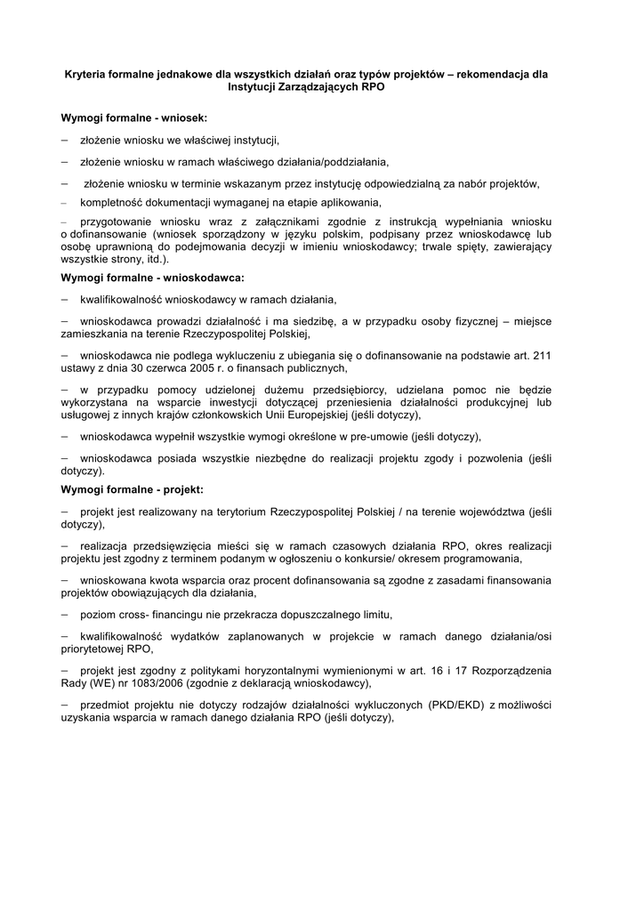 Kryteria formalne jednakowe dla wszystkich działań oraz typów projektów – rekomendacja dla Instytucji Zarządzających RPO Wymogi formalne - wniosek: − złoŜenie wniosku we właściwej instytucji, − złoŜenie wniosku w ramach właściwego działania/poddziałania, − – złoŜenie wniosku w terminie wskazanym przez instytucję odpowiedzialną za nabór projektów, kompletność dokumentacji wymaganej na etapie aplikowania, – przygotowanie wniosku wraz z załącznikami zgodnie z instrukcją wypełniania wniosku o dofinansowanie (wniosek sporządzony w języku polskim, podpisany przez wnioskodawcę lub osobę uprawnioną do podejmowania decyzji w imieniu wnioskodawcy; trwale spięty, zawierający wszystkie strony, itd.). Wymogi formalne - wnioskodawca: − kwalifikowalność wnioskodawcy w ramach działania, − wnioskodawca prowadzi działalność i ma siedzibę, a w przypadku osoby fizycznej – miejsce zamieszkania na terenie Rzeczypospolitej Polskiej, − wnioskodawca nie podlega wykluczeniu z ubiegania się o dofinansowanie na podstawie art. 211 ustawy z dnia 30 czerwca 2005 r. o finansach publicznych, − w przypadku pomocy udzielonej duŜemu przedsiębiorcy, udzielana pomoc nie będzie wykorzystana na wsparcie inwestycji dotyczącej przeniesienia działalności produkcyjnej lub usługowej z innych krajów członkowskich Unii Europejskiej (jeśli dotyczy), − wnioskodawca wypełnił wszystkie wymogi określone w pre-umowie (jeśli dotyczy), − wnioskodawca posiada wszystkie niezbędne do realizacji projektu zgody i pozwolenia (jeśli dotyczy). Wymogi formalne - projekt: − projekt jest realizowany na terytorium Rzeczypospolitej Polskiej / na terenie województwa (jeśli dotyczy), − realizacja przedsięwzięcia mieści się w ramach czasowych działania RPO, okres realizacji projektu jest zgodny z terminem podanym w ogłoszeniu o konkursie/ okresem programowania, − wnioskowana kwota wsparcia oraz procent dofinansowania są zgodne z zasadami finansowania projektów obowiązujących dla działania, − poziom cross- financingu nie przekracza dopuszczalnego limitu, − kwalifikowalność wydatków zaplanowanych w projekcie w ramach danego działania/osi priorytetowej RPO, − projekt jest zgodny z politykami horyzontalnymi wymienionymi w art. 16 i 17 Rozporządzenia Rady (WE) nr 1083/2006 (zgodnie z deklaracją wnioskodawcy), − przedmiot projektu nie dotyczy rodzajów działalności wykluczonych (PKD/EKD) z moŜliwości uzyskania wsparcia w ramach danego działania RPO (jeśli dotyczy), −