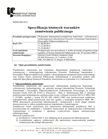 DZPIE/006/2013 Specyfikacja istotnych warunków zamówienia publicznego Przedmiot postępowania: Wykonanie dokumentacji projektowej, budowlano - wykonawczej i technologicznej Laboratorium Procesów Technologii Nanostruktur i Przyrządów Półprzewodnikowych. 71.00.00.00-8 Kod CPV: 71.22.00.00-6 71.32.00.00-7 Postępowanie jest prowadzone w trybie przetargu nieograniczonego Tryb udzielenia zgodnie z Prawem Zamówień Publicznych z dn. 29 stycznia 2004 r. zamówienia: Instytut Fizyki Polskiej Akademii Nauk Inwestor/Kupujący: 02-668 Warszawa, Al. Lotników 32/46. NIP: 525-000-92-75; Regon: P-000326061 §1. Opis przedmiotu zamówienia: Przedmiotem zamówienia jest wykonanie dokumentacji projektowej, budowlano wykonawczej i technologicznej Laboratorium Procesów Technologii Nanostruktur i Przyrządów Półprzewodnikowych zgodnie z obowiązującymi przepisami prawa budowlanego oraz Ustawy Prawo Zamówień Publicznych. Dokumentacja w przyszłości posłuży jako załącznik Specyfikacji Istotnych Warunków Zamówienia na wykonanie w/w Laboratorium. 1. Opis przedmiotu zamówienia: Przedmiotem zamówienia jest opracowanie dokumentacji projektowej, budowlano wykonawczej i technologicznej, na potrzeby nowego Laboratorium Procesów Technologii Nanostruktur i Przyrządów Półprzewodnikowych (Laboratorium Processingu) na terenie Instytutu Fizyki PAN (IF PAN) w Warszawie - Hala A. Modernizacja Hali A obejmuje pomieszczenia technologiczne, pomieszczenia czyste, o klasach czystości ISO 6 (1 000) i ISO 7 (10 000) zgodnie z normą PN-EN ISO 14644-1:2005 oraz pomieszczenia techniczne. Zaprojektowany układ pomieszczeń musi być zgodny z wymogami przepisów BHP, PB i PPOŻ dotyczących powierzchni laboratoryjnych i technicznych i może ulegać zmianie dostosowawczej w trakcie projektowania po uzgodnieniu z Zamawiającym. Zasadniczym celem zamówienia jest opracowanie dokumentacji projektowej Hali A przystosowanej do standardów i warunków koniecznych do funkcjonowania Laboratorium wyposażonego w urządzenia i aparaturę o najwyższym stopniu zaawansowania technologicznego. Głównym zadaniem jest: a) przebudowa i remont Hali A oraz adaptacja jej do pomieszczeń laboratoryjnych, b) wyodrębnienie zapleczy technicznych dla zapewnienia rozprowadzenia instalacji technicznych dla obsługi laboratoriów, c) wydłużenie przybudówki Hali A o około 4 metry (pomieszczenie techniczne III), (w części utworzonego pomieszczenia planowane jest zlokalizowanie magazynu butli z gazami czystymi i technicznymi na potrzeby istniejącego w Hali A laboratorium MBE oraz nowych laboratoriów), d) dobudowanie zewnętrznego korytarza technicznego I, łączącego pomieszczania laboratoryjne, o szerokości około 2,5 m po zachodniej stronie na wysokości pierwszego pietra. Konstrukcja korytarza w formie wspornika (bez słupów, filarów). Zamawiający zastrzega sobie prawo do rezygnacji z korytarza jeżeli koszty oszacowane przez Wykonawcę w projekcie koncepcyjnym będą przekraczać możliwości finansowe Zamawiającego. W przypadku rezygnacji należy wygospodarować powierzchnię pod korytarz techniczny kosztem powierzchni laboratoriów. W zakres zamówienia wchodzi: a) opracowanie koncepcji technologiczno-projektowej (projekt wstępny) dotyczącej Laboratorium Processingu usytuowanego w budynku Hali A oraz uzyskanie pozytywnej akceptacji Zamawiającego. Wymaga się wykonania dwóch projektów koncepcyjnych : a) z uwzględnieniem dobudowanego korytarza technicznego I , b) bez dobudowanego korytarza technicznego I. Projekty koncepcyjne powinny zawierać wstępne oszacowanie kosztów budowlanych. b) w oparciu o zaakceptowaną przez Zamawiającego koncepcję technologicznoprojektową wykonanie dokumentacji projektowo-wykonawczej i uzyskanie wymaganych przepisami wszelkich pozwoleń i uzgodnień administracyjnych, w tym pozwolenia na budowę, c) dokumentacja projektowa musi składać się z: projektu budowlanego koniecznego do uzyskania pozwolenia na budowę, projektów wykonawczych w zakresie konstrukcji, projektów wykonawczych w zakresie instalacji wodno – kanalizacyjnych grzewczych, sanitarnych, projektów wykonawczych w zakresie klimatyzacji i wentylacji, projektów wykonawczych w zakresie instalacji elektrycznych, projektów wykonawczych w zakresie instalacji gazów czystych i technicznych, projektów wykonawczych podłączenia do sieci informatycznej i telefonicznej, projektów wykonawczo-technologicznych w zakresie technologii pomieszczeń i funkcji specjalistycznych, urządzenia wnętrz i wyposażenia technicznego, specyfikacji technicznej wykonania i odbioru robót dla wszystkich branż, przedmiarów robót i kosztorysów inwestorskich. Laboratorium Processingu będzie znajdować się w Hali A. Będą tam zlokalizowane pracownie: fotolitografii, osadzania chemicznego i plazmowego, czyste pomieszczanie technologiczne, laboratorium sputeringu i PVD, chemia, czyste szatnie i korytarze, korytarze i pomieszczenia techniczne. W bezpośrednim sąsiedztwie planowanego Laboratorium Processingu znajduje się Laboratorium MBE. W ramach prac projektowych konieczne jest uwzględnienie połączenia niektórych instalacji gazowych, ciągów komunikacyjnych tych obiektów tak, aby stanowiły jedną połączoną całość. Zamawiający zwraca uwagę na szczególnie istotny warunek uwzględnienia układu wentylacji w istniejącym laboratorium MBE. Wstępna koncepcja rozmieszczenia pomieszczeń przedstawiona jest na rysunku stanowiącym załącznik A. 2. Dane charakterystyczne budynku: a) Modernizacja hali A obejmuje: cztery pomieszczenia laboratoryjne zgodnie z potrzebami Zamawiającego, dwa korytarze techniczne wzdłuż okien po stronie zachodniej i wschodniej, dwie czyste szatnie dla pracowników laboratoriów, czyste pomieszczenie chemiczne, czysty korytarz, dobudowaną przebudówką Hali A. b) Modernizacja hali A obejmuje następujące instalacje: elektryczną i teletechniczną i informatyczną wspomnianych pomieszczeń, kont