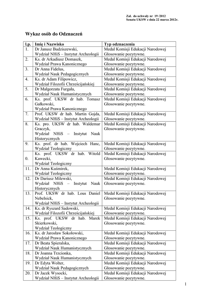 Zał. do uchwały nr 19 /2012 Senatu UKSW z dnia 22 marca 2012r. Wykaz osób do Odznaczeń l.p. Imię i Nazwisko 1. Dr Janusz Budziszewski, Wydział NHiS – Instytut Archeologii 2. Ks. dr Arkadiusz Domaszk, Wydział Prawa Kanonicznego 3. Dr Anna Fidelus, Wydział Nauk Pedagogicznych 4. Ks. dr Adam Filipowicz, Wydział Filozofii Chrześcijańskiej 5. Dr Małgorzata Furgała, Wydział Nauk Humanistycznych 6. Ks. prof. UKSW dr hab. Tomasz Gałkowski, Wydział Prawa Kanonicznego 7. Prof. UKSW dr hab. Martin Gojda, Wydział NHiS – Instytut Archeologii 8. Ks. pro. UKSW dr hab. Waldemar Graczyk, Wydział NHiS – Instytut Nauk Historycznych 9. Ks. prof. dr hab. Wojciech Hanc, Wydział Teologiczny Ks. 1 prof. UKSW dr hab. Witold 0. Kawecki, Wydział Teologiczny 11. Dr Anna Kuśmirek, Wydział Teologiczny 12. Dr Dariusz Milewski, Wydział NHiS – Instytut Nauk Historycznych 13. Prof. UKSW dr hab. Lous Daniel Nebelsick, Wydział NHiS – Instytut Archeologii 14. Ks. dr Ryszard Sadowski, Wydział Filozofii Chrześcijańskiej 15. Ks. prof. UKSW dr hab. Marek Skierkowski, Wydział Teologiczny 16. Ks. dr Jarosław Sokołowski, Wydział Prawa Kanonicznego 17. Dr Beata Spieralska, Wydział Nauk Humanistycznych 18. Dr Joanna Trzcionka, Wydział Nauk Humanistycznych 19. Dr Edyta Wolter, Wydział Nauk Pedagogicznych 20. Dr Jacek Wysocki, Wydział NHiS – Instytut Archeologii Typ odznaczenia Medal Komisji Edukacji Narodowej Głosowanie pozytywne. Medal Komisji Edukacji Narodowej Głosowanie pozytywne. Medal Komisji Edukacji Narodowej Głosowanie pozytywne. Medal Komisji Edukacji Narodowej Głosowanie pozytywne. Medal Komisji Edukacji Narodowej Głosowanie pozytywne. Medal Komisji Edukacji Narodowej Głosowanie pozytywne. Medal Komisji Edukacji Narodowej Głosowanie pozytywne. Medal Komisji Edukacji Narodowej Głosowanie pozytywne. Medal Komisji Edukacji Narodowej Głosowanie pozytywne. Medal Komisji Edukacji Narodowej Głosowanie pozytywne. Medal Komisji Edukacji Narodowej Głosowanie pozytywne. Medal Komisji Edukacji Narodowej Głosowanie pozytywne. Medal Komisji Edukacji Narodowej Głosowanie pozytywne. Medal Komisji Edukacji Narodowej Głosowanie pozytywne. Medal Komisji Edukacji Narodowej Głosowanie pozytywne. Medal Komisji Edukacji Narodowej Głosowanie pozytywne. Medal Komisji Edukacji Narodowej Głosowanie pozytywne. Medal Komisji Edukacji Narodowej Głosowanie pozytywne. Medal Komisji Edukacji Narodowej Głosowanie pozytywne. Medal Komisji Edukacji Narodowej Głosowanie pozytywne. 1 L.p. 1. 2. Imię i Nazwisko P. prof.dr hab. Zbigniew Bania Wydział Nauk Historycznych i Społecznych Ks. prof. dr hab. Stanisław Kobielus Wydział Nauk Historycznych i Społecznych Typ odznaczenia Krzyż Kawalerski Orderu Odrodzenia Polski. Głosowanie pozytywne. Krzyż Kawalerski Orderu Odrodzenia Polski. Głosowanie pozytywne. l.p. 1. Imię i Nazwisko Ks. prof. UKSW dr hab. Stanisław Chrobak Wydział Nauk Pedagogicznych Typ odznaczenia Złoty Krzyż Zasługi. Głosowanie pozytywne. 2. Prof. dr hab. Krzysztof Dybciak Wydział Nauk Humanistycznych Złoty Krzyż Zasługi. Głosowanie pozytywne. 3. Mgr inż. Tatiana Frydrych Administracja - Wydział Nauk Humanistycznych Złoty Krzyż Zasługi. Głosowanie pozytywne. 4. Prof. UKSW dr hab. Paweł Kaczorowski Wydział Nauk Historycznych i Społecznych Złoty Krzyż Zasługi. Głosowanie pozytywne. 5. Prof. UKSW dr hab. Barbara Kałdon Wydział Nauk Pedagogicznych Złoty Krzyż Zasługi. Głosowanie pozytywne. 6. Prof. dr hab. Irina Kurlak Wydział Nauk Pedagogicznych Złoty Krzyż Zasługi. Głosowanie pozytywne. 7. Prof. UKSW dr hab. Grzegorz Makulec Wydział Filozofii Chrześcijańskiej Złoty Krzyż Zasługi. Głosowanie pozytywne. 8. Ks. prof. UKSW dr hab. Bogumil Gacka Wydział Teologiczny Srebrny Krzyż Zasługi. Głosowanie pozytywne. 9. Dr Bartłomiej Gutowski Wydział nauk Historycznych i Społecznych Srebrny Krzyż Zasługi. Głosowanie pozytywne. 10. Prof. UKSW dr hab. Mieczysław Mejor Wydział nauk Humanistycznych Srebrny Krzyż Zasługi. Głosowanie pozytywne. 11. Mgr Arkadiusz Mróz Wydział Prawa kanonicznego Srebrny Krzyż Zasługi. Głosowanie pozytywne. 12. Dr Urszula Nowicka Wydział Prawa Kanonicznego Srebrny Krzyż Zasługi. Głosowanie pozytywne. 13. Dr Helena Pietrzak Wydział Prawa Kanonicznego Srebrny Krzyż Zasługi. Głosowanie pozytywne. 2 14. l.p. 1. 2. 3 4. 5. 6. 7. 8. 9. 10. 11. 12. 13. 14. 15. 16. Prof. UKSW dr hab. Wanda Zagórska Wydział Filozofii Chrześcijańskiej Srebrny Krzyż Zasługi. Głosowanie pozytywne. Imię i Nazwisko Ks. prof. dr hab. Roman Bartnicki Wydział Teologiczny Typ odznaczenia Złoty Medal za Długoletnia Służbę. Głosowanie pozytywne. 39 lat stażu pracy, w UKSW 31 lat. Ks. prof. dr hab. Waldemar Złoty Medal za Długoletnia Służbę. Chrostowski Głosowanie pozytywne. Wydział Teologiczny 30 lat stażu pracy, w UKSW 24 lata. Ks. prof. UKSW dr hab. Leonard Złoty Medal za Długoletnia Służbę. Fic Głosowanie pozytywne. Wydział Teologiczny 31 lat stażu pracy, w UKSW 15 lat. Ks. prof. UKSW dr hab. Marian Złoty Medal za Długoletnia Służbę. Graczyk Głosowanie pozytywne. Wydział Teologiczny 30 lat stażu pracy. Dr Halina Iwaniuk Złoty Medal za Długoletnia Służbę. Wydział Teologiczny Głosowanie pozytywne. 41 lat stażu pracy, w UKSW 17 lat. Ks. dr Rafał Markowski Złoty Medal za Długoletnia Służbę. Wydział Teologiczny Głosowanie pozytywne. 30 lat stażu pracy, w UKSW 15 lat. Dr Mirosław Mikołajczyk Złoty Medal za Długoletnia Służbę. Wydział Teologiczny Głosowanie pozytywne. 36 lat stażu pracy, w UKSW 17 lat. Stanisława Olech Złoty Medal za Długoletnia Służbę. Dział Administracyjno-Gospodarczy Głosowanie pozytywne. 31 lat stażu pracy, w UKSW 18 lat. Adam Podlewski Złoty Medal za Długoletnia Służbę. Dział Administracyjno-Gospodarczy Głosowanie pozytywne. 40 lat stażu pracy, w UKSW 12 lat. Wojciech Szymański Złoty Medal za Długoletnia Służbę. Dział Admin