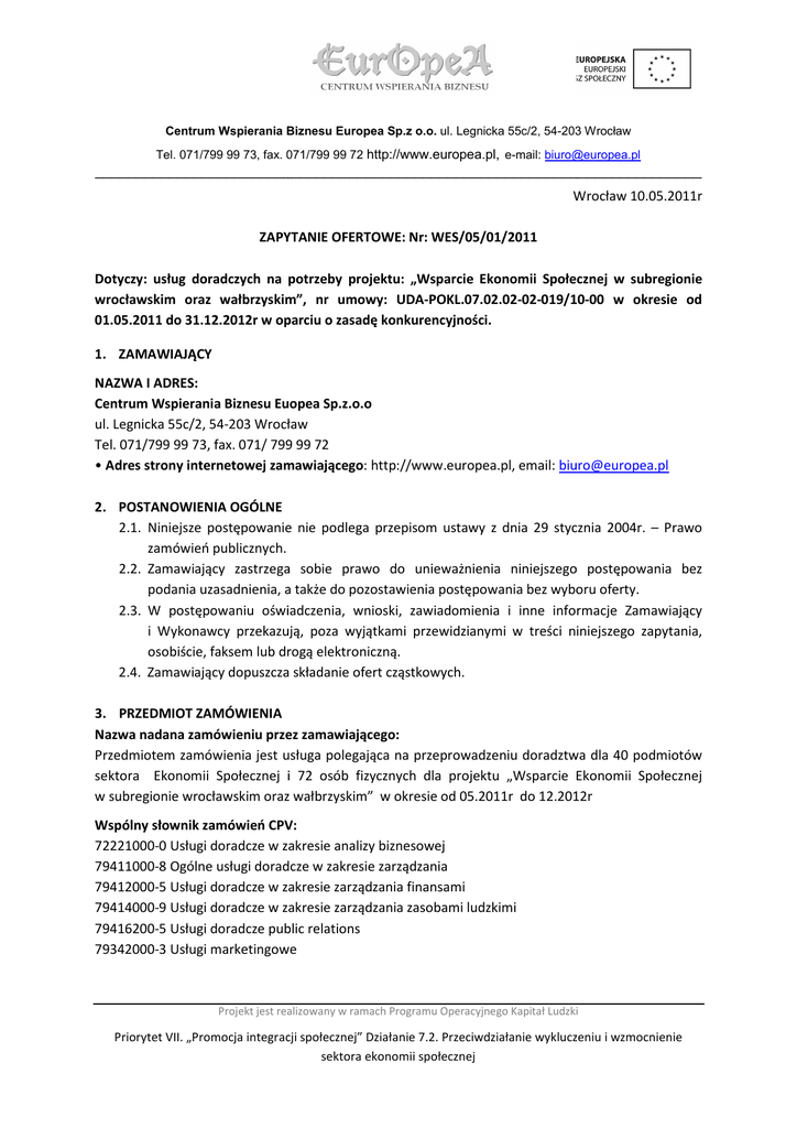 Centrum Wspierania Biznesu Europea Sp.z o.o. ul. Legnicka 55c/2, 54-203 203 Wrocław Tel. 071/799 99 73, fax. 071/799 99 72 http://www.europea.pl, e-mail: [email protected] _________________________________________________ _______________________________________________________ _________________________ Wrocław 10.05.2011r ZAPYTANIE OFERTOWE: Nr: WES/05/01/2011 Dotyczy: usług doradczych na potrzeby projektu: „Wsparcie Ekonomii Społecznej w subregionie wrocławskim oraz wałbrzyskim”, nr umowy: UDA-POKL.07.02.02-02-019/10 019/10-00 w okresie od 01.05.2011 do 31.12.2012r w oparciu opa o zasadę konkurencyjności. 1. ZAMAWIAJĄCY NAZWA I ADRES: uopea Sp.z.o.o Centrum Wspierania Biznesu Eu ul. Legnicka 55c/2, 54-203 203 Wrocław Tel. 071/799 99 73, fax. 071/ 799 99 72 7 • Adres strony internetowej zamawiającego: zamawiającego http://www.europea.pl, email: [email protected] 2. POSTANOWIENIA OGÓLNE 2.1. Niniejsze postępowanie nie podlega przepisom ustawy z dnia 29 stycznia 2004r. – Prawo zamówień publicznych. 2.2. Zamawiający zastrzega sobie prawo do unieważnienia niniejszego postępowania bez podania uzasadnienia, a także do pozostawienia postępowania bez wyboru oferty. 2.3. W postępowaniu oświadczenia, wnioski, zawiadomienia i inne informacje Zamawiający i Wykonawcy przekazują, poza wyjątkami przewidzianymi w treści niniejszego zapytania, osobiście, faksem lub drogą elektroniczną. 2.4. Zamawiający dopuszcza składanie ofert cząstkowych. 3. PRZEDMIOT ZAMÓWIENIA Nazwa nadana zamówieniu przez zamawiającego: Przedmiotem zamówienia jest usługa polegająca na przeprowadzeniu doradztwa dla 40 podmiotów sektora Ekonomii Społecznej i 72 osób fizycznych dla projektu „Wsparcie Ekonomii Społecznej w subregionie ubregionie wrocławskim oraz wałbrzyskim” w okresie od 05.2011r do 12.2012r Wspólny słownik zamówień CPV: 72221000-0 0 Usługi doradcze w zakresie analizy biznesowej 79411000-8 8 Ogólne usługi doradcze w zakresie zarządzania 79412000-5 5 Usługi doradcze w zakresie zakre zarządzania finansami 79414000-9 9 Usługi doradcze w zakresie zarządzania zasobami ludzkimi 79416200-5 5 Usługi doradcze public relations 79342000-3 3 Usługi marketingowe Projekt jest realizowany w ramach Programu Operacyjnego Kapitał Ludzki Priorytet VII. „Promocja integracji społecznej” Działanie 7.2. Przeciwdziałanie wykluczeniu i wzmocnienie sektora ekonomii społecznej Centrum Wspierania Biznesu Europea Sp.z o.o. ul. Legnicka 55c/2, 54-203 203 Wrocław Tel. 071/799 99 73, fax. 071/799 99 72 http://www.europea.pl, e-mail: [email protected] _________________________________________________ _______________________________________________________ _________________________ 79000000-4 4 Usługi biznesowe: prawnicze, marketingowe, konsultingowe, rekrutacja, drukowania drukow i zabezpieczania 79140000-7 7 Doradztwo prawne i usługi informacyjne 66171000-9 9 Doradztwo finansowe 79211000-6 Usługi księgowe 79111000-5 5 Usługi w zakresie doradztwa prawnego. prawnego 3.1. Obszar tematyczny: Doradztwo księgowe Prowadzenie doradztwa w zakresie księgowości dla podmiotów ekonomii społecznej oraz osób fizycznych pragnących założyć podmiot ekonomii społecznej, społecznej, w tym w szczególności: szczególności prowadzenia rachunkowości, rozliczanie dotacji, prawidłowego opisywania dokumentów księgowych, sporządzania sprawozdań finansowych, przestrzeganie zobowiązań podatkowych, terminów składania dokumentów i zeznań. Na doradztwo w zakresie księgowym przewidziane jest 5,27 godziny (około: 5godz, 15min) dla każdego podmiotu ekonomii społecznej oraz po 1 godzinie dla każdej osoby fizycznej. 3.2. Obszar ar tematyczny: Doradztwo prawne Prowadzenie doradztwa w zakresie przepisów prawa dla podmiotów ekonomii społecznej, osób fizycznych pragnących założyć podmiot ekonomii społecznej, oraz zdobyć niezbędną wiedzę w zakresiee działania podmiotów ES, w tym w szczególności: rejestracja, dokonywanie zmian w Krajowym Rejestrze Sądowym, interpretacja przepisów ustawy o działalności pożytku publicznego i o wolontariacie, ustawy o pomocy społecznej, o spółdzielniach socjalnych, socjalny kodeksu postępowania administracyjnego i innych. Na doradztwo w zakresie prawnym przewidziane jest 6 godzin dla każdego podmiotu ekonomii społecznej oraz po 1 godzinie dla każdej osoby fizycznej. 3.3. Obszar tematyczny: Doradztwo marketingowe: Prowadzenie doradztwa w zakresie opracowywania indywidualnych planów rozwoju dla podmiotów ekonomii społecznej oraz osób fizycznych pragnących założyć podmiot ekonomii społecznej, w tym: strategii PR podmiotów ekonomii społecznej, pomoc w przygotowywaniu kampanii promocyjnych ocyjnych , pomoc w zawiązywaniu lokalnych partnerstw i porozumień oraz inne zadania wynikające z marketingu społecznego podmiotów ekonomii społecznej. Na doradztwo w zakresie marketingowym przewidziane jest 5,27 godziny (około: 5godz, 15min) dla każdego podmiotu ekonomii społecznej oraz po 1 godzinie dla każdej osoby fizycznej. Projekt jest realizowany w ramach Programu Operacyjnego Kapitał Ludzki Priorytet VII. „Promocja integracji społecznej” Działanie 7.2. Przeciwdziałanie wykluczeniu i wzmocnienie sektora ekonomii społecznej Centrum Wspierania Biznesu Europea Sp.z o.o. ul. Legnicka 55c/2, 54-203 203 Wrocław Tel. 071/799 99 73, fax. 071/799 99 72 http://www.europea.pl, e-mail: [email protected] _________________________________________________ _______________________________________________________ _________________________ 4. Warunki wymagane od wykonawców. O udzielenie niniejszego zamówienia mogą ubiegać się wykonawcy, którzy: 4.1. Akceptują treść zapytania ofertowego, bez zastrzeżeń – złożenie oferty jest uważane za akceptację treści zapytania. 4.2. O udzielenie zamówienia mogą ubiegać się wykonawcy, którzy złożą kompletną lub cząstkową ofertę, sporządzoną zgodnie z wymag