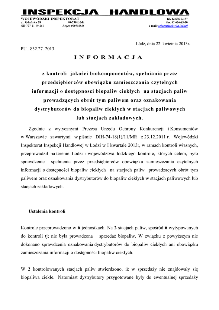 -----------------------------------------------------------------------------------------------------------------------------------------------------------------WOJEWÓDZKI INSPEKTORAT tel. 42 636-03-57 ul. Gdańska 38 90-730 Łódź fax. 42 636-85-50 NIP 727-11-49-261 Regon 000136886 e-mail: [email protected] Łódź, dnia 22 kwietnia 2013r. PU . 832.27. 2013 I N F O R M A C J A z kontroli jakości biokomponentów, spełniania przez przedsiębiorców obowiązku zamieszczania czytelnych informacji o dostępnosci biopaliw ciekłych na stacjach paliw prowadzących obrót tym paliwem oraz oznakowania dystrybutorów do biopaliw ciekłych w stac jach paliwowych lub stacjach zakładowych. Zgodnie z wytycznymi Prezesa Urzędu Ochrony Konkurencji i Konsumentów w Warszawie zawartymi w piśmie DIH-74-18(1)/11/MR z 23.12.2011 r. Wojewódzki Inspektorat Inspekcji Handlowej w Łodzi w I kwartale 2013r, w ramach kontroli własnych, przeprowadził na terenie Łodzi i województwa łódzkiego kontrole, których celem, było sprawdzenie spełnienia przez przedsiębiorców obowiązku zamieszczania czytelnych informacji o dostępności biopaliw ciekłych na stacjach paliw prowadzących obrót tym paliwem oraz oznakowania dystrybutorów do biopaliw ciekłych w stacjach paliwowych lub stacjach zakładowych. Ustalenia kontroli Kontrole przeprowadzono w 6 jednostkach. Na 2 stacjach paliw, spośród 6 wytypowanych do kontroli tj; nie była prowadzona sprzedaż biopaliw. W związku z powyższym nie dokonano sprawdzenia oznakowania dystrybutorów do biopaliw ciekłych ani obowiązku zamieszczania informacji o dostępności biopaliw ciekłych. W 2 kontrolowanych stacjach paliw stwierdzono, iż w sprzedaży nie znajdowały się biopaliwa ciekłe. Natomiast dystrybutory przygotowane były do ewentualnej sprzedaży biopaliwa ciekłego i zostały prawidłowo oznakowane zgodnie z postanowieniami Rozporządzenia Ministra Gospodarki z dnia 18 czerwca 2010 r. w sprawie sposobu oznakowania dystrybutorów używanych na stacjach paliwowych i stacjach zakładowych do biopaliw ciekłych. Przedsiębiorca zamieścił na dystrybutorze i pistolecie nalewczym znaki identyfikacji wizualnej BIO 100 oraz niezbędne informacje dla odbiorców wymagane przepisami. W pozostałych 2 kontrolowanych jednostkach tego samego przedsiębiorcy oferowano do sprzedaży biopaliwa. Sprawdzono więc zgodnie z postanowieniami: - art. 26 ustawy z dnia 25 sierpnia 2006r. o biokomponentach i biopaliwach ciekłych (Dz.U Nr 169, poz. 1199 ze zm.) - prawidłowość zamieszczenia informacji o dostępności biopaliw - art. 25 ww. ustawy z dnia 25 sierpnia 2006r. o biokomponentach i biopaliwach ciekłych (Dz.U Nr 169, poz. 1199 ze zm.) - oznakowanie dystrybutorów. Stwierdzono, że w 2 ww. stacjach paliw zamieszczone były czytelne i widoczne informacje o dostępności biopaliw ciekłych a dystrybutory do biopaliw ciekłych oznakowane były w sposób umożliwiający identyfikację rodzaju biopaliwa i udziałów objętościowych, wyrażonych w procentach biokomponentów zawartych w paliwie. Dystrybutory i pistolety nalewcze do biopaliw oznakowane były znakiem identyfikacji wizualnej zgodnie z postanowieniami rozporządzenia Ministra Gospodarki z dnia 18 czerwca 2010r. w sprawie sposobu oznakowania dystrybutorów używanych na stacjach paliwowych i stacjach zakładowych do biopaliw ciekłych (Dz. U Nr 122, poz. 830). W powyższym zakresie nieprawidłowości nie stwierdzono. Legalność działania przedsiębiorcy Wszystkie przeprowadzone kontrole (6) były poprzedzone doręczeniem zawiadomień o zamiarze wszczęcia kontroli. Legalność działania przedsiębiorcy sprawdzono, zgodnie z zakresem kontroli określonym w upoważnieniu, na 4 stacjach paliw. 2 Działalność gospodarcza kontrolowanego przedsiębiorcy została zarejestrowana w Krajowym Rejestrze Sądowym. Stwierdzono, że faktycznie prowadzona działalność gospodarcza była zgodna z zakresem określonym we wpisie do KRS. Ponadto ustalono, że kontrolowany przedsiębiorca posiada ważną koncesję na obrót paliwami ciekłymi. Nie stwierdzono nieprawidłowości w przedmiotowym zakresie. Na pozostałych 2 stacjach nie sprawdzano legalności działania przedsiębiorców. Prawidłowość uwidaczniana cen Prawidłowość przestrzegania przepisów ustawy z dnia 5 lipca 2001 r. o cenach (Dz. U. nr 97, poz.1050 z późn. zm.) oraz rozporządzenia Ministra Finansów z dnia 10 czerwca 2002 r. w sprawie szczegółowych zasad uwidaczniania cen towarów i usług oraz sposobu oznaczania ceną towarów przeznaczonych do sprzedaży (Dz. U. nr 99, poz. 894 z późn. zm.) sprawdzono zgodnie z zakresem kontroli na 4 stacjach paliw. W powyższym zakresie nieprawidłowości nie stwierdzono, ceny paliw podane były w sposób czytelny dla kierowców pojazdów poruszających się po drogach publicznych i zbliżających się do stacji paliw tj. zgodnie z § 12 ust. 1 ww. rozporządzenia. Na stacji paliw sprawdzono również prawidłowość uwidaczniania cen przy towarach handlowych oferowanych na stacjach paliw. Stwierdzono brak oznaczenia ceną w sposób bezpośredni towarów w cenie 5 zł i powyżej, tj. 7 partii akcesoriów do samochodów, co stanowiło naruszenie przepisów § 9 ust. 1 rozporządzenia Ministra Finansów z dnia 10 czerwca 2002 r. w sprawie szczegółowych zasad uwidaczniania cen towarów i usług oraz sposobu oznaczania towarów przeznaczonych do sprzedaży (Dz. U. nr 99, poz. 894 z późn. zm.). Mając na uwadze stwierdzoną nieprawidłowość na podstawie art. 16 ust. 1, pkt 5 ustawy z dnia 15 grudnia 2000 r. o Inspekcji Handlowej (tekst jednolity: Dz. U. nr 151, poz. 1219 z 2009 r. ze zm.) zażądano niezwłocznego usunięcia uchybień organizacyjnych poprzez oznaczenie towarów ceną w sposób bezpośredni na poszczególnych egzemplarzach. W toku kontroli przedsiębiorca wykonał postawione żądanie inspektorów. 3 W związku z brakiem oznaczenia ceną w sposób bezpośredni towarów, wobec osoby prow