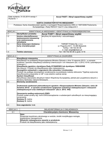 Data wydania: 31.03.2014 wersja 1 Wydanie: 1 Acryl FAST / Akryl szpachlowy szybki KARTA CHARAKTERYSTYKI MIESZANINY Podstawa: Karta charakterystyki zgodna z wymogami Rozporządzenia (WE) nr 1907/2006 Parlamentu Europejskiego i Rady REACH Tytuł IV oraz Załącznik II SEKCJA1. IDENTYFIKACJA MIESZANINY I IDENTYFIKACJA PRZEDSIĘBIORSTWA 1.1 Identyfikator produktu Acryl FAST / Akryl szpachlowy szybki 1.2 akrylowy kit szpachlowy i uszczelniający Istotne zidentyfikowane zastosowania mieszaniny oraz zastosowania odradzane 1.3 TARGET Polska Sp. z o.o. Dane dotyczące dostawcy ul. Pogodna 63/1; 15-365 Białystok karty charakterystyki Tel/fax: +48 742 06 36 e- mail: [email protected] 1.4 Tel: +48 742 06 36 w godz. 8-16 Telefon alarmowy IDENTYFIKACJA ZAGROśEŃ SEKCJA 2 2.1 Klasyfikacja mieszaniny Klasyfikacja na podstawie Rozporządzenia Ministra Zdrowia z dnia 10 sierpnia 2012 r. w sprawie kryteriów i sposobu klasyfikacji substancji chemicznych i ich mieszanin (Dz. U.2012.1018 z późniejszymi zmianami ): Klasyfikacja zgodnie z dyrektywa Rady 67/548/EWG lub dyrektywa 1999/45/WE Nie dotyczy. Produkt nie klasyfikowany jako niebezpieczny Szczególne wskazówki o zagroŜeniu dla człowieka i środowiska: Produkt nie podlega obowiązkowi oznakowania na podstawie metody obliczania "Ogólnej wytycznej klasyfikowania preparatów w UE" w jej ostatnio waŜnej wersji. System klasyfikacji: Klasyfikacja odpowiada aktualnym listom Wspólnoty Europejskiej, jednak jest uzupełniona danymi z literatury fachowej i danymi firmowymi. 2.2 Elementy oznakowania Znakowanie opakowań jednostkowych zgodnie z Rozporządzenie Ministra Zdrowia z dnia 20 kwietnia 2012r. w sprawie oznakowania opakowań substancji niebezpiecznych i mieszanin niebezpiecznych oraz niektórych mieszanin2 (Dz.U. 2012. 445) Oznaczenia według wytycznych EWG: Produkt został uznany wg. norm EWG/zarządzenia o substancjach szkodliwych za niewymagający oznaczenia. Zestawy R: Ŝadne Zestawy S: Ŝadne 2.3 Inne zagroŜenia: brak SEKCJA 3 3.1 SKŁAD/INFORMACJA O SKŁADNIKACH Charakterystyka chemiczna: Mieszaniny Opis: Dyspersja kopolimeru akrylowego w wodzie, środki modyfikujące reologie, wypełniacze nieorganiczne. Składniki niebezpieczne zawarte w produkcie: Produkt nie klasyfikowany jako niebezpieczny Strona 1 z 6 SEKCJA 4. ŚRODKI PIERWSZEJ POMOCY 4.1 Opis środków pierwszej pomocy Wdychanie Dostarczyć świeŜe powietrze, w razie dolegliwości wezwać lekarza. Skóra Zmyć duŜa ilością wody lub wody z mydłem. W przypadku podraŜnienia skóry zgłosić się do lekarza (pokazać etykietę) Oczy Płukać oczy z otwarta powieka przez kilka minut pod bieŜąca woda. W przypadku utrzymującej się dolegliwości zasięgnąć porady lekarza. Połknięcie Przy trwałych dolegliwościach porozumieć się z lekarzem. 4.2 NajwaŜniejsze ostre i opóźnione objawy oraz skutki naraŜenia Brak dostępnych dalszych istotnych danych 4.3 Wskazania dotyczące wszelkiej natychmiastowej pomocy lekarskiej i szczególnego postępowania z poszkodowanym Brak dostępnych dalszych istotnych danych SEKCJA 5. POSTĘPOWANIE W PRZYPADKU POśARU 5.1 Środki gaśnicze: Odpowiednie środki gaśnicze: Stosować ditlenek węgla, suche proszki gaśnicze, zwykłą pianę gaśniczą, rozpyloną wodę w zaleŜności od otoczenia. Nieodpowiednie środki gaśnicze: Brak danych 5.2 Szczególne zagroŜenie związane z mieszaniną: Podczas spalania mogą uwalniać się następujące substancje/ grupy substancji: Dwutlenek węgla, tlenek węgla, 5.3 Informacje dla straŜy poŜarnej: Nosić izolacyjne aparaty oddechowe z niezaleŜnym źródłem powietrza i kombinezony ochronne. SEKCJA 6 POSTĘPOWANIE W PRZYPADKU NIEZAMIERZONEGO UWOLNIENIA DO ŚRODOWISKA 6.1 Indywidualne środki ostroŜności, wyposaŜenie ochronne i procedury w sytuacjach awaryjnych: Produkt wraz z woda tworzy warstwę poślizgową Środki ostroŜności w zakresie ochrony środowiska: Nie dopuszczać do przedostawania się produktu do kanalizacji, wód powierzchniowych i wód gruntowych. W przypadku skaŜenia środowiska zawiadomić odpowiednie władze lokalne. Metody i materiały zapobiegające rozprzestrzenianiu się skaŜenia i słuŜące do usuwania skaŜenia: Zebrać za pomocą materiału wiąŜącego ciecze (piasek, ziemia okrzemkowa, materiał wiąŜący kwasy, materiał wiąŜący uniwersalny, trociny). Materiał zebrany usunąć w sposób zgodny z przepisami. Miejsce wypadku dokładnie oczyścić; nadają się: ciepła woda i środek myjący. Odniesienia do innych sekcji Nie powstają Ŝadne materiały niebezpieczne. 6.2. 6.3. 6.4. SEKCJA 7. POSTĘPOWANIE Z MIESZANINĄ I JEJ MAGAZYNOWANIE 7.1 Środki ostroŜności dotyczące bezpiecznego postępowania: Środki specjalne nie są konieczne. Wskazówki dla ochrony przeciwpoŜarowej i przeciwwybuchowej: Nie są potrzebne szczególne zabiegi. 7.2. Warunki bezpiecznego magazynowania, łącznie z informacjami dotyczącymi wszelkich wzajemnych niezgodności. Składowanie: Wymagania w stosunku do pomieszczeń składowych i zbiorników: Brak szczególnych wymagań. Wskazówki odnośnie wspólnego składowania: Nie konieczne. Dalsze wskazówki odnośnie warunków składowania: Strona 2 z 6 SEKCJA 7. 7.3 POSTĘPOWANIE Z MIESZANINĄ I JEJ MAGAZYNOWANIE Składować w miejscu chłodnym. Chronić przed mrozem. Przechowywać w temperaturze od + 5 °C do + 35 °C. Szczególne zastosowania końcowe Brak danych KONTROLA NARAśENIA/ ŚRODKI OCHRONY INDYWIDUALNEJ SEKCJA 8. 8.1. Parametry dotyczące kontroli Składniki wraz z kontrolowanymi wartościami granicznymi zaleŜnymi od miejsca pracy: Produkt nie zawiera znaczących ilości materiałów, których wartości graniczne musiałyby być kontrolowane pod katem warunków miejsca pracy. 8.2 Kontrola naraŜenia: Środki ochrony indywidualnej: NaleŜy przestrzegać zwyczajnych środków ostroŜności przy obchodzeniu się z chemikaliami. Unikać styczności z oczami i skóra. Ochrona dróg oddechowych: Nie konieczna. Ochrona skóry rą