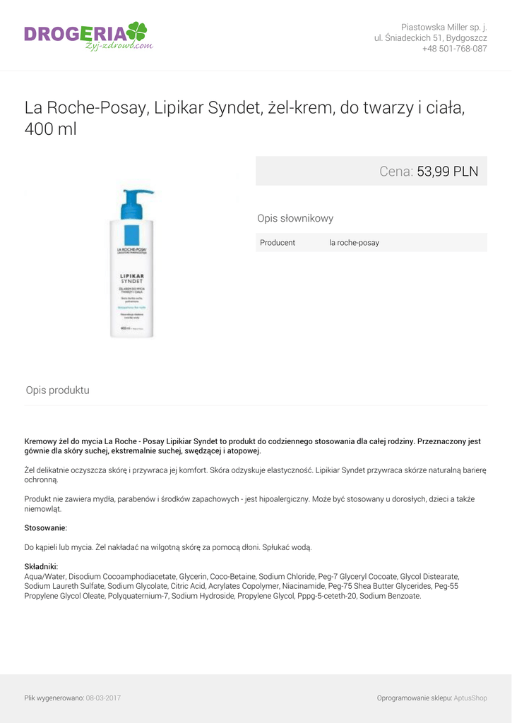 Piastowska Miller sp. j. ul. Śniadeckich 51, Bydgoszcz +48 501-768-087 La Roche-Posay, Lipikar Syndet, żel-krem, do twarzy i ciała, 400 ml Cena: 53,99 PLN Opis słownikowy Producent la roche-posay Opis produktu Kremowy żel do mycia La Roche - Posay Lipikiar Syndet to produkt do codziennego stosowania dla całej rodziny. Przeznaczony jest gównie dla skóry suchej, ekstremalnie suchej, swędzącej i atopowej. Żel delikatnie oczyszcza skórę i przywraca jej komfort. Skóra odzyskuje elastyczność. Lipikiar Syndet przywraca skórze naturalną barierę ochronną. Produkt nie zawiera mydła, parabenów i środków zapachowych - jest hipoalergiczny. Może być stosowany u dorosłych, dzieci a także niemowląt. Stosowanie: Do kąpieli lub mycia. Żel nakładać na wilgotną skórę za pomocą dłoni. Spłukać wodą. Składniki: Aqua/Water, Disodium Cocoamphodiacetate, Glycerin, Coco-Betaine, Sodium Chloride, Peg-7 Glyceryl Cocoate, Glycol Distearate, Sodium Laureth Sulfate, Sodium Glycolate, Citric Acid, Acrylates Copolymer, Niacinamide, Peg-75 Shea Butter Glycerides, Peg-55 Propylene Glycol Oleate, Polyquaternium-7, Sodium Hydroside, Propylene Glycol, Pppg-5-ceteth-20, Sodium Benzoate. Plik wygenerowano: 08-03-2017 Oprogramowanie sklepu: AptusShop Piastowska Miller sp. j. ul. Śniadeckich 51, Bydgoszcz +48 501-768-087 Plik wygenerowano: 08-03-2017 Powered by TCPDF (www.tcpdf.org) Oprogramowanie sklepu: AptusShop