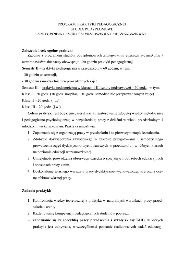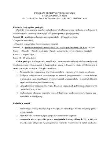 PROGRAM PRAKTYKI PEDAGOGICZNEJ STUDIA PODYPLOMOWE ZINTEGROWANA EDUKACJA PRZEDSZKOLNA I WCZESNOSZKOLNA Założenia i cele ogólne praktyki Zgodnie z programem studiów podyplomowych Zintegrowana edukacja przedszkolna i wczesnoszkolna słuchaczy obowiązuje 120 godzin praktyki pedagogicznej. Semestr II – praktyka pedagogiczna w przedszkolu – 60 godzin, w tym: - 30 godzin obserwacji, - 30 godzin samodzielnie przeprowadzonych zajęć Semestr III – praktyka pedagogiczna w klasach I-III szkoły podstawowej – 60 godz., w tym: Klasa I – 20 godz. (10 godz. hospitacji, 10 godz. samodzielnie przeprowadzonych zajęć) Klasa II – 20 godz. (j.w.) Klasa III – 20 godz. (j.w.) Celem praktyki jest bogacenie, weryfikacja i zastosowanie zdobytej wiedzy metodycznej i pedagogiczno-psychologicznej w bezpośredniej pracy z dziećmi w wieku przedszkolnym i młodszym wieku szkolnym. Praktyka umożliwia: 1. Zapoznanie się z organizacją pracy w przedszkolu i na pierwszym etapie kształcenia. 2. Zdobycie doświadczenia zawodowego w zakresie przygotowania i samodzielnego prowadzenia zajęć dydaktyczno-wychowawczych w przedszkolu i w różnych klasach na poziomie edukacji wczesnoszkolnej. 3. Umiejętność prowadzenia obserwacji dziecka o specjalnych potrzebach edukacyjnych i sposobach pracy z nim. 4. Doskonalenie własnego warsztatu pracy dydaktyczno-wychowawczej, krytyczną ocenę efektów własnej pracy. Zadania praktyki: 1. Konfrontacja wiedzy teoretycznej z praktyką w naturalnych warunkach pracy przedszkola i szkoły 2. Kształtowanie kompetencji pedagogicznych studentów poprzez: zapoznanie się ze specyfiką pracy przedszkola i szkoły (klasy I-III), w których praktyka jest odbywana, w szczególności poznanie realizowanych zadań edukacyj- nych, zasad organizacji grupy, organizacji dnia oraz prowadzonej dokumentacji nauczyciela-wychowawcy; obserwowanie czynności podejmowanych przez opiekuna praktyki w toku prowadzonych przez niego zajęć oraz aktywności dzieci, toku metodycznego zajęć, stosowanych metod i form pracy oraz wykorzystywanych pomocy dydaktycznych, interakcji dorosły – dziecko oraz interakcji między dziećmi w toku zajęć, procesów komunikowania interpersonalnego i społecznego w grupie, ich prawidłowości i zakłóceń, sposobów aktywizowania i dyscyplinowania dzieci oraz różnicowania poziomu ich aktywności, działań podejmowanych przez opiekuna praktyki na rzecz zapewnienia bezpieczeństwa i zachowania dyscypliny, organizacji przestrzeni w sali, sposobu jej zagospodarowania (ustawienie mebli, wyposażenie, dekoracje); współdziałanie z opiekunem praktyki w planowaniu i przeprowadzaniu zajęć, organizowaniu pracy w grupach, przygotowywaniu pomocy dydaktycznych, wykorzystywaniu środków multimedialnych i technologii informacyjnej w pracy dydaktycznej, podejmowaniu działań na rzecz dzieci ze specjalnymi potrzebami edukacyjnymi, w tym uczniów szczególnie uzdolnionych, pełnienie roli nauczyciela, w szczególności: planowanie zajęć, formułowanie celów, dobór metod i form pracy oraz środków dydaktycznych, dostosowywanie metod i form pracy do realizowanych treści, etapu edukacyjnego oraz dynamiki grupy/klasy, organizację i prowadzenie zajęć w oparciu o samodzielnie opracowywane scenariusze, dostosowywanie podejmowanych działań do możliwości i ograniczeń dzieci ze specjalnymi potrzebami edukacyjnymi, diagnozowanie poziomu umiejętności dzieci, podejmowanie działań wychowawczych w toku pracy dydaktycznej w miarę pojawiających się problemów, w sytuacjach: zagrożenia bezpieczeństwa, naruszania praw innych, nieprzestrzegania ustalonych zasad; podejmowanie współpracy z innymi nauczycielami oraz specjalistami pracującymi w przedszkolu/szkole (pedagogiem, psychologiem, logopedą, terapeutą); analizę i interpretację zaobserwowanych albo doświadczanych sytuacji i zdarzeń pedagogicznych, w tym: prowadzenie dokumentacji praktyki, konfrontowanie wiedzy teoretycznej z praktyką, ocena własnego funkcjonowania w toku pełnienia roli nauczyciela (dostrzeganie swoich mocnych i słabych stron), ocena przebiegu prowadzonych zajęć oraz realizacji zamierzonych celów, konsultacje z opiekunem praktyk w celu omówienia obserwowanych i prowadzonych zajęć. Cele szczegółowe: Student pozna organizację pracy przedszkola/szkoły (klasy I-III), organizację dnia, programy edukacyjne obowiązujące w danej grupie/klasie, dokumentację prowadzoną przez nauczyciela-wychowawcę; Student nawiąże kontakt z dzieckiem/uczniem - włączy się w zabawę dziecka lub ją zainicjuje; Student oceni obserwowane zajęcia i sporządzi protokoły obserwacyjne wraz z uwagami i wnioskami; Student napisze poprawnie scenariusze zajęć i przygotuje pomoce dydaktyczne potrzebne do ich przeprowadzenia; Student przeprowadzi zajęcia zgodnie z napisanymi przez siebie i zatwierdzonymi przez opiekuna praktyk scenariuszami; Student włączy się aktywnie w różne formy działalności przedszkola/szkoły. Organizacja praktyki W czasie praktyki student przyjmuje na siebie obowiązki nauczyciela-praktykanta i jest zobowiązany do pracy w przedszkolu (60 godz.)/szkole (klasy I-III) – 60 godz., co winno znaleźć potwierdzenie w Dzienniku Praktyk. Czas pracy studenta w przedszkolu/szkole jest przewidziany na zapoznanie się z pracą nauczyciela, hospitowanie zajęć, konsultacje związane z przygotowaniem zajęć, prowadzenie i omawianie zajęć, na udział w Radzie Pedagogicznej, zespole samokształceniowym, spotkaniu z rodzicami dzieci (o ile będą one miały miejsce w czasie odbywania praktyki) lub w innych formach działań wychowawczych i dydaktycznych (imprezy i uroczystości przedszkolne/szkolne, zajęcia dodatkowe – np. wyrównawcze, logopedyczne, świetlicowe). Student przestrzega przepisów dyscypliny pracy, BHP i tajemnicy służbowej. Ocena i zaliczenie praktyki 1. Podstawą do zaliczenia praktyki jest wypełnienie przez słuchacza wszystkich czynności i obowią