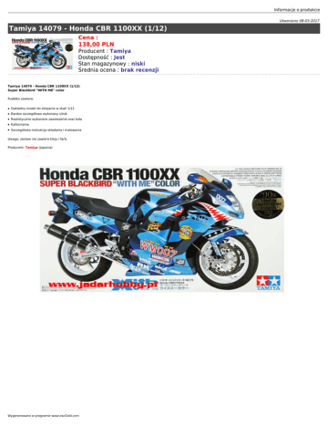 Informacje o produkcie Utworzono 08-03-2017 Tamiya 14079 - Honda CBR 1100XX (1/12) Cena : 138,00 PLN Producent : Tamiya Dostępność : Jest Stan magazynowy : niski Średnia ocena : brak recenzji Tamiya 14079 - Honda CBR 1100XX (1/12) Super Blackbird "WITH ME" color Pudełko zawiera: ● Dokładny model do sklejania w skali 1/12 ● Bardzo szczegółowo wykonany silnik ● Realistycznie wykonane zawieszenie oraz koła ● Kalkomanię ● Szczegółowa instrukcja składania i malowania Uwaga: zestaw nie zawiera kleju i farb. Producent: Tamiya (Japonia) Wygenerowano w programie www.oscGold.com Ważne informacje: Prosimy o dokładne zapoznanie się z zasadami działania naszego sklepu. To bardzo ważne i pozwoli na uniknięcie nieporozumień związanych z koniecznością oczekiwania na przesyłkę. Wszystkie zamówienia realizujemy w kolejności zgłoszeń. Wybranie "przesyłka priorytetowa" jako sposobu wysyłki nie oznacza, że paczka zostanie wysłana na drugi dzień. To tylko rodzaj usługi pocztowej. Firma Jadar-Model jest właścicielem dwóch sklepów. Jeden z nich to sklep internetowy, drugi zaś jest prawdziwy i mieści się w Warszawie, stolicy Polski. Te same modele i akcesoria oferowane w sklepie internetowym sprzedawane są w jednocześnie w obu sklepach. Ponieważ nasza oferta jest bardzo duża nie mamy magazynu z wielką ilością tych samych przedmiotów. Może zdarzyć się, że model, który chcesz kupić został sprzedany w drugim sklepie. Wtedy zostaniesz powiadomiony emailem, że realizacja Twojego zamówienia będzie dłuższa, ponieważ musimy uzupełnić magazyn i czekamy na dostawę od producenta. Prosimy o cierpliwość i wyrozumiałość. Nie ponosimy odpowiedzialności za różnicę w zawartości pudełka w stosunku do prezentowanego zdjęcia. Zdjęcia są zazwyczaj reklamówkami i mogą zawierać również inne części, które nie wchodzą w skład danego produktu. Salon Modelarski Jadar-Model Ul. Jagiellońska 58, 03-468 Warszawa (przy Pl.Hallera) Informacje o produkcie tel.(22) 403-34-30 (w sprawie zamówień prosimy dzwonić: (22) 620-05-39) Tutaj jesteśmy - kliknij poniższy link: Warszawa, Jagiellońska 58 sklep jest czynny w godz.: pon.-pt. 11.oo 19.oo sobota 10.oo 14.oo Wygenerowano w programie www.oscGold.com