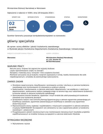 Ministerstwo Edukacji Narodowej w Warszawie Ogłoszenie o naborze nr 5599 z dnia 18 listopada 2016 r. OFERTY DO WYMIAR ETATU STANOWISKA 1 1 02 grudnia 2016 STATUS DODATKOWE archiwalny Dyrektor Generalny poszukuje kandydatów\kandydatek na stanowisko: główny specjalista do spraw: oceny efektów i jakości kształcenia zawodowego w Wydziale Jakości Kształcenia Departamentu Kształcenia Zawodowego i Ustawicznego MIEJSCE WYKONYWANIA PRACY: ADRES URZĘDU: Warszawa Ministerstwo Edukacji Narodowej al. J.Ch. Szucha 25 00-918 Warszawa WARUNKI PRACY Warunki pracy: krajowe lub zagraniczne wyjazdy służbowe częste reprezentowanie urzędu na zewnątrz Narzędzia i materiały pracy: komputer i inne urządzenia biurowe; Możliwość poruszania się po budynku: budynek wyposażony w windy, toalety dostosowane dla osób niepełnosprawnych, schodołaz do ewentualnego wykorzystania. ZAKRES ZADAŃ Określanie zasad oceniania, klasyfikowania i promowania uczniów i słuchaczy w zakresie kształcenia zawodowego oraz monitorowanie ich stosowania w praktyce szkolnej Nadzorowanie i koordynowanie, w zakresie właściwości departamentu i we współpracy z właściwym departamentem, wykonywania nadzoru pedagogicznego na terenie kraju oraz nadzorowanie działalności kuratorów oświaty w obszarze kształcenia zawodowego Opracowywanie wzorów świadectw, dyplomów i innych druków dla szkół prowadzących kształcenie zawodowe oraz kształcenie dorosłych Sprawowanie nadzoru nad Centralną Komisją Egzaminacyjną w zakresie egzaminów potwierdzających kwalifikacje zawodowe, egzaminów potwierdzających kwalifikacje w zawodzie oraz egzaminów eksternistycznych Reprezentowanie strony rządowej i współdziałanie z instytucjami europejskimi w zakresie wdrożenia inicjatywy EQARF/EQAVET (Europejskich ram odniesienia na rzecz zapewniania jakości w kształceniu zawodowym i ustawicznym) Przygotowywanie założeń merytorycznych oraz monitorowanie merytorycznych rezultatów projektów współfinansowanych ze środków funduszy europejskich w zakresie właściwości Wydziału WYMAGANIA NIEZBĘDNE Wykształcenie: wyższe staż pracy: 4 lata w obszarze oświaty ukończone formy doskonalenia zawodowego w zakresie nadzoru pedagogicznego posiadanie przygotowania pedagogicznego znajomość języka angielskiego na poziomie dobrym (B1) znajomość przepisów prawa oświatowego, ze szczególnym uwzględnieniem zagadnień dotyczących kształcenia zawodowego i ustawicznego oraz nadzoru pedagogicznego znajomość zasad funkcjonowania administracji publicznej (w zakresie podziału, zasad organizacji i działania), w tym służby cywilnej (w zakresie organizacji s.c., uprawnień i obowiązków członków korpusu służby cywilnej) znajomość przepisów Kodeksu postępowania administracyjnego w zakresie przepisów ogólnych, załatwiania skarg i wniosków oraz wydawania decyzji administracyjnych kreatywność samodzielność umiejętność współpracy odporność na stres Posiadanie obywatelstwa polskiego Korzystanie z pełni praw publicznych Nieskazanie prawomocnym wyrokiem za umyślne przestępstwo lub umyślne przestępstwo skarbowe WYMAGANIA DODATKOWE Wykształcenie: wyższe magisterskie. Tytuł zawodowy inżynier/magister inżynier doświadczenie zawodowe: 1 rok w przeprowadzaniu egzaminów potwierdzających kwalifikacje w zawodzie/zawodowe funkcja egzaminatora w systemie egzaminów zawodowych DOKUMENTY I OŚWIADCZENIA NIEZBĘDNE Życiorys/CV i list motywacyjny Kopie dokumentów potwierdzających spełnienie wymagania niezbędnego w zakresie wykształcenia Kopie dokumentów potwierdzających spełnienie wymagania niezbędnego w zakresie doświadczenia zawodowego / stażu pracy kopie dokumentów potwierdzających znajomość języka angielskiego na wymaganym poziomie lub oświadczenie o jego znajomości na wymaganym poziomie kopie dokumentów potwierdzających ukończone formy doskonalenia zawodowego w zakresie nadzoru pedagogicznego kopie dokumentów potwierdzających posiadanie przygotowania pedagogicznego Oświadczenie o posiadaniu obywatelstwa polskiego albo kopia dokumentu potwierdzającego posiadanie polskiego obywatelstwa Oświadczenie o wyrażeniu zgody na przetwarzanie danych osobowych do celów naboru Oświadczenie o korzystaniu z pełni praw publicznych Oświadczenie o nieskazaniu prawomocnym wyrokiem za umyślne przestępstwo lub umyślne przestępstwo skarbowe DOKUMENTY I OŚWIADCZENIA DODATKOWE kopia dokumentu potwierdzającego niepełnosprawność - w przypadku kandydatek/kandydatów, zamierzających skorzystać z pierwszeństwa w zatrudnieniu w przypadku, gdy znajdą się w gronie najlepszych kandydatek/kandydatów kopie dokumentów potwierdzających spełnienie wymagania posiadania wymagania wyższego magisterskiego; tytuł zawodowy inżynier/magister inżynier kopie dokumentów potwierdzających 1 rok doświadczenia zawodowego w przeprowadzaniu egzaminów potwierdzających kwalifikacje w zawodzie/zawodowe kopie dokumentów potwierdzających funkcję egzaminatora w systemie egzaminów zawodowych TERMINY I MIEJSCE SKŁADANIA DOKUMENTÓW Dokumenty należy złożyć do: 02 grudnia 2016 r. Decyduje data: stempla pocztowego / osobistego dostarczenia oferty do urzędu Miejsce składania dokumentów: Ministerstwo Edukacji Narodowej al. J.CH. Szucha 25, pok.55 00-918 Warszawa (z dopiskiem „Oferta pracy DKZU, WJK, DKZU/WJK/GS_3) INNE INFORMACJE: W miesiącu poprzedzającym datę upublicznienia ogłoszenia wskaźnik zatrudnienia osób niepełnosprawnych w urzędzie, w rozumieniu przepisów o rehabilitacji zawodowej i społecznej oraz zatrudnianiu osób niepełnosprawnych, nie wynosi co najmniej 6%. Do składania dokumentów zachęcamy również osoby niepełnosprawne. Oferty złożone po terminie (decyduje data stempla pocztowego) lub oferty niekompletne (tj. niezawierające prawidłowych i podpisanych oświadczeń oraz wszystkich wymaganych dokumentów wymienionych w części „dokumenty i oświadczenia niezbę