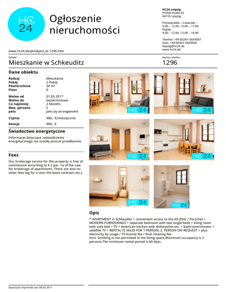 Ogłoszenie nieruchomości HC24 Leipzig Prellerstraße 62 04155 Leipzig Poniedziałek – Czwartek : 9.00 – 12.00, 13.00 – 17.00 Piątek : 9.00 – 12.00, 13.00 – 16.00 Telefon: +49 (0)341-5643007 Faks: +49 (0)341-5643044 [email protected] www.hc24.de www.hc24.de/pl/object_le-1296.htm Obiekt Numer obiektu Mieszkanie w Schkeuditz 1296 Dane obiektu Rodzaj Pokój Powierzchnia Floor Mieszkania 2 Pokój 34 m² 0 Wolne od Wolne do Co najmniej Max. persons pets 01.05.2017 bezterminowo 2 Months 2 pets by arrangement Czynsz 480,- €/miesięcznie Kaucja 960,- € Świadectwo energetyczne Informacje dotyczące zaświadczenia energetycznego nie zostały jeszcze przedłożone. Fees Our brokerage service for this property is free of commission according to § 2 par. 1a of the Law for brokerage of apartments. There are also no other fees (eg for a visit, the lease contract, etc.). Opis * APARTMENT in Schkeuditz + convenient access to the A9 (DHL / Porsche) + MODERN FURNISHINGS + separate bedroom with two single beds + living room with sofa bed + TV + American kitchen with dishwasher etc. + bathroom/shower + satellite TV + RENTAL IS VALID FOR 1 PERSON, 2. PERSON ON REQUEST + plus electricity by usage / TV license fee / final cleaning fee Hint: Smoking is not permitted in the living space.Maximum occupancy is 2 persons.The minimum rental period is 60 days. Exposição imprimida aos 08.03.2017 Powered by TCPDF (www.tcpdf.org)