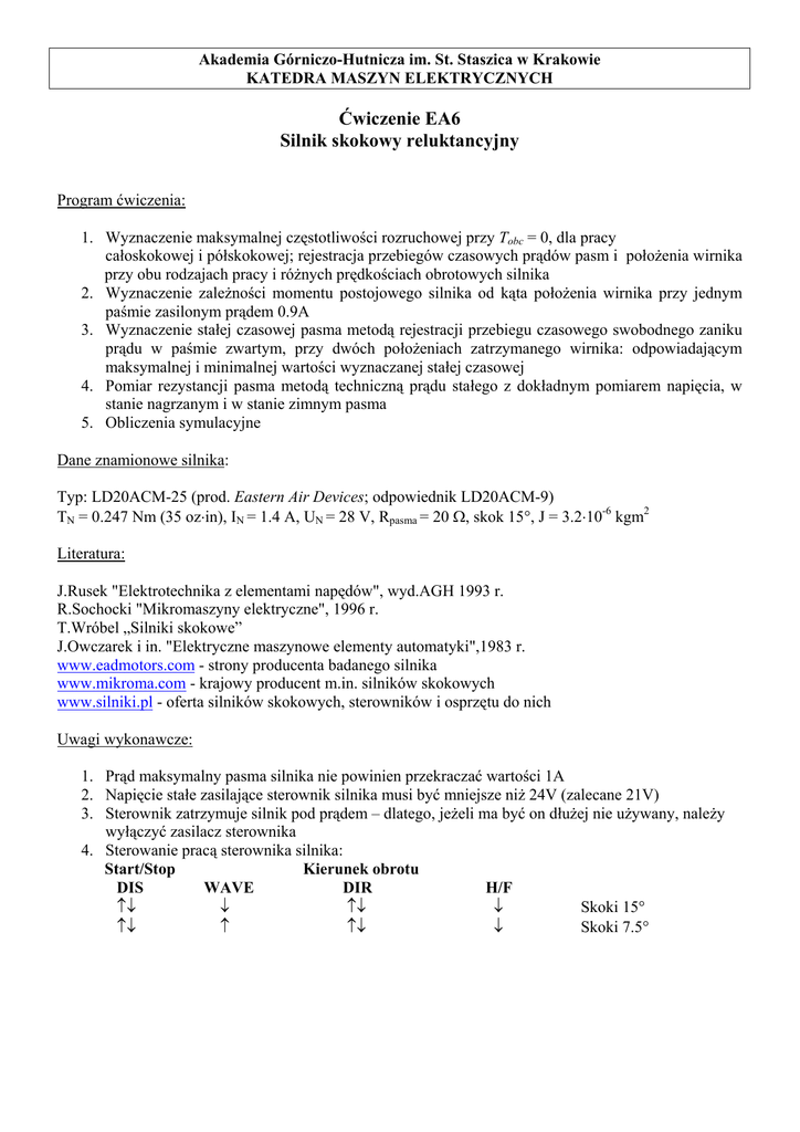 Akademia Górniczo-Hutnicza im. St. Staszica w Krakowie KATEDRA MASZYN ELEKTRYCZNYCH Ćwiczenie EA6 Silnik skokowy reluktancyjny Program ćwiczenia: 1. Wyznaczenie maksymalnej częstotliwości rozruchowej przy Tobc = 0, dla pracy całoskokowej i półskokowej; rejestracja przebiegów czasowych prądów pasm i położenia wirnika przy obu rodzajach pracy i różnych prędkościach obrotowych silnika 2. Wyznaczenie zależności momentu postojowego silnika od kąta położenia wirnika przy jednym paśmie zasilonym prądem 0.9A 3. Wyznaczenie stałej czasowej pasma metodą rejestracji przebiegu czasowego swobodnego zaniku prądu w paśmie zwartym, przy dwóch położeniach zatrzymanego wirnika: odpowiadającym maksymalnej i minimalnej wartości wyznaczanej stałej czasowej 4. Pomiar rezystancji pasma metodą techniczną prądu stałego z dokładnym pomiarem napięcia, w stanie nagrzanym i w stanie zimnym pasma 5. Obliczenia symulacyjne Dane znamionowe silnika: Typ: LD20ACM-25 (prod. Eastern Air Devices; odpowiednik LD20ACM-9) TN = 0.247 Nm (35 oz⋅in), IN = 1.4 A, UN = 28 V, Rpasma = 20 Ω, skok 15°, J = 3.2⋅10-6 kgm2 Literatura: J.Rusek "Elektrotechnika z elementami napędów", wyd.AGH 1993 r. R.Sochocki "Mikromaszyny elektryczne", 1996 r. T.Wróbel „Silniki skokowe” J.Owczarek i in. "Elektryczne maszynowe elementy automatyki",1983 r. www.eadmotors.com - strony producenta badanego silnika www.mikroma.com - krajowy producent m.in. silników skokowych www.silniki.pl - oferta silników skokowych, sterowników i osprzętu do nich Uwagi wykonawcze: 1. Prąd maksymalny pasma silnika nie powinien przekraczać wartości 1A 2. Napięcie stałe zasilające sterownik silnika musi być mniejsze niż 24V (zalecane 21V) 3. Sterownik zatrzymuje silnik pod prądem – dlatego, jeżeli ma być on dłużej nie używany, należy wyłączyć zasilacz sterownika 4. Sterowanie pracą sterownika silnika: Start/Stop Kierunek obrotu DIS WAVE DIR H/F ↑↓ ↓ ↑↓ ↓ Skoki 15° ↑↓ ↑ ↑↓ ↓ Skoki 7.5° Ćwiczenie EA-6 Silnik skokowy reluktancyjny 1. Cel ćwiczenia Celem ćwiczenia jest zbadanie własności ruchowych silnika skokowego reluktancyjnego (ang. Switched Reluctance Motor - SRM), identyfikacja parametrów przyjętego modelu silnika oraz weryfikacja praktycznej przydatności modelu na drodze porównanie wybranych wyników symulacyjnych z odpowiednimi wynikami pomiarowymi. Badany silnik działa wyłącznie w oparciu o moment elektromagnetyczny reluktancyjny, tj. moment, którego generacja wynika z asymetrii magnetycznej wirnika i ew. stojana. W silniku ćwiczeniowym asymetryczny magnetycznie jest zarówno wirnik jak i stojan. Cewki uzwojenia silnika nawinięte są na 8 zębach stojana (a więc jest ich 8). Każde dwie przeciwległe cewki połączone są szeregowo w jedno pasmo, w taki sposób, że strumienie magnetyczne tych cewek dodają się. Wirnik jest całkowicie bierny, ferromagnetyczny, lity, 6-zębowy. Przełączając prąd w kolejnych pasmach uzyskuje się ciągłą generacje momentu i – w konsekwencji – ciągły ruch wirnika – kolejno zasilone pasma przyciągają kolejne pary (przeciwległych) zębów wirnika. Rozmontowany drugi egzemplarz silnika znajduje się na stanowisku ćwiczeniowym. 2. Wykonanie ćwiczenia Uwagi wykonawcze: 5. Prąd maksymalny pasma silnika nie powinien przekraczać wartości 1A 6. Napięcie stałe zasilające sterownik silnika musi być mniejsze niż 24V (zalecane 21V) 7. Sterownik zatrzymuje silnik pod prądem – dlatego, jeżeli ma być on dłużej nie używany, należy wyłączyć zasilacz sterownika 8. Sterowanie pracą sterownika silnika: Start/Stop Kierunek obrotu DIS WAVE DIR H/F ↑↓ ↓ ↑↓ ↓ Skoki 15° ↑↓ ↑ ↑↓ ↓ Skoki 7.5° Ad. 1 Maksymalną częstotliwość rozruchową silnika należy wyznaczyć przez nastawienie żądanej częstotliwości na generatorze i następnie próbę startu silnika z tą częstotliwością – silnik albo ruszy albo nie. Wadą takiego podejścia jest niemożność wychwycenia sytuacji kiedy silnik rusza, ale podczas pracy gubi niektóre skoki. Wartość maksymalnej częstotliwości rozruchowej należy zmierzyć jako częstotliwość przełączeń prądu pasma A lub B, obserwowanych z użyciem pakietu DasyLab (plik Srm1.dsb). Rejestracje przebiegów czasowych prądów pasm A, B należy przeprowadzić dla pracy całoskokowej i półskokowej, dla każdego sterowania przy dwóch istotnie różnych prędkościach obrotowych: 1. na tyle małej żeby prąd miał przebieg czasowy prawie prostokątny, a poszczególne skoki silnika były dobrze widoczne (praca pojedynczoskokowa), 2. zbliżonej do maksymalnej startowej (prąd silnie odkształcony od prostokąta i praca płynnoskokowa). W sumie 4 rejestracje. Do ich wykonania z zapisem przebiegów czasowych prądów pasm A, B i kąta położenia wirnika do zbiorów na dysku służy w środowisku pakietu DasyLab plik Srm2.dsb. Uwaga, przed każdą rejestracją trzeba zmienić nazwę pliku do którego zapisywane będą wyniki danej rejestracji, bo inaczej poprzednie wyniki zostaną nadpisane ! Ad. 2 Przed rozpoczęciem pomiarów należy rozłączyć wszystkie połączenia silnika ze sterownikiem i także zasilacza ze sterownikiem, ze względów napięciowych (ograniczenie dopuszczalnego napięcia zasilania sterownika do 24V). Pomiary należy wykonywać w taki sposób aby grubsza część nici nawiniętej na tarczę była całkowicie odwinięta z tarczy. Jest to istotne ponieważ ta grubsza część jest dosyć sprężysta. Podczas właściwych pomiarów powinno być zasilone pasmo A, prądem 0.9 A. Pomiary zaczyna się od zmierzenia momentu sił tarcia statycznego na łożyskach silnika. Przy niezasilonym silniku należy znaleźć największą możliwą wartość ciężaru zawieszanego na nici przy której niezasilony silnik nie kręci się. Brak ruchu oznacza, że moment sił tarcia równoważy moment pochodzący od zawieszonego ciężaru. Moment sił tar