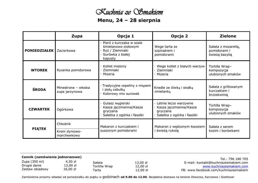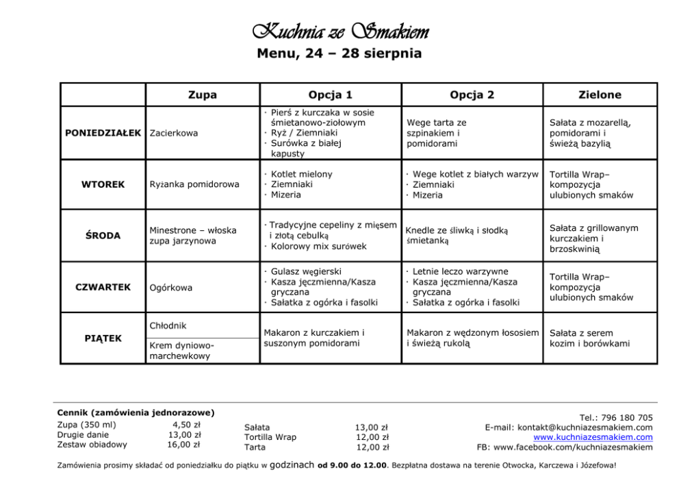 Kuchnia ze Smakiem Menu, 24 – 28 sierpnia Zupa PONIEDZIAŁEK Zacierkowa Opcja 1 Opcja 2 Zielone Pierś z kurczaka w sosie śmietanowo-ziołowym Ryż / Ziemniaki Surówka z białej kapusty Wege tarta ze szpinakiem i pomidorami Sałata z mozarellą, pomidorami i świeżą bazylią Wege kotlet z białych warzyw Ziemniaki Mizeria Tortilla Wrap– kompozycja ulubionych smaków WTOREK Ryżanka pomidorowa Kotlet mielony Ziemniaki Mizeria ŚRODA Minestrone – włoska zupa jarzynowa Tradycyjne cepeliny z mięsem Knedle ze śliwką i słodką i złotą cebulką śmietanką Kolorowy mix surówek Sałata z grillowanym kurczakiem i brzoskwinią Ogórkowa Gulasz węgierski Kasza jęczmienna/Kasza gryczana Sałatka z ogórka i fasolki Letnie leczo warzywne Kasza jęczmienna/Kasza gryczana Sałatka z ogórka i fasolki Tortilla Wrap– kompozycja ulubionych smaków Makaron z kurczakiem i suszonym pomidorami Makaron z wędzonym łososiem i świeżą rukolą Sałata z serem kozim i borówkami CZWARTEK Chłodnik PIĄTEK Krem dyniowomarchewkowy Cennik (zamówienia jednorazowe) Zupa (350 ml) Drugie danie Zestaw obiadowy 4,50 zł 13,00 zł 16,00 zł Sałata Tortilla Wrap Tarta Zamówienia prosimy składać od poniedziałku do piątku w 13,00 zł 12,00 zł 12,00 zł Tel.: 796 180 705 E-mail: [email protected] www.kuchniazesmakiem.com FB: www.facebook.com/kuchniazesmakiem godzinach od 9.00 do 12.00. Bezpłatna dostawa na terenie Otwocka, Karczewa i Józefowa! Kuchnia ze Smakiem Menu, 24 – 28 sierpnia Zupa PONIEDZIAŁEK Zacierkowa Opcja 1 Opcja 2 Zielone Pierś z kurczaka w sosie śmietanowo-ziołowym Ryż / Ziemniaki Surówka z białej kapusty Wege tarta ze szpinakiem i pomidorami Sałata z mozarellą, pomidorami i świeżą bazylią Wege kotlet z białych warzyw Ziemniaki Mizeria Tortilla Wrap– kompozycja ulubionych smaków WTOREK Ryżanka pomidorowa Kotlet mielony Ziemniaki Mizeria ŚRODA Minestrone – włoska zupa jarzynowa Tradycyjne cepeliny z mięsem Knedle ze śliwką i słodką i złotą cebulką śmietanką Kolorowy mix surówek Sałata z grillowanym kurczakiem i brzoskwinią Ogórkowa Gulasz węgierski Kasza jęczmienna/Kasza gryczana Sałatka z ogórka i fasolki Letnie leczo warzywne Kasza jęczmienna/Kasza gryczana Sałatka z ogórka i fasolki Tortilla Wrap– kompozycja ulubionych smaków Makaron z kurczakiem i suszonym pomidorami Makaron z wędzonym łososiem i świeżą rukolą Sałata z serem kozim i borówkami CZWARTEK Chłodnik PIĄTEK Krem dyniowomarchewkowy Cennik (zamówienia jednorazowe) Zupa (350 ml) Drugie danie Zestaw obiadowy 4,50 zł 13,00 zł 16,00 zł Sałata Tortilla Wrap Tarta Zamówienia prosimy składać od poniedziałku do piątku w 13,00 zł 12,00 zł 12,00 zł Tel.: 796 180 705 E-mail: [email protected] www.kuchniazesmakiem.com FB: www.facebook.com/kuchniazesmakiem godzinach od 9.00 do 12.00. Bezpłatna dostawa na terenie Otwocka, Karczewa i Józefowa!