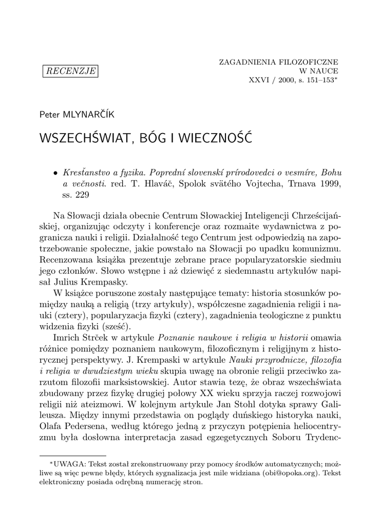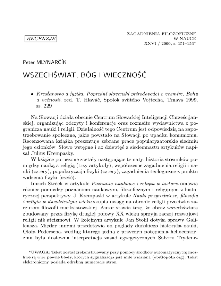 RECENZJE ZAGADNIENIA FILOZOFICZNE W NAUCE XXVI / 2000, s. 151–153∗ Peter MLYNARČÍK WSZECHŚWIAT, BÓG I WIECZNOŚĆ • Kresťanstvo a fyzika. Poprednı́ slovenskı́ prı́rodovedci o vesmı́re, Bohu a večnosti. red. T. Hlaváč, Spolok svätého Vojtecha, Trnava 1999, ss. 229 Na Słowacji działa obecnie Centrum Słowackiej Inteligencji Chrześcijańskiej, organizując odczyty i konferencje oraz rozmaite wydawnictwa z pogranicza nauki i religii. Działalność tego Centrum jest odpowiedzią na zapotrzebowanie społeczne, jakie powstało na Słowacji po upadku komunizmu. Recenzowana książka prezentuje zebrane prace popularyzatorskie siedmiu jego członków. Słowo wstępne i aż dziewięć z siedemnastu artykułów napisał Julius Krempasky. W książce poruszone zostały następujące tematy: historia stosunków pomiędzy nauką a religią (trzy artykuły), współczesne zagadnienia religii i nauki (cztery), popularyzacja fizyki (cztery), zagadnienia teologiczne z punktu widzenia fizyki (sześć). Imrich Strček w artykule Poznanie naukowe i religia w historii omawia różnice pomiędzy poznaniem naukowym, filozoficznym i religijnym z historycznej perspektywy. J. Krempaski w artykule Nauki przyrodnicze, filozofia i religia w dwudziestym wieku skupia uwagę na obronie religii przeciwko zarzutom filozofii marksistowskiej. Autor stawia tezę, że obraz wszechświata zbudowany przez fizykę drugiej połowy XX wieku sprzyja raczej rozwojowi religii niż ateizmowi. W kolejnym artykule Jan Stohl dotyka sprawy Galileusza. Między innymi przedstawia on poglądy duńskiego historyka nauki, Olafa Pedersena, według którego jedną z przyczyn potępienia heliocentryzmu była dosłowna interpretacja zasad egzegetycznych Soboru Trydenc∗ UWAGA: Tekst został zrekonstruowany przy pomocy środków automatycznych; możliwe są więc pewne błędy, których sygnalizacja jest mile widziana ([email protected]). Tekst elektroniczny posiada odrębną numerację stron. 2 Peter MLYNARČÍK kiego, natomiast poglądy Galileusza na egzegezę Pisma św. wyprzedziły swoją epokę. Współczesne zagadnienia religii i nauki rozpoczyna kolejny artykuł J. Krempaskiego. Dokonuje on klasyfikacji różnych poglądów na to zagadnienie. Jego klasyfikacja przypomina podejście I. Barboura, chociaż dokładniejsza analiza ukazuje także i różnice. Krempaski, omawiając problem teologii nauki, polemizuje z tezą M. Hellera, według którego „universum nauki jest tylko częścią universum teologii” (Communio 2(1982)). Należy jednak pamiętać, że według Hellera teologia nauki nie ma ambicji rozwiązywać zagadnienia nauk przyrodniczych, lecz jedynie rozpatruje nauki jako badające rzeczywistość, będącą częścią „świata zależnego od Stwórcy w swoim istnieniu”. I. Kapisinsky, z punktu widzenia zawodowego astronoma, rozważa zagadnienia dotyczące kosmologii, ewolucji i pseudonauki; omawia on m. in. problem skończoności wszechświata, jego ewolucji, problem śmierci cieplnej wszechświata i ewolucja życia. Autor ten przestrzega również teologów przed zbyt pochopnym wykorzystywaniem wyników nauk przyrodniczych. Chodzi o „białe plamy”, czyli o zagadnienia, o których współczesna nauka nie jest w stanie powiedzieć niczego pewnego. Dla teologów są one pokusą, ponieważ tłumacząc je działaniem Boga, tworzy się pseudowyjaśnienia. Tak powstały obrazy: Boga Zegarmistrza, Inżeniera, Programatora... — Boga luk poznawczych. Autor uważa za kluczowe pojęcie czasu, które inaczej jest pojmowane w kosmologii, filozofii i teologii. Esej E. Majernikovej rozwija temat wiary i nauki jako osobistego przeżycia naukowca. Za źródło inspiracji posłużyła autorce książka N. Motta „Can scientist believe?”. Droga naukowca do wiary bywa specyficzna, ponieważ naukowiec „dotyka” tajemnicy poznawania wszechświata. Nie jest to droga bez zakrętów czy przeszkód. Teologia posługuje się językiem obrazowym i używa analogii. Język ten jest zależny od kultury, w której teologia powstaje. Pięć artykułów, umieszczonych w recenzowanej książce, pióra J. Krempaskego, stanowi próbę wyrażenia prawd teologicznych za pomocą języka wzorowanego na języku fizyki. Próba taka jest dosyć ryzykowna, przypomina bowiem XVII–wieczne interpretacje, poszukujące w Biblii odpowiedników prawd fizycznych. Możliwości ingerencji Boga w świat fizyczny rozważa Krempaski w esejach: Fizyka i modlitwa oraz Zagadnienia dobra i zła z punktu widzenia fizyki. Odpowiedzią Krempaskiego na książki „Tao fizyki” Capry, i „Stworzenie wszechświata” WSZECHŚWIAT, BÓG I WIECZNOŚĆ 3 pióra Zang Zhi i Li Shu Xianp jest próba zbudowania „modelu Trójcy”. Autor wychodzi z założenia, że stworzenie nosi na sobie znamię Stwórcy. Przegląd treści omawianej książki wskazuje na to, że tematy interdyscyplinarne, a zwłaszcza tematy z pogranicza nauki i religii, są trudne do opracowania, ponieważ wymagają wiedzy z wielu różnych dziedzin. Dlatego recenzowana książka wymaga uważnej ale i krytycznej lektury. Książka ta świadczy niewątpliwie o wielkim zapotrzebowaniu na tego rodzaju pozycje na czytelniczym rynku słowackim. Peter Mlynarčı́k