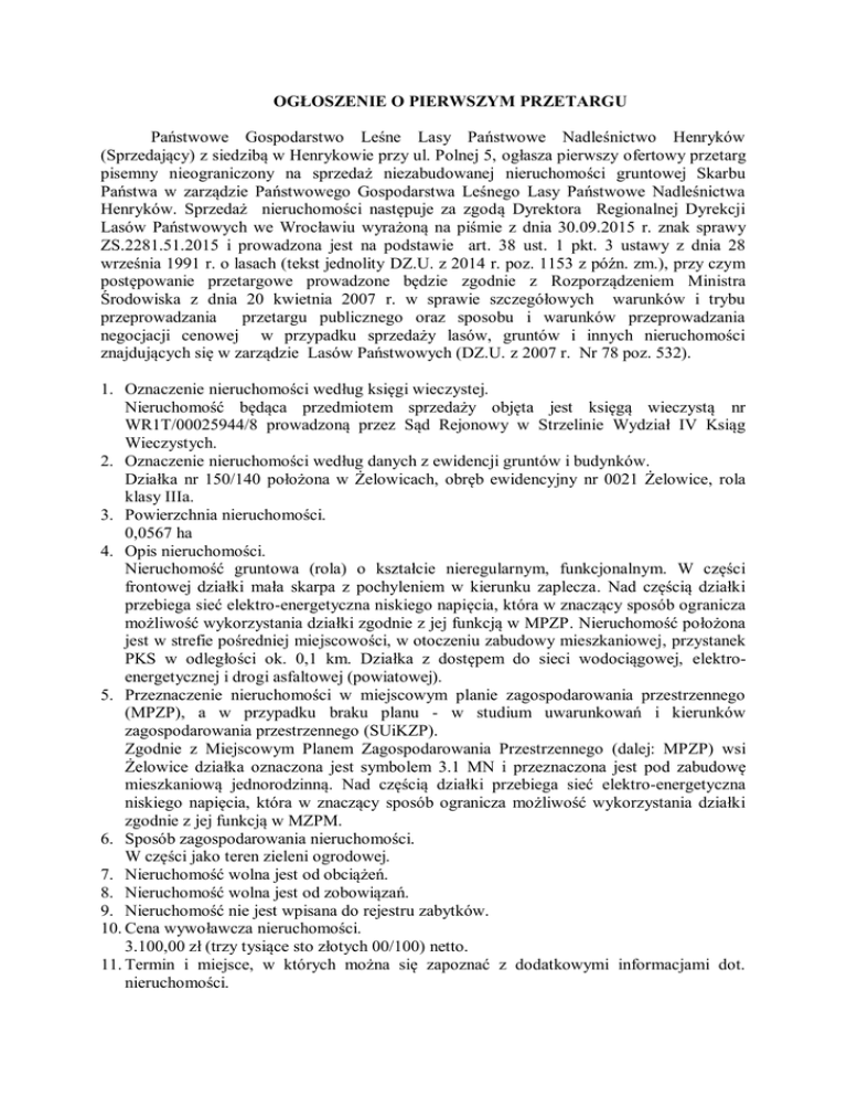 OGŁOSZENIE O PIERWSZYM PRZETARGU Państwowe Gospodarstwo Leśne Lasy Państwowe Nadleśnictwo Henryków (Sprzedający) z siedzibą w Henrykowie przy ul. Polnej 5, ogłasza pierwszy ofertowy przetarg pisemny nieograniczony na sprzedaż niezabudowanej nieruchomości gruntowej Skarbu Państwa w zarządzie Państwowego Gospodarstwa Leśnego Lasy Państwowe Nadleśnictwa Henryków. Sprzedaż nieruchomości następuje za zgodą Dyrektora Regionalnej Dyrekcji Lasów Państwowych we Wrocławiu wyrażoną na piśmie z dnia 30.09.2015 r. znak sprawy ZS.2281.51.2015 i prowadzona jest na podstawie art. 38 ust. 1 pkt. 3 ustawy z dnia 28 września 1991 r. o lasach (tekst jednolity DZ.U. z 2014 r. poz. 1153 z późn. zm.), przy czym postępowanie przetargowe prowadzone będzie zgodnie z Rozporządzeniem Ministra Środowiska z dnia 20 kwietnia 2007 r. w sprawie szczegółowych warunków i trybu przeprowadzania przetargu publicznego oraz sposobu i warunków przeprowadzania negocjacji cenowej w przypadku sprzedaży lasów, gruntów i innych nieruchomości znajdujących się w zarządzie Lasów Państwowych (DZ.U. z 2007 r. Nr 78 poz. 532). 1. Oznaczenie nieruchomości według księgi wieczystej. Nieruchomość będąca przedmiotem sprzedaży objęta jest księgą wieczystą nr WR1T/00025944/8 prowadzoną przez Sąd Rejonowy w Strzelinie Wydział IV Ksiąg Wieczystych. 2. Oznaczenie nieruchomości według danych z ewidencji gruntów i budynków. Działka nr 150/140 położona w Żelowicach, obręb ewidencyjny nr 0021 Żelowice, rola klasy IIIa. 3. Powierzchnia nieruchomości. 0,0567 ha 4. Opis nieruchomości. Nieruchomość gruntowa (rola) o kształcie nieregularnym, funkcjonalnym. W części frontowej działki mała skarpa z pochyleniem w kierunku zaplecza. Nad częścią działki przebiega sieć elektro-energetyczna niskiego napięcia, która w znaczący sposób ogranicza możliwość wykorzystania działki zgodnie z jej funkcją w MPZP. Nieruchomość położona jest w strefie pośredniej miejscowości, w otoczeniu zabudowy mieszkaniowej, przystanek PKS w odległości ok. 0,1 km. Działka z dostępem do sieci wodociągowej, elektroenergetycznej i drogi asfaltowej (powiatowej). 5. Przeznaczenie nieruchomości w miejscowym planie zagospodarowania przestrzennego (MPZP), a w przypadku braku planu - w studium uwarunkowań i kierunków zagospodarowania przestrzennego (SUiKZP). Zgodnie z Miejscowym Planem Zagospodarowania Przestrzennego (dalej: MPZP) wsi Żelowice działka oznaczona jest symbolem 3.1 MN i przeznaczona jest pod zabudowę mieszkaniową jednorodzinną. Nad częścią działki przebiega sieć elektro-energetyczna niskiego napięcia, która w znaczący sposób ogranicza możliwość wykorzystania działki zgodnie z jej funkcją w MZPM. 6. Sposób zagospodarowania nieruchomości. W części jako teren zieleni ogrodowej. 7. Nieruchomość wolna jest od obciążeń. 8. Nieruchomość wolna jest od zobowiązań. 9. Nieruchomość nie jest wpisana do rejestru zabytków. 10. Cena wywoławcza nieruchomości. 3.100,00 zł (trzy tysiące sto złotych 00/100) netto. 11. Termin i miejsce, w których można się zapoznać z dodatkowymi informacjami dot. nieruchomości. Do 27 kwietnia 2016 r. w godz. od 7 do 15. Nadleśnictwo Henryków, ul. Polna 5, 57-210 Henryków, Sekretariat Nadleśnictwa. 12. Termin i miejsce przetargu. 28 kwietnia 2016 r. Nadleśnictwo Henryków, ul. Polna 5, 57-210 Henryków. Otwarcie ofert nastąpi o godz. 1000 28 kwietnia 2016 r. w pokoju nr 7 Nadleśnictwa. 13. Wysokość wadium, jego forma, termin i miejsce wniesienia. Wysokość wadium – 310,00 zł. Wadium może być wnoszone w pieniądzu lub w formie gwarancji bankowej. Wadium należy wnieść do dnia 28 kwietnia 2016 r. do godz. 9 30. Wadium wnoszone w pieniądzu należy wpłacić w kasie Nadleśnictwa lub na konto bankowe Nadleśnictwa – BGŻ Oddział w Ząbkowicach Śląskich 85 2030 0045 1110 0000 0229 6020. 14. Termin i miejsce składania pisemnych ofert. Oferty należy złożyć w terminie do 28 kwietnia 2016 r. do godz. 930. w sekretariacie Nadleśnictwa Henryków, ul. Polna 5, 57-210 Henryków. Pisemna oferta powinna zostać złożona w zaklejonej kopercie z dopiskiem „Przetarg na sprzedaż działki nr 150/140, nie otwierać przed dniem 28 kwietnia 2016 r. godz. 1000 ”. W przypadku ofert składanych drogą pocztową decyduje data i godzina doręczenia oferty do Nadleśnictwa. 15. Pisemna oferta powinna zawierać: 1) imię, nazwisko i adres albo nazwę firmę, siedzibę i adres oferenta, 2) numery PESEL, NIP i REGON oferenta, o ile spoczywa na nim obowiązek ich uzyskania, 3) nr rachunku bankowego oferenta, 4) datę sporządzenia oferty, 5) oferowaną cenę netto (cena nie może być mniejsza lub równa cenie wywoławczej), 6) sposób zapłaty ceny, 7) sposób proponowanego wykorzystania nieruchomości, 8) oświadczenie, że oferent zapoznał się z warunkami przetargu i przyjmuje te warunki bez zastrzeżeń, 9) oświadczenie o wyrażeniu zgody na przetwarzanie danych osobowych na potrzeby przeprowadzonego przetargu, 10) dowód wniesienia wadium 11) aktualny odpis z rejestru przedsiębiorców KRS lub aktualny wydruk z Centralnej Ewidencji i Informacji o Działalności Gospodarczej prowadzonej przez Ministra Gospodarki – jeżeli oferentem jest podmiot wpisany do ww. rejestru, przy czym za aktualny odpis uważany będzie dokument wydany nie wcześniej niż na 3 miesiące przed datą składania oferty. 16. Elementy oferty, które będą miały wpływ na jej ocenę. a) cena, b) sposób zapłaty ceny, c) sposób wykorzystania nieruchomości. 17. Sposób oceny elementów oferty. a) odnośnie ceny - w zakresie kryterium ceny oferta może uzyskać maksymalnie 90 punktów. Ocena punktowa kryterium dokonana zostanie wg wzoru: cena ocenianej oferty C = --------------------------------------------------- x 90 najwyższa cena spośród złożonych ofert b) odnośnie sposobu zapłaty ceny – w zakresie kryterium sposobu zapła