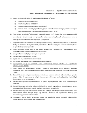 Załącznik nr 1 – Opis Przedmiotu Zamówienia będący jednocześnie Załącznikiem nr 2 do umowy nr DZP-362-50/2016 1. Łączna powierzchnia okien do mycia wynosi 29 358,86 m2 w tym: 1) okna zespolone – 23.872,12 m2 2) okna 4-skrzydłowe – 770,18 m2 3) okna z utrudnionym dostępem – 1.678,96 m2 4) okna do mycia metodą alpinistyczną (mycie jednostronne z zewnątrz, strona wewnątrz mycie tradycyjne lub z utrudnionym dostępem ) –3037,60 m2 2. Przez usługę umycia 1m² okna należy rozumieć umycie 1m² okna z obu stron, wewnętrznej i zewnętrznej ( dwustronne), a w przypadku okien czteroskrzydłowych czterostronne wraz z framugami wewnętrznymi i zewnętrznymi i parapetami. 3. Stopień trudności w wykonywaniu usługi jest zróżnicowany: w tym również, okna z utrudnionym dostępem oraz okna do mycia metodą alpinistyczną. Należy uwzględnić konieczność korzystania ze sprzętu do prac na wysokości. 4. Usługa obejmuje mycie okien z obu stron, wewnętrznej i zewnętrznej ( dwustronne), a w przypadku okien czteroskrzydłowych czterostronne. 5. Usługi wykonywane będą w czynnych budynkach. 6. Zleceniobiorca zobowiązany jest do: 1) zapoznania się z przedmiotem zamówienia, 2) utrzymania porządku w miejscu wykonywania zamówienia, 3) wykonywania usługi w godzinach pracy administracji danego obiektu po uzgodnieniu z kierownikiem obiektu 7. Usługi muszą być wykonywane zgodnie z należyta starannością, dobrą jakością, właściwą organizacją pracy oraz zachowaniem wymagań i obowiązujących przepisów, w szczególności bhp i p.poż. 8. Zleceniobiorca zobowiązany jest do zapewnienia we własnym zakresie odpowiedniego sprzętu oraz środków do wykonywania usługi. Stosowane środki muszą posiadać polskie atesty i być dopuszczone na rynku krajowym. 9. Zleceniobiorca ponosi odpowiedzialność za jakość wykonywanych usług oraz zastosowanych środków. 10. Zleceniobiorca ponosi pełną odpowiedzialność za szkody wyrządzone Zamawiającemu przez pracowników Wykonawcy w trakcie realizacji przedmiotu zamówienia. 11. Zleceniobiorca wystawi faktury VAT osobno dla każdego obiektu po każdym zakończeniu prac stanowiących całość danego Etapu wg Umowy. Podstawą do wystawienia faktury jest bezusterkowy protokół odbioru robót . 12. Pracownicy, którzy będą wykonywać prace na wysokości muszą posiadać odpowiednie uprawnienia do wykonywania prac na wysokości. 1 13. Zleceniobiorca zobowiązany jest w czasie wykonywania usług zapewnić na terenie objętym umową należyty ład, porządek, przestrzeganie przepisów BHP i ppoż. oraz ponosi odpowiedzialność za szkody powstałe z realizacją usług oraz w skutek innych działań osób zatrudnionych przez Wykonawcę. 14. Zleceniobiorca wykaże, że jest ubezpieczony od odpowiedzialności cywilnej w zakresie prowadzonej działalności. 15. Na podstawie art. 29 ust 4 (oraz w związku z art. 36 ust 2 pkt 9 lit d) ustawy Zleceniodawca wymaga zatrudnienia na podstawie umowy o pracę (pełny etat) przez Zleceniobiorcę lub podwykonawcę minimum (1) jednej osoby posiadającej uprawnienia opisane w pkt 16, wykonującej czynności w trakcie realizacji zamówienia na mycie okien <Uwaga: Zleceniobiorca jest zobowiązany przeznaczyć do realizacji zamówienia co najmniej 5 osób (1 kierownik grupy oraz 4 pracowników), w tym co najmniej 1 osoba zatrudniona na umowę o pracę – patrz również art. 4 § 3 ust. 3pkt 3 SIWZ>. 16. Osoba zatrudniona na podstawie umowy o pracę (pełny etat) przez Zleceniobiorcę lub podwykonawcę, o której mowa w pkt. 15 powinna posiadać jedne z niżej wymienionych uprawnień: - kierownik grupy, który będzie w czasie realizacji przedmiotu zamówienia, kierował i nadzorował wykonywanie usługi; - pracownik do przeprowadzania prac wysokościowych na elewacjach budynków UW posiadający aktualne badania lekarskie dopuszczające do pracy na wysokości powyżej 3 metrów oraz mający uprawnienia do wykonywania prac z wykorzystaniem technik alpinistycznych/w dostępie linowym (ukończony kurs/szkolenia z zakresu wykonywania prac z wykorzystaniem technik alpinistycznych/w dostępie linowym); - pracownik posiadający aktualne badania lekarskie dopuszczające do pracy na wysokości powyżej 1 m; Pozostałe wymagania, w szczególności uprawnienia Zleceniodawcy w zakresie kontroli spełniania przez Zleceniobiorcę wymagań, o których mowa w art. 29 ust. 4 ustawy, oraz sankcji z tytułu niespełniania tych wymagań są określone we wzorze umowy (Rozdział III SIWZ). 17. Zleceniobiorca zobowiązuje się, że wszelkie czynności wchodzące w zakres przedmiotu umowy wykonywane będą przez osoby wymienione w Wykazie osób (lub pod ich nadzorem w przypadku korzystania z usług podwykonawców), który stanowi załącznik nr 4 do niniejszej umowy. 18. Zleceniobiorca zobowiązuje się, że przez cały okres obowiązywania umowy zatrudni w pełnym wymiarze czasu pracy na podstawie umowy o pracę ….. pracowników < liczba zostanie wpisana na podstawie złożonej oferty>. 19. Nieprzestrzeganie przez Zleceniobiorcę ww. zapisu będzie potraktowane jako nienależyte wykonanie umowy, pod rygorem naliczenia kar umownych określonych § 9 ust.3 pkt 5 wzoru umowy ( Rozdział III). 20. Zleceniobiorca zobowiązuje się przekazać Zleceniodawcy, w terminie 5 dni od podpisania umowy, własne oświadczenie o stanie zatrudnienia wraz z zaświadczeniem z ZUS o ilości zatrudnionych osób. 21. Zleceniodawca uprawniony będzie do odstąpienia od umowy w przypadku braku doręczenia ww. wymienionych dokumentów we wskazanym terminie. 2