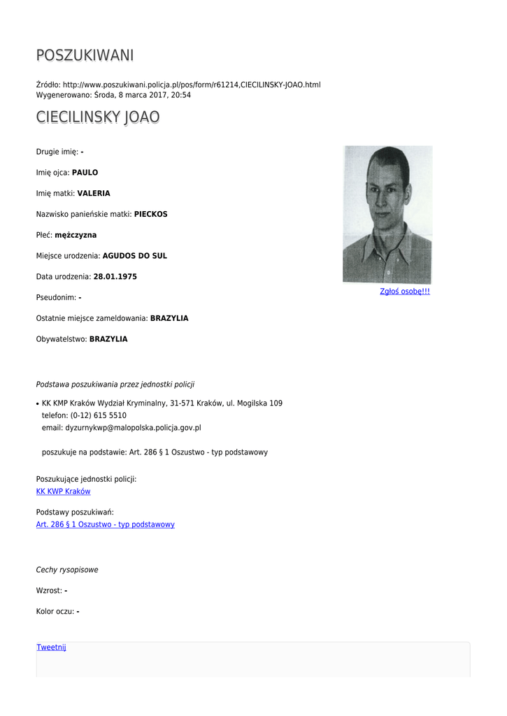 POSZUKIWANI Źródło: http://www.poszukiwani.policja.pl/pos/form/r61214,CIECILINSKY-JOAO.html Wygenerowano: Środa, 8 marca 2017, 20:54 CIECILINSKY JOAO Drugie imię: Imię ojca: PAULO Imię matki: VALERIA Nazwisko panieńskie matki: PIECKOS Płeć: mężczyzna Miejsce urodzenia: AGUDOS DO SUL Data urodzenia: 28.01.1975 Pseudonim: Ostatnie miejsce zameldowania: BRAZYLIA Obywatelstwo: BRAZYLIA Podstawa poszukiwania przez jednostki policji ● KK KMP Kraków Wydział Kryminalny, 31-571 Kraków, ul. Mogilska 109 telefon: (0-12) 615 5510 email: [email protected] poszukuje na podstawie: Art. 286 § 1 Oszustwo - typ podstawowy Poszukujące jednostki policji: KK KWP Kraków Podstawy poszukiwań: Art. 286 § 1 Oszustwo - typ podstawowy Cechy rysopisowe Wzrost: Kolor oczu: - Tweetnij Zgłoś osobę!!!