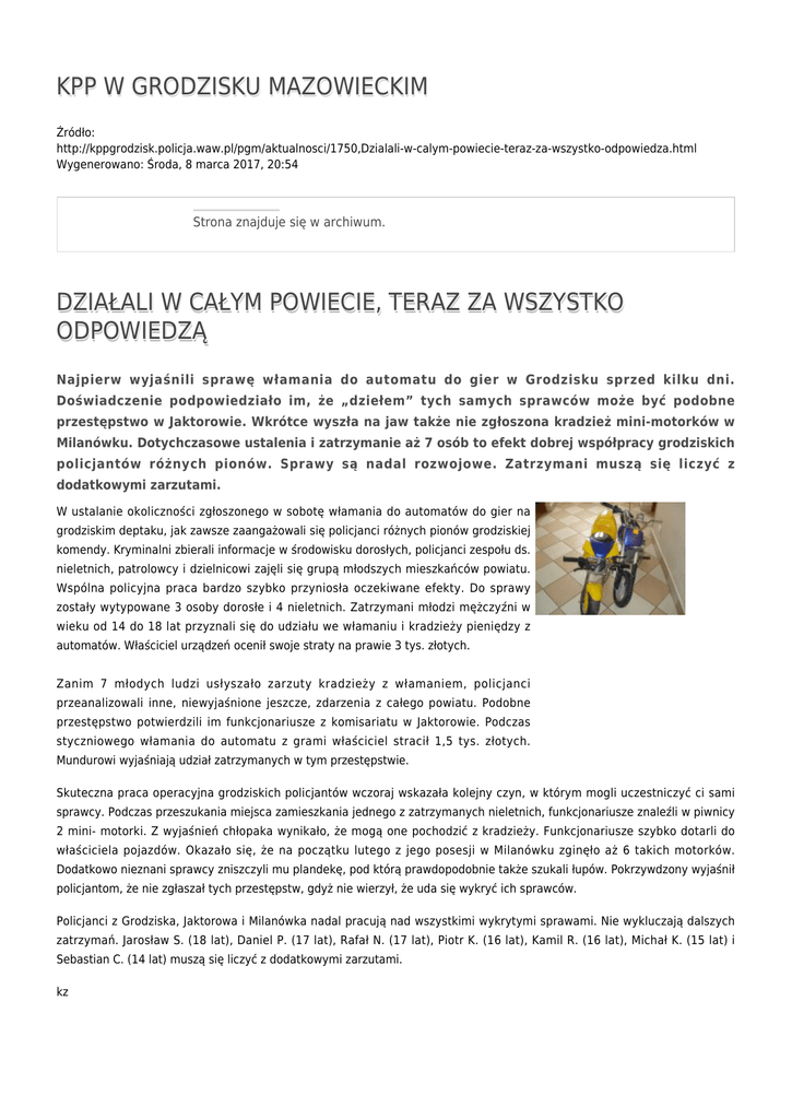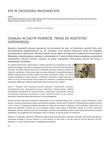 KPP W GRODZISKU MAZOWIECKIM Źródło: http://kppgrodzisk.policja.waw.pl/pgm/aktualnosci/1750,Dzialali-w-calym-powiecie-teraz-za-wszystko-odpowiedza.html Wygenerowano: Środa, 8 marca 2017, 20:54 Strona znajduje się w archiwum. DZIAŁALI W CAŁYM POWIECIE, TERAZ ZA WSZYSTKO ODPOWIEDZĄ Najpierw wyjaśnili sprawę włamania do automatu do gier w Grodzisku sprzed kilku dni. Doświadczenie podpowiedziało im, że „dziełem” tych samych sprawców może być podobne przestępstwo w Jaktorowie. Wkrótce wyszła na jaw także nie zgłoszona kradzież mini-motorków w Milanówku. Dotychczasowe ustalenia i zatrzymanie aż 7 osób to efekt dobrej współpracy grodziskich policjantów różnych pionów. Sprawy są nadal rozwojowe. Zatrzymani muszą się liczyć z dodatkowymi zarzutami. W ustalanie okoliczności zgłoszonego w sobotę włamania do automatów do gier na grodziskim deptaku, jak zawsze zaangażowali się policjanci różnych pionów grodziskiej komendy. Kryminalni zbierali informacje w środowisku dorosłych, policjanci zespołu ds. nieletnich, patrolowcy i dzielnicowi zajęli się grupą młodszych mieszkańców powiatu. Wspólna policyjna praca bardzo szybko przyniosła oczekiwane efekty. Do sprawy zostały wytypowane 3 osoby dorosłe i 4 nieletnich. Zatrzymani młodzi mężczyźni w wieku od 14 do 18 lat przyznali się do udziału we włamaniu i kradzieży pieniędzy z automatów. Właściciel urządzeń ocenił swoje straty na prawie 3 tys. złotych. Zanim 7 młodych ludzi usłyszało zarzuty kradzieży z włamaniem, policjanci przeanalizowali inne, niewyjaśnione jeszcze, zdarzenia z całego powiatu. Podobne przestępstwo potwierdzili im funkcjonariusze z komisariatu w Jaktorowie. Podczas styczniowego włamania do automatu z grami właściciel stracił 1,5 tys. złotych. Mundurowi wyjaśniają udział zatrzymanych w tym przestępstwie. Skuteczna praca operacyjna grodziskich policjantów wczoraj wskazała kolejny czyn, w którym mogli uczestniczyć ci sami sprawcy. Podczas przeszukania miejsca zamieszkania jednego z zatrzymanych nieletnich, funkcjonariusze znaleźli w piwnicy 2 mini- motorki. Z wyjaśnień chłopaka wynikało, że mogą one pochodzić z kradzieży. Funkcjonariusze szybko dotarli do właściciela pojazdów. Okazało się, że na początku lutego z jego posesji w Milanówku zginęło aż 6 takich motorków. Dodatkowo nieznani sprawcy zniszczyli mu plandekę, pod którą prawdopodobnie także szukali łupów. Pokrzywdzony wyjaśnił policjantom, że nie zgłaszał tych przestępstw, gdyż nie wierzył, że uda się wykryć ich sprawców. Policjanci z Grodziska, Jaktorowa i Milanówka nadal pracują nad wszystkimi wykrytymi sprawami. Nie wykluczają dalszych zatrzymań. Jarosław S. (18 lat), Daniel P. (17 lat), Rafał N. (17 lat), Piotr K. (16 lat), Kamil R. (16 lat), Michał K. (15 lat) i Sebastian C. (14 lat) muszą się liczyć z dodatkowymi zarzutami. kz Ocena: 0/5 (0) Tweetnij