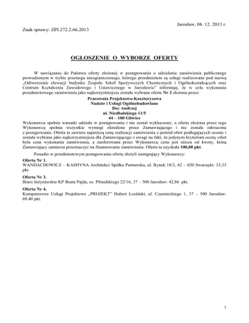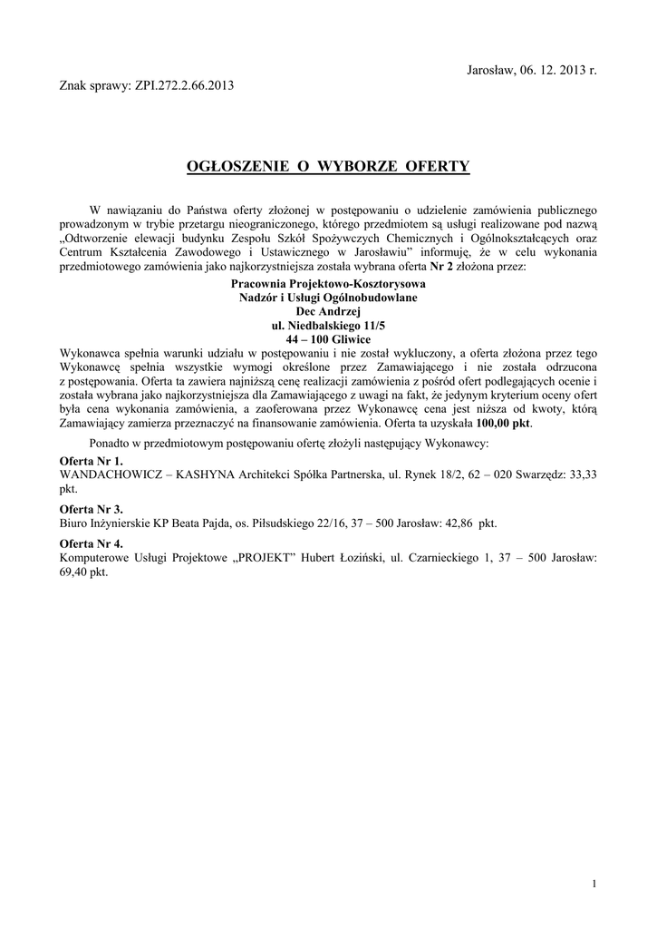 Jarosław, 06. 12. 2013 r. Znak sprawy: ZPI.272.2.66.2013 OGŁOSZENIE O WYBORZE OFERTY W nawiązaniu do Państwa oferty złożonej w postępowaniu o udzielenie zamówienia publicznego prowadzonym w trybie przetargu nieograniczonego, którego przedmiotem są usługi realizowane pod nazwą „Odtworzenie elewacji budynku Zespołu Szkół Spożywczych Chemicznych i Ogólnokształcących oraz Centrum Kształcenia Zawodowego i Ustawicznego w Jarosławiu” informuję, że w celu wykonania przedmiotowego zamówienia jako najkorzystniejsza została wybrana oferta Nr 2 złożona przez: Pracownia Projektowo-Kosztorysowa Nadzór i Usługi Ogólnobudowlane Dec Andrzej ul. Niedbalskiego 11/5 44 – 100 Gliwice Wykonawca spełnia warunki udziału w postępowaniu i nie został wykluczony, a oferta złożona przez tego Wykonawcę spełnia wszystkie wymogi określone przez Zamawiającego i nie została odrzucona z postępowania. Oferta ta zawiera najniższą cenę realizacji zamówienia z pośród ofert podlegających ocenie i została wybrana jako najkorzystniejsza dla Zamawiającego z uwagi na fakt, że jedynym kryterium oceny ofert była cena wykonania zamówienia, a zaoferowana przez Wykonawcę cena jest niższa od kwoty, którą Zamawiający zamierza przeznaczyć na finansowanie zamówienia. Oferta ta uzyskała 100,00 pkt. Ponadto w przedmiotowym postępowaniu ofertę złożyli następujący Wykonawcy: Oferta Nr 1. WANDACHOWICZ – KASHYNA Architekci Spółka Partnerska, ul. Rynek 18/2, 62 – 020 Swarzędz: 33,33 pkt. Oferta Nr 3. Biuro Inżynierskie KP Beata Pajda, os. Piłsudskiego 22/16, 37 – 500 Jarosław: 42,86 pkt. Oferta Nr 4. Komputerowe Usługi Projektowe „PROJEKT” Hubert Łoziński, ul. Czarnieckiego 1, 37 – 500 Jarosław: 69,40 pkt. 1