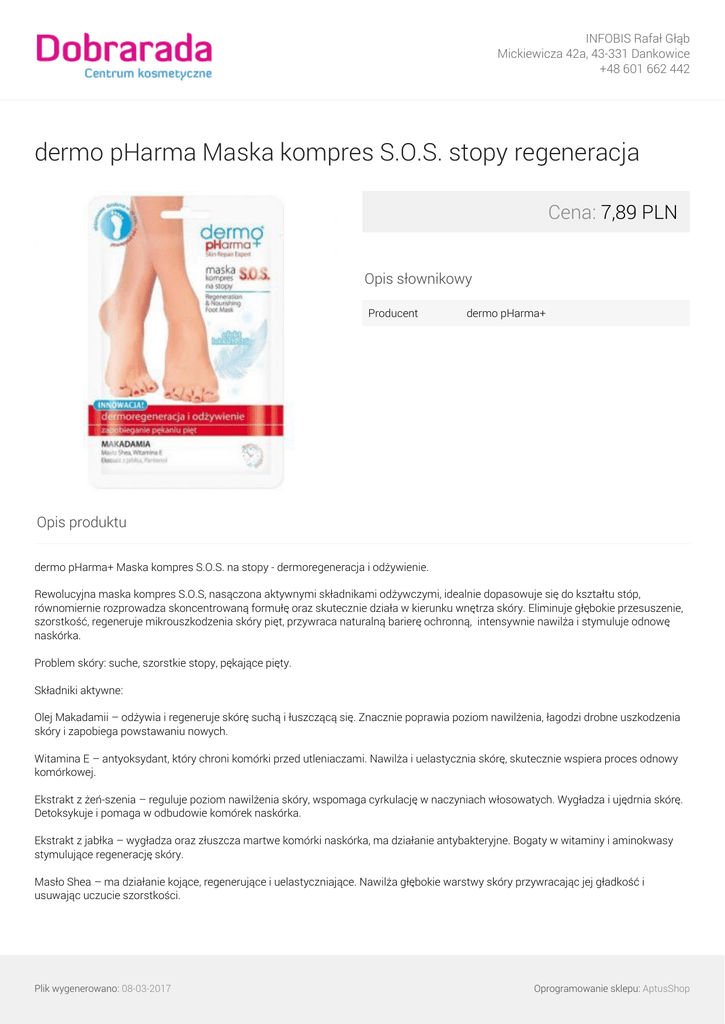 INFOBIS Rafał Głąb Mickiewicza 42a, 43-331 Dankowice +48 601 662 442 dermo pHarma Maska kompres S.O.S. stopy regeneracja Cena: 7,89 PLN Opis słownikowy Producent dermo pHarma+ Opis produktu dermo pHarma+ Maska kompres S.O.S. na stopy - dermoregeneracja i odżywienie. Rewolucyjna maska kompres S.O.S, nasączona aktywnymi składnikami odżywczymi, idealnie dopasowuje się do kształtu stóp, równomiernie rozprowadza skoncentrowaną formułę oraz skutecznie działa w kierunku wnętrza skóry. Eliminuje głębokie przesuszenie, szorstkość, regeneruje mikrouszkodzenia skóry pięt, przywraca naturalną barierę ochronną, intensywnie nawilża i stymuluje odnowę naskórka. Problem skóry: suche, szorstkie stopy, pękające pięty. Składniki aktywne: Olej Makadamii – odżywia i regeneruje skórę suchą i łuszczącą się. Znacznie poprawia poziom nawilżenia, łagodzi drobne uszkodzenia skóry i zapobiega powstawaniu nowych. Witamina E – antyoksydant, który chroni komórki przed utleniaczami. Nawilża i uelastycznia skórę, skutecznie wspiera proces odnowy komórkowej. Ekstrakt z żeń-szenia – reguluje poziom nawilżenia skóry, wspomaga cyrkulację w naczyniach włosowatych. Wygładza i ujędrnia skórę. Detoksykuje i pomaga w odbudowie komórek naskórka. Ekstrakt z jabłka – wygładza oraz złuszcza martwe komórki naskórka, ma działanie antybakteryjne. Bogaty w witaminy i aminokwasy stymulujące regenerację skóry. Masło Shea – ma działanie kojące, regenerujące i uelastyczniające. Nawilża głębokie warstwy skóry przywracając jej gładkość i usuwając uczucie szorstkości. Plik wygenerowano: 08-03-2017 Oprogramowanie sklepu: AptusShop INFOBIS Rafał Głąb Mickiewicza 42a, 43-331 Dankowice +48 601 662 442 Pantenol – działa regenerująco, stymuluje wzrost i odnowę komórek naskórka oraz skóry właściwej. Silnie nawilża i zmiękcza. Łagodzi podrażnienia, przyspiesza procesy gojenia. Rezultaty: - poprawa poziomu nawilżenia - redukcja szorstkości i suchości - odświeżenie i regeneracja Używaj maski regularnie aż do osiągnięcia oczekiwanego efektu. Profesjonalny zabieg na stopy do samodzielnego wykonania w domu. Produkt testowany dermatologicznie. Opakowanie zawiera 2 sztuki. Galeria Plik wygenerowano: 08-03-2017 Powered by TCPDF (www.tcpdf.org) Oprogramowanie sklepu: AptusShop