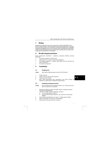 TRUST AMI MOUSE 150T OPTICAL WEB SCROLL 1 Wstęp Podręcznik ten przeznaczony jest dla użytkowników ‘TRUST AMI MOUSE 150T OPTICAL WEB SCROLL‘. Mysz ta pozwala na optymalną kontrolę ekranu. Operując kulą poruszasz się zarówno w osi poziomej, jak i pionowej. Możliwość ta szczególnie uprzyjemnia przeglądanie tych stron w internecie, które wychodzą poza ekran. Mysz można również wykorzystać jako manipulator kulkowy. Dzięki temu mysz wspaniale nadaje się do wykorzystania w notebookach. 2 Środki bezpieczeństwa Zanim rozpoczniesz korzystanie z urządzenia, przeczytaj dokładnie poniższe wskazówki: 1. Nie używaj urządzenia w pobliżu wody. 2. Uważaj, żeby nic nie stało na przewodzie zasilającym. 3. Nie ustawiaj urządzenia w miejscu, gdzie kabel może się zniszczyć lub zostać uszkodzony. 4. Nie naprawiaj urządzenia. 3 Instalacja 3.1 Podłączanie Uwaga: Mysz należy podłączyć jedynie do portu PS/2 komputera. 1. Wyłącz komputer. 2. Podłącz mysz do wejścia PS/2 komputera. 3. Włącz ponownie komputer. 4. Mysz działa bezpośrednio jako standardowa mysz PS/2. Przejdź do rozdziału 3.2, gdzie opisano instalację oprogramowania. P L 3.2 Instalacja oprogramowania Uwaga: Dysk CD-ROM został w przykładzie nazwany “D:\”, jednak może się to różnić w zależności od komputera. 1. Włóż dysk CD-ROM do napędu CD-ROM. Program instalacyjny zostanie uruchomiony automatycznie. Jeżeli to nie nastąpi, wykonaj następujące czynności. a) W menu Start wybierz ‘Uruchom’. b) Wpisz [D:\SETUP.EXE] i kliknij ‘OK’, aby uruchomić Trust Software Installer. 2. Pojawi się okno przedstawione na rysunku 1. Wybierz język instalacji. 3. Kliknij ‘AMI MOUSE 150T OPTICAL WEB SCROLL‘. 4. Zastosuj się do instrukcji podanych na ekranie. 1 PL TRUST AMI MOUSE 150T OPTICAL WEB SCROLL 5. 4 Po wykonaniu procedury oprogramowanie jest zainstalowane i nadaje się do użytku. Korzystanie z urządzenia 4.1 Mysz Kulkę myszy zmienia się w następujący sposób z kulki przeglądarki na manipulator kulkowy: 1. Przytrzymaj wciśnięty środkowy przycisk “E” (rysunek 2). 2. Naciśnij prawy przycisk myszy „B” (rysunek 2), aby przełączyć kulkę na funkcję manipulatora kulowego. 3. Puść teraz zarówno przycisk środkowy, jak i prawy myszy. 4. Kulka działa teraz jako manipulator kulkowy. Przy poruszaniu myszką w pionie lub poziomie, działa ona w funkcji przeglądarki. 5. Przytrzymaj przyciśnięty przycisk środkowy myszki “E” (rysunek 2). 6. Naciśnij lewy przycisk myszki “C” (rysunek 2), aby przełączyć kulę na funkcję przeglądarki. Opis wszystkich części znajduje się w tabeli poniżej. Poniższą tabelę należy czytać w powiązaniu z rysunkiem 2. Część składowa: Opis: Uwaga: A Kulka Może zostać wykorzystana jako przeglądarka zarówno w poziomie, jak i w pionie. Może zostać również wykorzystana jako manipulator kulkowy. B Prawy przycisk myszy Funkcja prawego przycisku myszy. C Lewy przycisk myszy Funkcja lewego przycisku myszy. D Obręcz Obręcz utrzymująca kulkę na miejscu. E Środkowy przycisk myszy Przycisk programowalny, jak również przycisk pomocniczy przy zmianie funkcji kulki z przeglądarki na manipulator kulkowy. Tabela 1: Części składowe 2 TRUST AMI MOUSE 150T OPTICAL WEB SCROLL 4.2 1. 2. 3. 4. Oprogramowanie Naciśnij ikonę myszki, która pojawiła się po lewej stronie na pasku zadań po instalacji oprogramowania. Pojawi się okno nazwane „właściwości myszki”. Zakładka ‘Scroll ball’. Patrz rysunek 3. Na tej zakładce można wprowadzić następujące ustawienia: • Wheel mode; wybierz tryb intelli mouse mode lub enhanced scroll mode • Verticale scroll instelling; wybierz ilość wierszy, które mają być przeglądane w pionie lub wybierz przeglądanie co jedną stronę. • Horizontale scroll instelling; wybierz ilość wierszy do przeglądania lub wybierz przeglądanie co jedną stronę. Istnieje również możliwość wyboru “use for application switch” lub “use for web site swicth”. Pierwsza opcja umożliwia przełączanie pomiędzy dwoma programami za pomocą przeglądania w poziomie, opcja druga umożliwia przeglądanie odwiedzonych stron internetowych. Zakładka Third Button. Patrz rysunek 4. W karcie tej można przypisać trzeciemu przyciskowi myszy specjalną funkcję; do wyboru z następujących możliwości: • Launch default- browser; opcja ta umożliwi uruchomienie standardowej przeglądarki internetowej przy naciśnięciu środkowego przycisku myszki. • Launch default-e-mail; opcja ta umożliwi uruchomienie standardowego programu poczty elektronicznej przy naciśnięciu środkowego przycisku myszki. • Office 97 document zoom; opcja ta nadaje środkowemu przyciskowi myszki funkcję szkła powiększającego w Office 97. • Shift lock; opcja ta umożliwia zablokowanie funkcji shift przy naciśnięciu środkowego przycisku myszki, przy ponownym naciśnięciu tego przycisku funkcja ta wraca do normy. • Zoom; dzięki tej funkcji można powiększać lub zmniejszać dowolne części ekranu. • Auto scroll; przy włączonej tej funkcji i po naciśnięciu środkowego przycisku myszki, poruszając myszką uruchomiona zostaje funkcja przeglądarki. Po ponownym naciśnięciu środkowego przycisku myszki funkcja ta zostaje wyłączona. • Other; opcja ta umożliwia przypisanie do środkowego przycisku myszki dowolnej funkcji z menu. Uwaga: Jeśli kulka wykorzystywana jest jako manipulator kulkowy, funkcję przeglądarki można również wyłączyć ustawiając ilość przeglądanych wierszy na zero w zakładce ‘scroll ball’. 3 P L PL TRUST AMI MOUSE 150T OPTICAL WEB SCROLL 5 Rozwiązywanie problemów Problem Przyczyna Możliwe rozwiązanie Mysz nie porusza się / porusza się ciężko. Mysz nie jest podłączona. Podłącz mysz do portu PS/2. Przy poruszaniu myszką wskaźnik na ekranie nie porusza się. Przy poruszaniu kulką, wskaźnik na ekranie nie porusza się. Funkcj