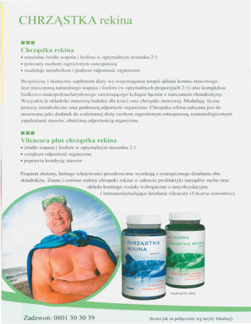 CHRZĄSTKA rekina ••• Chrząstka rekina i fosforu w optymalnym • naturalne źródło wapnia • polecany osobom • moduluje mctabolizm i podnosi Bezpieczny i skuteczny suplement Jcstmieszaniną zagrożonym naturalnego odporność procesy te składniki stanowią metaboliczne stosowana stawów, zawierającego budulec • źródło wapnia i fosforu • zwiększa odporność • poprawia kondycję Preparat złożony, składników. Znane proporcjach łącznie dla kości oraz chrząstki organizmu. diety osobom odpornością ••• Vilcacora plus chrząstka kolagen odporność do codziennej obniżoną terapii układu kostno-stawowego. i fosforu (w optymalnych oraz podnoszą jako dodatek zapaleniami 2:] organizmu diety we wspomaganiu wapnia białkowo-mukopolisacharydowego Wszystkie stosunku ostcoporozą stawowej. Chrząstka zagrożonym organizmu 2: I) oraz kompleksu z siarczanem chondroityny. Modulują rekina zalecana osteoporozą, liczne jest do reumatologicznymi . rekina w optymalnym stosunku 2: I organizmu stawów którego właściwości prozdrowotne i cenione walory chrząstki układu kostnego wynikają rekina w zakresie zostały i immunostymulujące z synergicznego profilaktyki wzbogacone działanie działania narządów obu ruchu oraz o antyoksydacyjne vilcacory (Uncaria lomenlosa).