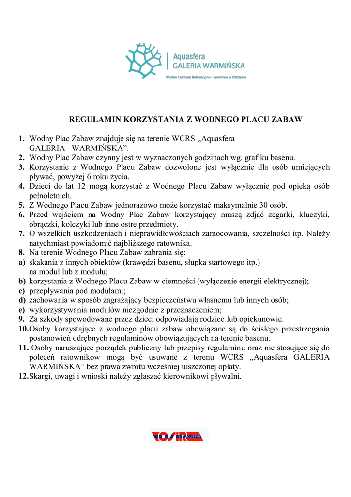 REGULAMIN KORZYSTANIA Z WODNEGO PLACU ZABAW 1. Wodny Plac Zabaw znajduje się na terenie WCRS „Aquasfera GALERIA WARMIŃSKA”. 2. Wodny Plac Zabaw czynny jest w wyznaczonych godzinach wg. grafiku basenu. 3. Korzystanie z Wodnego Placu Zabaw dozwolone jest wyłącznie dla osób umiejących pływać, powyżej 6 roku życia. 4. Dzieci do lat 12 mogą korzystać z Wodnego Placu Zabaw wyłącznie pod opieką osób pełnoletnich. 5. Z Wodnego Placu Zabaw jednorazowo może korzystać maksymalnie 30 osób. 6. Przed wejściem na Wodny Plac Zabaw korzystający muszą zdjąć zegarki, kluczyki, obrączki, kolczyki lub inne ostre przedmioty. 7. O wszelkich uszkodzeniach i nieprawidłowościach zamocowania, szczelności itp. Należy natychmiast powiadomić najbliższego ratownika. 8. Na terenie Wodnego Placu Zabaw zabrania się: a) skakania z innych obiektów (krawędzi basenu, słupka startowego itp.) na moduł lub z modułu; b) korzystania z Wodnego Placu Zabaw w ciemności (wyłączenie energii elektrycznej); c) przepływania pod modułami; d) zachowania w sposób zagrażający bezpieczeństwu własnemu lub innych osób; e) wykorzystywania modułów niezgodnie z przeznaczeniem; 9. Za szkody spowodowane przez dzieci odpowiadają rodzice lub opiekunowie. 10. Osoby korzystające z wodnego placu zabaw obowiązane są do ścisłego przestrzegania postanowień odrębnych regulaminów obowiązujących na terenie basenu. 11. Osoby naruszające porządek publiczny lub przepisy regulaminu oraz nie stosujące się do poleceń ratowników mogą być usuwane z terenu WCRS „Aquasfera GALERIA WARMIŃSKA” bez prawa zwrotu wcześniej uiszczonej opłaty. 12. Skargi, uwagi i wnioski należy zgłaszać kierownikowi pływalni.